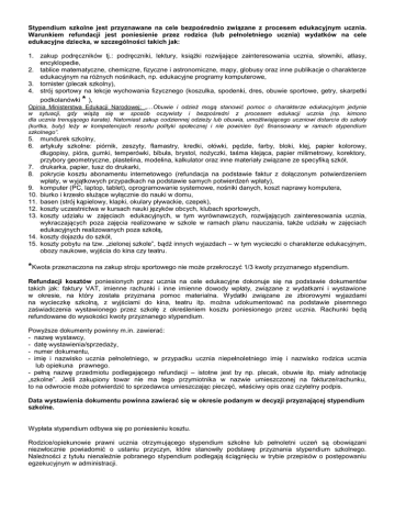 Stypendium szkolne jest przyznawane na cele bezpośrednio związane z procesem edukacyjnym ucznia. Warunkiem refundacji jest poniesienie przez rodzica (lub pełnoletniego ucznia) wydatków na cele edukacyjne dziecka, w szczególności takich jak: 1. zakup podręczników tj.: podręczniki, lektury, książki rozwijające zainteresowania ucznia, słowniki, atlasy, encyklopedie, 2. tablice matematyczne, chemiczne, fizyczne i astronomiczne, mapy, globusy oraz inne publikacje o charakterze edukacyjnym na różnych nośnikach, np. edukacyjne programy komputerowe, 3. tornister (plecak szkolny), 4. strój sportowy na lekcje wychowania fizycznego (koszulka, spodenki, dres, obuwie sportowe, getry, skarpetki podkolanówki * ), Opinia Ministerstwa Edukacji Narodowej: „…Obuwie i odzież mogą stanowić pomoc o charakterze edukacyjnym jedynie w sytuacji, gdy wiążą się w sposób oczywisty i bezpośredni z procesem edukacji ucznia (np. kimono dla ucznia trenującego karate). Natomiast zakup codziennej odzieży lub obuwia, umożliwiającego uczniowi dotarcie do szkoły (kurtka, buty) leży w kompetencjach resortu polityki społecznej i nie powinien być finansowany w ramach stypendium szkolnego”. 5. mundurek szkolny, 6. artykuły szkolne: piórnik, zeszyty, flamastry, kredki, ołówki, pędzle, farby, bloki, klej, papier kolorowy, długopisy, pióra, gumki, temperówki, bibuła, brystol, nożyczki, taśma klejąca, papier milimetrowy, korektory, przybory geometryczne, plastelina, modelina, kalkulator oraz inne materiały związane ze specyfiką szkół, 7. drukarka, papier, tusz do drukarki, 8. pokrycie kosztu abonamentu internetowego (refundacja na podstawie faktur z dołączonym potwierdzeniem wpłaty, w wyjątkowych przypadkach na podstawie samych potwierdzeń wpłaty), 9. komputer (PC, laptop, tablet), oprogramowanie systemowe, nośniki danych, koszt naprawy komputera, 10. biurko i krzesło służące wyłącznie do nauki w domu, 11. basen (strój kąpielowy, klapki, okulary pływackie, czepek), 12. koszty uczestnictwa w kursach nauki języków obcych, klubach sportowych, 13. koszty udziału w zajęciach edukacyjnych, w tym wyrównawczych, rozwijających zainteresowania ucznia, wykraczających poza zajęcia realizowane w szkole w ramach planu nauczania, także udziału w zajęciach edukacyjnych realizowanych poza szkołą, 14. koszty dojazdu do szkół, 15. koszty pobytu na tzw. „zielonej szkole”, bądź innych wyjazdach – w tym wycieczki o charakterze edukacyjnym, obozy naukowe, wyjścia do kina czy teatru. *Kwota przeznaczona na zakup stroju sportowego nie może przekroczyć 1/3 kwoty przyznanego stypendium. Refundacji kosztów poniesionych przez ucznia na cele edukacyjne dokonuje się na podstawie dokumentów takich jak: faktury VAT, imienne rachunki i inne imienne dowody wpłaty, związane z wydatkami i wystawione w okresie, na który została przyznana pomoc materialna. Wydatki związane ze zbiorowymi wyjazdami na wycieczkę szkolną, z wyjściami do kina, teatru itp. można udokumentować na podstawie pisemnego zaświadczenia wystawionego przez szkołę z określeniem kosztu poniesionego przez ucznia. Rachunki będą refundowane do wysokości kwoty przyznanego stypendium. Powyższe dokumenty powinny m.in. zawierać: - nazwę wystawcy, - datę wystawienia/sprzedaży, - numer dokumentu, - imię i nazwisko ucznia pełnoletniego, w przypadku ucznia niepełnoletniego imię i nazwisko rodzica ucznia lub opiekuna prawnego. - pełną nazwę przedmiotu podlegającego refundacji – istotne jest by np. plecak, obuwie itp. miały adnotację „szkolne”. Jeśli zakupiony towar nie ma tego przymiotnika w nazwie umieszczonej na fakturze/rachunku, to na odwrocie może potwierdzić to sprzedawca umieszczając pieczęć, właściwy opis oraz czytelny podpis. Data wystawienia dokumentu powinna zawierać się w okresie podanym w decyzji przyznającej stypendium szkolne. Wypłata stypendium odbywa się po poniesieniu kosztu. Rodzice/opiekunowie prawni ucznia otrzymującego stypendium szkolne lub pełnoletni uczeń są obowiązani niezwłocznie powiadomić o ustaniu przyczyn, które stanowiły podstawę przyznania stypendium szkolnego. Należności z tytułu nienależnie pobranego stypendium podlegają ściągnięciu w trybie przepisów o postępowaniu egzekucyjnym w administracji.