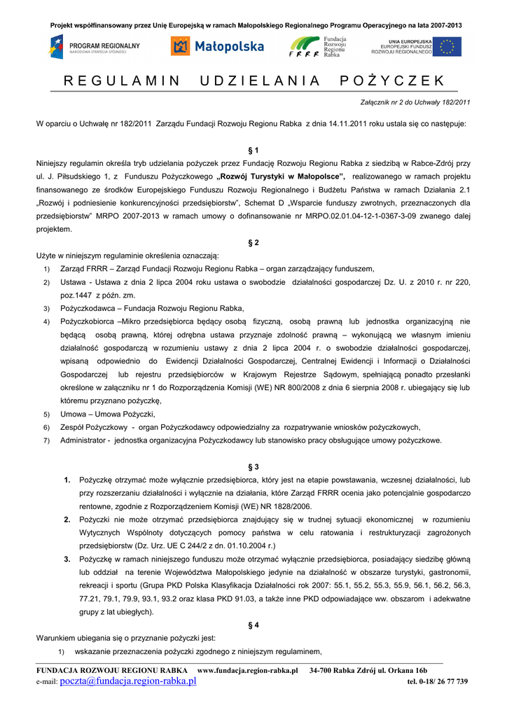 REGULAMIN UDZIELANIA POŻYCZEK Załącznik nr 2 do Uchwały 182/2011 W oparciu o Uchwałę nr 182/2011 Zarządu Fundacji Rozwoju Regionu Rabka z dnia 14.11.2011 roku ustala się co następuje: §1 Niniejszy regulamin określa tryb udzielania pożyczek przez Fundację Rozwoju Regionu Rabka z siedzibą w Rabce-Zdrój przy ul. J. Piłsudskiego 1, z Funduszu Pożyczkowego „Rozwój Turystyki w Małopolsce”, realizowanego w ramach projektu finansowanego ze środków Europejskiego Funduszu Rozwoju Regionalnego i Budżetu Państwa w ramach Działania 2.1 „Rozwój i podniesienie konkurencyjności przedsiębiorstw”, Schemat D „Wsparcie funduszy zwrotnych, przeznaczonych dla przedsiębiorstw” MRPO 2007-2013 w ramach umowy o dofinansowanie nr MRPO.02.01.04-12-1-0367-3-09 zwanego dalej projektem. §2 Użyte w niniejszym regulaminie określenia oznaczają: 1) Zarząd FRRR – Zarząd Fundacji Rozwoju Regionu Rabka – organ zarządzający funduszem, 2) Ustawa - Ustawa z dnia 2 lipca 2004 roku ustawa o swobodzie działalności gospodarczej Dz. U. z 2010 r. nr 220, poz.1447 z późn. zm. 3) Pożyczkodawca – Fundacja Rozwoju Regionu Rabka, 4) Pożyczkobiorca –Mikro przedsiębiorca będący osobą fizyczną, osobą prawną lub jednostka organizacyjną nie będącą osobą prawną, której odrębna ustawa przyznaje zdolność prawną – wykonującą we własnym imieniu działalność gospodarczą w rozumieniu ustawy z dnia 2 lipca 2004 r. o swobodzie działalności gospodarczej, wpisaną odpowiednio Gospodarczej do Ewidencji Działalności Gospodarczej, Centralnej Ewidencji i Informacji o Działalności lub rejestru przedsiębiorców w Krajowym Rejestrze Sądowym, spełniającą ponadto przesłanki określone w załączniku nr 1 do Rozporządzenia Komisji (WE) NR 800/2008 z dnia 6 sierpnia 2008 r. ubiegający się lub któremu przyznano pożyczkę, 5) Umowa – Umowa Pożyczki, 6) Zespół Pożyczkowy - organ Pożyczkodawcy odpowiedzialny za rozpatrywanie wniosków pożyczkowych, 7) Administrator - jednostka organizacyjna Pożyczkodawcy lub stanowisko pracy obsługujące umowy pożyczkowe. §3 1. Pożyczkę otrzymać może wyłącznie przedsiębiorca, który jest na etapie powstawania, wczesnej działalności, lub przy rozszerzaniu działalności i wyłącznie na działania, które Zarząd FRRR ocenia jako potencjalnie gospodarczo rentowne, zgodnie z Rozporządzeniem Komisji (WE) NR 1828/2006. 2. Pożyczki nie może otrzymać przedsiębiorca znajdujący się w trudnej sytuacji ekonomicznej w rozumieniu Wytycznych Wspólnoty dotyczących pomocy państwa w celu ratowania i restrukturyzacji zagrożonych przedsiębiorstw (Dz. Urz. UE C 244/2 z dn. 01.10.2004 r.) 3. Pożyczkę w ramach niniejszego funduszu może otrzymać wyłącznie przedsiębiorca, posiadający siedzibę główną lub oddział na terenie Województwa Małopolskiego jedynie na działalność w obszarze turystyki, gastronomii, rekreacji i sportu (Grupa PKD Polska Klasyfikacja Działalności rok 2007: 55.1, 55.2, 55.3, 55.9, 56.1, 56.2, 56.3, 77.21, 79.1, 79.9, 93.1, 93.2 oraz klasa PKD 91.03, a także inne PKD odpowiadające ww. obszarom i adekwatne grupy z lat ubiegłych). §4 Warunkiem ubiegania się o przyznanie pożyczki jest: 1) wskazanie przeznaczenia pożyczki zgodnego z niniejszym regulaminem, FUNDACJA ROZWOJU REGIONU RABKA www.fundacja.region-rabka.pl e-mail: [email protected] 34-700 Rabka Zdrój ul. Orkana 16b tel. 0-18/ 26 77 739 REGULAMIN UDZIELANIA POŻYCZEK 2) posiadanie zdolności spłaty pożyczki wraz z odsetkami w terminach i na warunkach określonych w umowie, 3) uzyskanie pozytywnej oceny wiarygodności określonej w niniejszym regulaminie, 4) uzyskanie pozytywnej oceny spłacalności zaciągniętych pożyczek i kredytów, 5) zadeklarowanie wniesienia wkładu własnego przez osobę ubiegającą się o pożyczkę, 6) akceptacja wzoru umowy pożyczki oraz innych warunków przyznania pożyczki. §5 1. Pożyczka może zostać przeznaczona wyłącznie na następujące cele: a) zakup zorganizowanej części przedsiębiorstwa, b) zakup nieruchomości, c) zakup maszyn i środków transportu, d) zakup materiałów produkcyjnych, e) budowę lub adaptację obiektów budowlanych, f) remont lub modernizację środków trwałych, g) zakup nowych technologii, patentów lub licencji, h) zakup oprogramowania, i) zakup i wytwarzanie środków trwałych, j) zakup usług, k) zakup środków obrotowych, l) pokrycie kosztów bieżących działalności. 2. Pożyczka nie może zostać przeznaczona na spłatę kredytów i innych pożyczek. 3. Pożyczka może zostać przeznaczona na cele określone w ust.1 pkt k) i l) pod warunkiem, że pożyczka udzielana jest przedsiębiorstwom na wczesnym etapie jako kapitał początkowy lub założeniowy lub na kolejnych etapach, kiedy jest ściśle powiązana z planem rozwoju przedsiębiorstwa. §6 Oceny wniosku pożyczkowego oraz wiarygodności pożyczkobiorcy dokonuje się na podstawie: 1) posiadanego kapitału, 2) zdolności do spłaty, 3) warunków pożyczkowych, 4) historii pożyczkowej, 5) oceny wskaźników ekonomicznych. §7 Zabezpieczenie pożyczki, bez względu na jej wysokość następuje z zastrzeżeniem § 8 w formie wskazanej przez Pożyczkodawcę. Zabezpieczenie uwzględnia rodzaj pożyczki, jej wysokość, ocenę ryzyka i jest dokonywane poprzez: 1) poręczenie wekslowe, 2) poręczenie funduszu poręczeń kredytowych, FUNDACJA ROZWOJU REGIONU RABKA www.fundacja.region-rabka.pl e-mail: [email protected] 34-700 Rabka Zdrój ul. Orkana 16b tel. 0-18/ 26 77 739 REGULAMIN UDZIELANIA 3) przewłaszczenie rzeczy na zabezpieczenie, 4) zastaw zwykły i zastaw rejestrowy, 5) hipotekę na nieruchomości, 6) przeniesienie własności nieruchomości z zastrzeżeniem warunku, 7) inne uzgodnione przez strony. POŻYCZEK §8 Poręczenie wekslowe jest zabezpieczeniem obligatoryjnym. §9 1. Minimalna wysokość wkładu własnego osoby ubiegającej się o pożyczkę wynosi 20 % wartości planowanego 