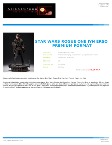Aliens Group ul. Lipowa 17C Inowrocław STAR WARS ROGUE ONE JYN ERSO PREMIUM FORMAT Producent: Sideshow Collectibles Dostępność: Produkt dostępny wyłącznie na specjalne zamówienie Wysokość: 20 cali (ok. 50,80 cm) Kategoria wiekowa: 18+ Dostępny od*: luty 2018 Status: Wkrótce Cena brutto: 2 750,00 PLN Sideshow Collectibles prezentuje kolekcjonerską statue Star Wars Rogue One Premium Format Figure Jyn Erso Sideshow Collectibles prezentuje kolekcjonerską statue Star Wars Rogue One Premium Format Figure Jyn Erso o wysokości 50 cm. Nowa postać w uniwersum Star Wars brytyjska aktorka Felicity Jones jako Jyn Erso. Ubrana w ponczo z kapturem, na szyi maska, respirator na biodrze, trzymająca karabin BlasTech A-180, pas z nabojami, tematyczna podstawa. Wszystko wyrzeżbione z najdrobniejszymi szczegółami filmowej postaci. Unikatowa pozycja. Na zamówienie. Wymagana przedpłata. http://www.aliensgroup.pl generator: aptusshop