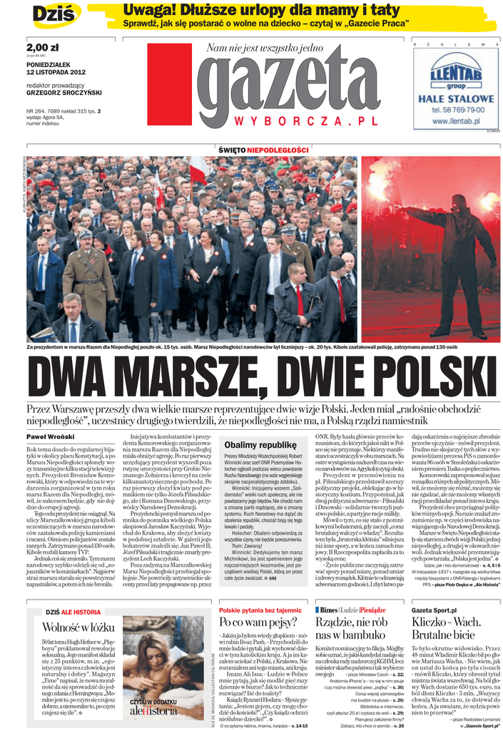 Dziś Uwaga! Dłuższe urlopy dla mamy i taty Sprawdź, jak się postarać o wolne na dziecko – czytaj w „Gazecie Praca” R Nam nie jest wszystko jedno 2,00 zł E K L A M A (w tym 8% VAT) PONIEDZIAŁEK 12 LISTOPADA 2012 redaktor prowadzący GRZEGORZ SROCZYŃSKI NR 264. 7689 nakład 315 tys. 2 wydaje Agora SA, numer indeksu 32189029 ŚWIĘTO NIEPODLEGŁOŚCI | KUBA ATYS, AGATA GRZYBOWSKA | Za prezydentem w marszu Razem dla Niepodległej poszło ok. 15 tys. osób. Marsz Niepodległości narodowców był liczniejszy – ok. 20 tys. Kibole zaatakowali policję, zatrzymano ponad 130 osób DWA MARSZE, DWIE POLSKI Przez Warszawę przeszły dwa wielkie marsze reprezentujące dwie wizje Polski. Jeden miał „radośnie obchodzić niepodległość”, uczestnicy drugiego twierdzili, że niepodległości nie ma, a Polską rządzi namiestnik Paweł Wroński Rok temu doszło do regularnej bijatyki w okolicy placu Konstytucji, a po Marszu Niepodległości spłonęły wozy transmisyjne kilku stacji telewizyjnych. Prezydent Bronisław Komorowski, który w odpowiedzi na te wydarzenia zorganizował w tym roku marsz Razem dla Niepodległej, mówił, że sukcesem będzie, gdy nie dojdzie do erupcji agresji. Tego celu prezydent nie osiągnął. Na ulicy Marszałkowskiej grupa kiboli uczestniczących w marszu narodowców zaatakowała policję kamieniami i racami. Ośmioro policjantów zostało rannych. Zatrzymano ponad 130 osób. Kibole rozbili kamerę TVP. Jednak coś się zmieniło. Tym razem narodowcy szybko odcięli się od „sojuszników w kominiarkach”. Najpierw straż marszu starała się powstrzymać napastników, a potem ich nie broniła. Inicjatywa kombatantów i prezydenta Komorowskiego zorganizowania marszu Razem dla Niepodległej miała obniżyć agresję. Po raz pierwszy urzędujący prezydent wyszedł poza rutynę uroczystości przy Grobie Nieznanego Żołnierza i kroczył na czele kilkunastotysięcznego pochodu. Po raz pierwszy złożył kwiaty pod pomnikiem nie tylko Józefa Piłsudskiego, ale i Romana Dmowskiego, przywódcy Narodowej Demokracji. Prezydencki pomysł marszu od pomnika do pomnika wielkiego Polaka skopiował Jarosław Kaczyński. Wyjechał do Krakowa, aby złożyć kwiaty w podobnej sztafecie. W galerii jego bohaterów znaleźli się: Jan Paweł II, Józef Piłsudski i tragicznie zmarły prezydent Lech Kaczyński. Poza zadymą na Marszałkowskiej Marsz Niepodległości przebiegał spokojnie. Nie powróciły antysemickie akcenty przed laty propagowane np. przez Obalimy republikę Prezes Młodzieży Wszechpolskiej Robert Winnicki oraz szef ONR Przemysław Holocher ogłosili podczas wiecu powstanie Ruchu Narodowego (na wzór węgierskiego skrajnie nacjonalistycznego Jobbiku). Winnicki: Inicjujemy wzorem „Solidarności” wielki ruch społeczny, ale nie powtarzamy jego błędów. Nie chodzi nam o zmianę partii rządzącej, ale o zmianę systemu. Ruch Narodowy ma dążyć do obalenia republiki, chociaż boją się tego lewaki i pedały. Holocher: Obaleni odpowiedzą za wszystkie czyny, nie będzie porozumienia. Tłum: Zawisną! Winnicki: Dedykujemy ten marsz Michnikowi, bo jest spełnieniem jego najczarniejszych koszmarów, jest początkiem wielkiej Polski, którą on przez całe życie zwalczał. GRE Polskie pytania bez tajemnic DZIŚ ALE HISTORIA Po co wam pejsy? 50 lat temu Hugh Hefner w„Playboyu” proklamował rewolucję seksualną. Jego manifest składał się z 25 punktów, m.in. „egoistyczny interes człowieka jest naturalny i dobry”. Magazyn „Time” napisał, że nowa moralność da się sprowadzić do jednego zdania zHemingwaya: „Moralne jest to, po czym się czujesz dobrze, aniemoralne to, po czym czujesz się źle”. CZYTAJ W DODATKU RUE DE ARCHIVES/COLLECTION CS/FORUM Wolność włóżku – Jakim ja byłem wtedy głupkiem – mówi rabin Boaz Pash. – Przychodzili do mnie ludzie ipytali, jak wychować dzieci w tym katolickim kraju. A ja im kazałem uciekać z Polski, z Krakowa. Nie rozumiałem ani tego miasta, ani kraju. Imam Ali Issa: – Ludzie w Polsce mnie pytają, jak się modlić pięć razy dziennie w biurze? Jak to technicznie rozwiązać? Iść do toalety? Ksiądz Ryszard Hodara: – Słyszę pytania: „Jestem gejem, czy mogę chodzić do kościoła?”. „Czy ksiądz ochrzci nieślubne dziecko?”. O co pytamy rabina, imama, księdza – s. 14-15 ONR. Były hasła głównie przeciw komunistom, do których jakoś nikt w Polsce się nie przyznaje. Niektórzy manifestanci uczestniczyli wobu marszach. Na ostre wystąpienia nadszedł czas na wiecu narodowców na Agrykoli (czytaj obok). Prezydent w przemówieniu na pl. Piłsudskiego przedstawił szerszy polityczny projekt, oblekając go w historyczny kostium. Przypominał, jak dwaj polityczni adwersarze – Piłsudski i Dmowski – solidarnie tworzyli państwo polskie, a partyjne racje milkły. Mówił o tym, co się stało z pomnikowymi bohaterami, gdy zaczęli „coraz brutalniej walczyć o władzę”. Rezultatem była „braterska kłótnia” silniejsza niż inne spory, a w końcu zamach majowy. II Rzeczpospolita zapłaciła za to wysoką cenę. – Życie publiczne zaczynają zatruwać spory ponad miarę, ponad umiar izdrowy rozsądek. Kłótnie te odmawiają adwersarzom godności. Izbyt łatwo pa- Biznes Ludzie Pieniądze dają oskarżenia o najcięższe zbrodnie przeciw ojczyźnie – mówił prezydent. Trudno nie skojarzyć tych słów z wypowiedziami prezesa PiS o zamordowaniu 96 osób w Smoleńsku i oskarżeniem premiera Tuska opoplecznictwo. Komorowski zaproponował sojusz rozsądku różnych sił politycznych. Mówił, że możemy się różnić, możemy się nie zgadzać, ale nie możemy własnych racji przedkładać ponad interes kraju. Prezydent chce przyciągnąć polityków różnych opcji. Na razie znalazł zrozumienie np. w części środowiska nawiązującego do Narodowej Demokracji. Marsze wŚwięto Niepodległości stały się starciem dwóch wizji Polski: jednej niep