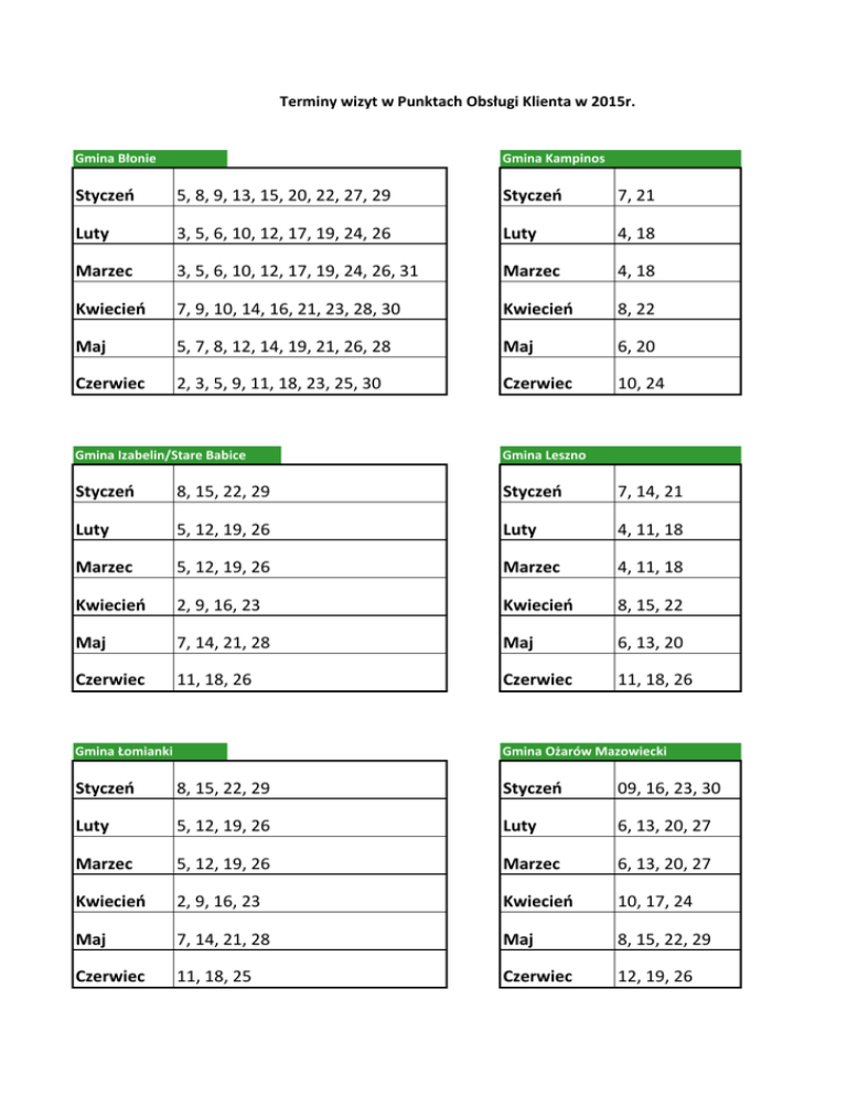 Terminy wizyt w Punktach Obsługi Klienta w 2015r. Gmina Błonie Gmina Kampinos Styczeń 5, 8, 9, 13, 15, 20, 22, 27, 29 Styczeń 7, 21 Luty 3, 5, 6, 10, 12, 17, 19, 24, 26 Luty 4, 18 Marzec 3, 5, 6, 10, 12, 17, 19, 24, 26, 31 Marzec 4, 18 Kwiecień 7, 9, 10, 14, 16, 21, 23, 28, 30 Kwiecień 8, 22 Maj 5, 7, 8, 12, 14, 19, 21, 26, 28 Maj 6, 20 Czerwiec 2, 3, 5, 9, 11, 18, 23, 25, 30 Czerwiec 10, 24 Gmina Izabelin/Stare Babice Gmina Leszno Styczeń 8, 15, 22, 29 Styczeń 7, 14, 21 Luty 5, 12, 19, 26 Luty 4, 11, 18 Marzec 5, 12, 19, 26 Marzec 4, 11, 18 Kwiecień 2, 9, 16, 23 Kwiecień 8, 15, 22 Maj 7, 14, 21, 28 Maj 6, 13, 20 Czerwiec 11, 18, 26 Czerwiec 11, 18, 26 Gmina Łomianki Gmina Ożarów Mazowiecki Styczeń 8, 15, 22, 29 Styczeń 09, 16, 23, 30 Luty 5, 12, 19, 26 Luty 6, 13, 20, 27 Marzec 5, 12, 19, 26 Marzec 6, 13, 20, 27 Kwiecień 2, 9, 16, 23 Kwiecień 10, 17, 24 Maj 7, 14, 21, 28 Maj 8, 15, 22, 29 Czerwiec 11, 18, 25 Czerwiec 12, 19, 26