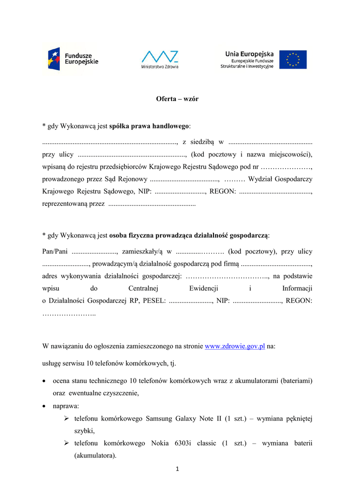 Oferta – wzór * gdy Wykonawcą jest spółka prawa handlowego: ..........................................................................., z siedzibą w ............................................... przy ulicy ............................................................, (kod pocztowy i nazwa miejscowości), wpisaną do rejestru przedsiębiorców Krajowego Rejestru Sądowego pod nr …………………, prowadzonego przez Sąd Rejonowy ......................................, ……… Wydział Gospodarczy Krajowego Rejestru Sądowego, NIP: ............................, REGON: ........................................, reprezentowaną przez ................................................. * gdy Wykonawcą jest osoba fizyczna prowadząca działalność gospodarczą: Pan/Pani ........................., zamieszkały/ą w ..............………. (kod pocztowy), przy ulicy .........................., prowadzącym/ą działalność gospodarczą pod firmą ......................................., adres wykonywania działalności gospodarczej: …………………………….., na podstawie wpisu do Centralnej Ewidencji i Informacji o Działalności Gospodarczej RP, PESEL: ........................, NIP: ..........................., REGON: ………………….. W nawiązaniu do ogłoszenia zamieszczonego na stronie www.zdrowie.gov.pl na: usługę serwisu 10 telefonów komórkowych, tj. ocena stanu technicznego 10 telefonów komórkowych wraz z akumulatorami (bateriami) oraz ewentualne czyszczenie, naprawa: telefonu komórkowego Samsung Galaxy Note II (1 szt.) – wymiana pękniętej szybki, telefonu komórkowego Nokia 6303i classic (1 szt.) – wymiana baterii (akumulatora). 1 Oświadczam, że spełniam wymagania określone w Szczegółowym opisie przedmiotu zamówienia (SOPZ) i deklaruję realizację przedmiotu zamówienia zgodnie z wymaganiami Zamawiającego, określonymi w SOPZ. Oferuję wykonanie przedmiotu zamówienia za całkowite wynagrodzenie, obejmujące wszystkie należności związane z wykonaniem przedmiotu zamówienia, które wynosi: ………………………………..brutto (słownie ………………….) ……………………………….. netto (słownie: …………………), oraz akceptuję termin związania ofertą, wynoszący 30 dni. (podpis i pieczątka Wykonawcy) (data, miejscowość) 2