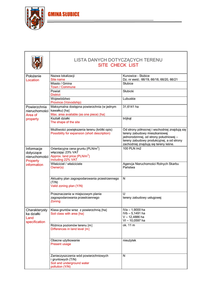 GMINA SŁUBICE LISTA DANYCH DOTYCZĄCYCH TERENU SITE CHECK LIST Położenie Location Nazwa lokalizacji Site name Miasto / Gmina Town / Commune Powiat District Województwo Province (Voivodship) Powierzchnia Maksymalna dostępna powierzchnia (w jednym nieruchomości kawałku) ha Max. area available (as one piece) ha Area of Kształt działki property The shape of the site Możliwości powiększenia terenu (krótki opis) Possibility for expansion (short description) Informacje dotyczące nieruchomości Property information Orientacyjna cena gruntu PLN/m2 włączając 23% VAT Approx. land price PLN/m 2 including 22% VAT Właściciel / właściciele Owner(s) Kunowice - Słubice Dz. nr ewid.: 66/19, 66/18, 66/20, 66/21 Słubice Słubicki Lubuskie 31,6141 ha trójkąt Od strony północnej i wschodniej znajdują się tereny zabudowy mieszkaniowej jednorodzinnej, od strony południowej – tereny zabudowy produkcyjnej, a od strony zachodniej znajdują się tereny leśne. 100 PLN /m2 Agencja Nieruchomości Rolnych Skarbu Państwa Aktualny plan zagospodarowania przestrzennego (T/N) Valid zoning plan (Y/N) N Przeznaczenie w miejscowym planie zagospodarowania przestrzennego Zoning U tereny zabudowy usługowej Charakterysty Klasa gruntów wraz z powierzchnią ha Soil class with area ha ka działki Land specification Różnica poziomów terenu m Differences in land level m IVa – 1,9000 ha IVb – 5,1491 ha V – 12,4886 ha VI – 10,0597 ha ok. 11 m Obecne użytkowanie Present usage nieużytek Zanieczyszczenia wód powierzchniowych i gruntowych (T/N) Soil and underground water pollution (Y/N) N Połączenia transportowe Transport links Istniejąca infrastruktura Existing infrastructure Poziom wód gruntowych m Underground water level m -- Czy były prowadzone badania geologiczne terenu (T/N) Were geological research done (Y/N) N Ryzyko wystąpienia zalań lub obsunięć terenu (T/N) Risk of flooding or land slide (Y/N) N Przeszkody podziemne (T/N) Underground obstacles (Y/N) N Przeszkody występujące na powierzchni terenu (T/N) Ground and overhead obstacles (Y/N) N Istniejące ograniczenia ekologiczne (T/N) Ecological restrictions (Y/N) N Budynki i zabudowania na terenie (T/N) Buildings / other constructions on site (Y/N) N Droga dojazdowa do terenu (rodzaj drogi i jej szerokość) Access road to the plot (type and width of access road) Autostrada / droga krajowa km Nearest motorway / national road km Droga wojewódzka nr 137 (droga wojewódzka; szerokość jezdni: 7,00 ÷ 6,50 m) Teren zlokalizowany bezpośrednio przy drodze wojewódzkiej nr 137 Autostrada A2 w odległości ok. 3 km Porty rzeczne i morskie w odległości do 200 km Sea and river ports located up to 200 km ok. 5 km Kolej km Railway line km Teren zlokalizowany jest bezpośrednio przy linii kolejowej relacji Berlin - Moskwa Bocznica kolejowa km Railway siding km ok. 1 km Najbliższe lotnisko międzynarodowe km Nearest international airport km Berlin – 100 km Najbliższe miasto wojewódzkie km Nearest province capital km Gorzów Wlkp. – 80 km Zielona Góra – 80 km Elektryczność na terenie (T/N) Electricity (Y/N) N Odległość przyłącza od granicy terenu Connection point (distance from boundary) m Napięcie Voltage kV 50 – 100 m -- Dostępna moc Available capacity MW Gaz na terenie (T/N) Gas (Y/N) -- N Odległość przyłącza od granicy działki Connection point (distance from boundary) m Wartość kaloryczna Calorific value MJ/Nm3 50 – 100 m Średnica rury Pipe diameter mm -- Dostępna objętość 3 Available capacity Nm /h -- Woda na terenie (T/N) Water supply (Y/N) Odległość przyłącza od granicy terenu Connection point (distance from boundary) m Dostępna objętość Available capacity m 3/24h Kanalizacja na terenie (T/N) Sewage discharge (Y/N) Odległość przyłącza od granicy terenu Connection point (distance from boundary) m Dostępna objętość Available capacity m3/24h Oczyszczalnia ścieków na terenie bądź w bezpośrednim sąsiedztwie Treatment plant (Y/N) Telefony (T/N) Telephone (Y/N) Odległość przyłącza od granicy terenu Connection point (distance from boundary) m -- N 50 – 100 m -- N 50 – 100 m -- N N 50 – 100 m Uwagi Comments Osoba przygotowując a ofertę Offer prepared by Osoby do kontaktu Contact person Imię, nazwisko, stanowisko, tel., tel. komórkowy, e-mail, znajomość języków obcych Tomasz Horbacz, naczelnik WGN, tel. 502 232 754, e-mail: [email protected] Imię, nazwisko, stanowisko, tel., tel. komórkowy, e-mail, znajomość języków obcych Joanna Pyrgiel, współpraca zagraniczna, tel. 693 423 777, e-mail: [email protected] – język niemiecki