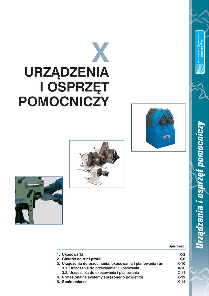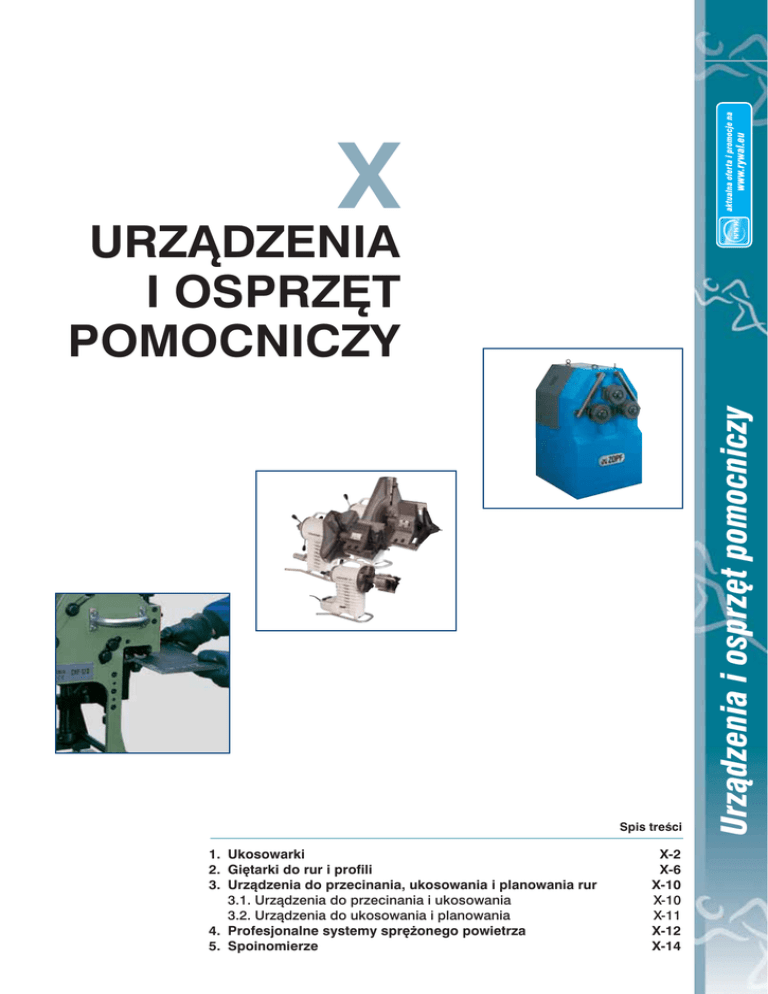 X Spis treści 1. Ukosowarki 2. Giętarki do rur i profili 3. Urządzenia do przecinania, ukosowania i planowania rur 3.1. Urządzenia do przecinania i ukosowania 3.2. Urządzenia do ukosowania i planowania 4. Profesjonalne systemy sprężonego powietrza 5. Spoinomierze X-2 X-6 X-10 X-10 X-11 X-12 X-14 Urządzenia i osprzęt pomocniczy URZĄDZENIA I OSPRZĘT POMOCNICZY 1. UKOSOWARKI UMÓW SIĘ NA BEZPŁATNY POKAZ W TWOJEJ FIRMIE SKONTAKT UJ SI Z NAJBLIŻSZ Ę YM ODDZIAŁEM Urządzenie ukosuje blachy o grubości do 16 mm i wytrzymałości na rozciąganie Rm = 392 MPa z prędkością 1,8 m/min na szerokość 6 mm. Podczas użytkowania urządzenia nie jest konieczne stosowanie ochronników słuchu, ponieważ poziom hałasu nigdy nie przekracza 70 dB. Ukosowarka CHP-6 CHARAKTERYSTYKA • Moc urządzenia 0,5 kW • Panel sterowania, przełącznik kierunku i wyłącznik bezpieczeństwa • Maksymalna, jednorazowa zdolność ukosowania materiału o wytrzymałości na rozciąganie Rm = 392 MPa 6 mm • Minimalna grubość ukosowanej blachy 3 mm • Maksymalna grubość ukosowanej blachy 16 mm • Szybkość ukosowania na minutę 1,8 m • Minimalna średnica rur ø 100 mm • Masa własna urządzenia 34 kg Numer katalogowy: 94 60 000006 Urządzenia i osprzęt pomocniczy Maksymalna szerokość ukosowania podczas pojedynczego przejścia wynosi W=6 mm dla materiału o wytrzymałości na rozciąganie Rm= 392 MPa. Jeżeli obrabiany materiał posiada większą wytrzymałość na rozciąganie Rm, zdolność ukosowania maleje. X-2 Aby uzyskać większą szerokość ukosowania w wytrzymalszym materiale można zastosować ukosowanie w dwóch przejściach. Pierwsze powinno stanowić 2/3 wymaganej wartości. Wytrzymałość na rozciąganie Rm jest podana w ateście fabrycznym obrabianej stali. Należy wziąć pod uwagę, że krawędzie blachy po cięciu gazowym zazwyczaj posiadają większą wytrzymałość ze względu na proces odgrzewania i schładzania. Do większego ukosowania zaleca się stosowanie urządzenia CHP-12, CHP-12 G lub CHP-21G. W przypadku nie zastosowania się do powyższych uwag elementy napędu oraz frez mogą ulec uszkodzeniu bądź przedwczesnemu zużyciu. Ukosuje rury Ukosuje małe elementy różnych kształtów TABELA JEDNORAZOWEGO UKOSOWANIA STAL WĘGLOWA Max Rm 392 MPa Max Rm 490 MPa Max Rm 588 MPa α w [mm] d [mm] W [mm] d [mm] W [mm] d [mm] 22,5° 6 5,5 5 4,5 4 3,5 30° 6 5 5 4,5 4 3,5 35° 6 5 5 4 4 3 37,5° 6 4,5 5 4 4 3 45° 6 4 5 3,5 4 2,5 STAL NIERDZEWNA / STOPOWA Max Rm 490 MPa Max Rm 588 MPa Max Rm 686 MPa α W [mm] d [mm] W [mm] d [mm] W [mm] d [mm] 22,5° 3 2,5 2,5 2 2 1,8 30° 3 2,5 2,5 2 2 1,5 35° 3 2,5 2,5 2 2 1,5 37,5° 3 2 2,5 2 2 1,5 45° 3 2 2,5 1,5 2 1,5 1. Ukosowarki © Rywal RHC – Wszelkie prawa zastrzeżone. ISO 9001 Ukosowarka CHP-12 Urządzenie ukosuje blachy o grubości do 40 mm i wytrzymałości na rozciąganie Rm = 392 MPa z prędkością 2,6 m/min na szerokość 12 mm. Podczas użytkowania urządzenia nie jest konieczne stosowanie ochronników słuchu, ponieważ poziom hałasu nigdy nie przekracza 70 dB. UMÓW SIĘ NA BEZPŁATNY POKAZ W TWOJEJ FIRMIE SKONTAKT UJ SI Z NAJBLIŻSZ Ę YM ODDZIAŁEM CHARAKTERYSTYKA • Moc urządzenia 2,3 kW • Panel sterowania, przełącznik kierunku i wyłącznik bezpieczeństwa • Maksymalna, jednorazowa zdolność ukosowania materiału o wytrzymałości na rozciąganie Rm = 392 MPa 12 mm • Minimalna grubość ukosowanej blachy 6 mm • Maksymalna grubość ukosowanej blachy 40 mm • Szybkość ukosowania na minutę 2,6 m • Minimalna średnica rur ø100 mm • Masa własna urządzenia 65 kg Maksymalna szerokość ukosowania podczas pojedynczego przejścia wynosi W =12 mm dla materiału o wytrzymałości na rozciąganie Rm = 392 MPa. Jeżeli obrabiany materiał posiada większą wytrzymałość na rozciąganie Rm, zdolność ukosowania maleje. Aby uzyskać większą szerokość ukosowania w wytrzymalszym materiale można zastosować ukosowanie w dwóch przejściach. Pierwsze powinno stanowić 2/3 wymaganej wartości. Wytrzymałość na rozciąganie Rm jest podana w ateście fabrycznym obrabianej stali. Należy wziąć pod uwagę, że krawędzie blachy po cięciu gazowym zazwyczaj posiadają większą wytrzymałość ze względu na proces podgrzewania i schładzania. Do większego ukosowania zaleca się stosowanie urządzenia CHP-21G. W przypadku nie stosowania się do powyższych uwag elementy napędu oraz frez mogą ulec uszkodzeniu lub przedwczesnemu zużyciu. Ukosuje duże elementy różnych kształtów poruszając się na wózku jezdnym CA-12 (opcja) Model dostępny również w wersji CHP 12 INV do ukosowania w pozycji odwróconej TABELA JEDNORAZOWEGO UKOSOWANIA STAL WĘGLOWA Max Rm 392 MPa Max Rm 490 MPa Max Rm 588 MPa α w [mm] d [mm] w [mm] d [mm] w [mm] d [mm] 22,5° 12 11 10 9 8 7,5 30° 12 10 10 8,5 8 7 35° 12 9,5 10 8 8 6,5 37,5° 12 9 10 7,5 8 6 45° 12 8,5 10 7 8 5,5 STAL NIERDZEWNA / STOPOWA Max Rm 490 MPa Max Rm 588 MPa Max Rm 686 MPa α w [mm] d [mm] w [mm] d [mm] w [mm] d [mm] 22,5° 6 5,5 5 4,5 4,2 3,8 30° 6 5 5 4,3 4,2 3,6 35° 6 5 5 4 4,2 3,5 37,5° 6 4,5 5 4 4,2 3,3 45° 6 4 5 3,5 4,2 3 © Rywal RHC – Wszelkie prawa zastrzeżone. 1. Ukosowarki Urządzenia i osprzęt pomocniczy Numer katalogowy: 94 60 000012 X-3 UMÓW SIĘ NA BEZPŁATNY POKAZ W TWOJEJ FIRMIE SKONTAKT UJ SI Z NAJBLIŻSZ Ę YM ODDZIAŁEM Ukosowarka CHP-12 G Urządzenie ukosuje blachy o grubości do 40 mm i wytrzymałości na rozciąganie Rm=392 MPa z prędkością 2,8 m/min na szerokość 12 mm. Podczas użytkowania urządzenia nie jest konieczne stosowanie ochronników słuchu, ponieważ poziom hałasu nigdy nie przekracza 70 dB. Model CHP-12 G posiada płynną regulację kąta ukosowania. Dostępny również w wersji CHP-12 G REV do ukosowania w pozycji odwróconej. CHARAKTERYSTYKA • Moc urządzenia 2,3 kW • Panel sterowania, przełącznik kierunku i wyłącznik bezpieczeństwa • Maksymalna, jednorazowa zdolność uko