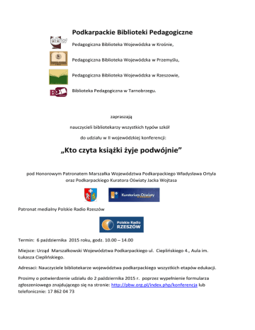 Podkarpackie Biblioteki Pedagogiczne Pedagogiczna Biblioteka Wojewódzka w Krośnie, Pedagogiczna Biblioteka Wojewódzka w Przemyślu, Pedagogiczna Biblioteka Wojewódzka w Rzeszowie, Biblioteka Pedagogiczna w Tarnobrzegu. zapraszają nauczycieli bibliotekarzy wszystkich typów szkół do udziału w II wojewódzkiej konferencji: „Kto czyta książki żyje podwójnie” pod Honorowym Patronatem Marszałka Województwa Podkarpackiego Władysława Ortyla oraz Podkarpackiego Kuratora Oświaty Jacka Wojtasa Patronat medialny Polskie Radio Rzeszów Termin: 6 października 2015 roku, godz. 10.00 – 14.00 Miejsce: Urząd Marszałkowski Województwa Podkarpackiego ul. Cieplińskiego 4., Aula im. Łukasza Cieplińskiego. Adresaci: Nauczyciele bibliotekarze województwa podkarpackiego wszystkich etapów edukacji. Prosimy o potwierdzenie udziału do 2 października 2015 r. poprzez wypełnienie formularza zgłoszeniowego znajdującego się na stronie: http://pbw.org.pl/index.php/konferencja lub telefonicznie: 17 862 04 73 PROGRAM KONFERENCJI 9.00 - 10.00 Rejestracja 10.00. – 10.15 Powitanie 10.15 – 11.00 Dlaczego bohater książki żyje w naszej głowie?, dr Małgorzata Makowska, Państwowa Wyższa Szkoła Zawodowa w Tarnobrzegu. 11.15 – 12.00 Rozwój kontaktów dziecka z literaturą, prof. Alicja Ungeheuer –Gołąb, Uniwersytet Rzeszowski. 12.00 - 12.45 przerwa 12.45 - 13.00 Działania na rzecz popularyzacji czytelnictwa w SP Nr 1 w Przemyślu, Monika Lach, Szkoła Podstawowa nr 1 im. Henryka Sienkiewicza w Przemyślu. 13.00 - 13.15 Czytać... nie czytać? O roli nauczyciela w rozwijaniu zamiłowań czytelniczych u uczniów , Małgorzata Boraczyńska , Szkoła Podstawowa nr 3 im. Wojska Polskiego w Mielcu. 13.15 – 13.30 Teatr Impresja - przykład pracy z tekstem literackim, Jadwiga Żak, Gimnazjum nr 2 im. Janusza Korczaka w Rzeszowie. 13.30 - 13.45 Popularyzacja czytania wśród młodzieży - od diagnozy do praktyki, Renata Konefał, Gimnazjum im. Jana Pawła II w Nowej Dębie. 13.45– 14.00. Działania promujące czytelnictwo wśród młodzieży, Alicja Kozłowicz Zespół Szkół Technicznych im. Tadeusza Kościuszki w Leżajsku. 14.00 Zakończenie konferencji.