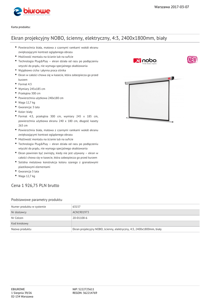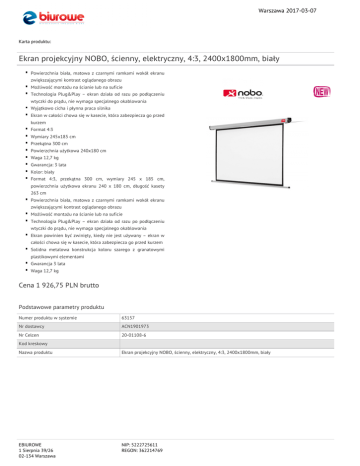Warszawa 2017-03-07 Karta produktu: Ekran projekcyjny NOBO, ścienny, elektryczny, 4:3, 2400x1800mm, biały Powierzchnia biała, matowa z czarnymi ramkami wokół ekranu zwiększającymi kontrast oglądanego obrazu Możliwość montażu na ścianie lub na suficie Technologia Plug&Play – ekran działa od razu po podłączeniu wtyczki do prądu, nie wymaga specjalnego okablowania Wyjątkowo cicha i płynna praca silnika Ekran w całości chowa się w kasecie, która zabezpiecza go przed kurzem Format 4:3 Wymiary 245x185 cm Przekątna 300 cm Powierzchnia użytkowa 240x180 cm Waga 12,7 kg Gwarancja: 3 lata Kolor: biały Format 4:3, przekątna 300 cm, wymiary 245 x 185 cm, powierzchnia użytkowa ekranu 240 x 180 cm, długość kasety 263 cm Powierzchnia biała, matowa z czarnymi ramkami wokół ekranu zwiększającymi kontrast oglądanego obrazu Możliwość montażu na ścianie lub na suficie Technologia Plug&Play – ekran działa od razu po podłączeniu wtyczki do prądu, nie wymaga specjalnego okablowania Ekran powinien być zwinięty, kiedy nie jest używany – ekran w całości chowa się w kasecie, która zabezpiecza go przed kurzem Solidna metalowa konstrukcja koloru szarego z granatowymi plastikowymi elementami Gwarancja 3 lata Waga 12,7 kg Cena 1 926,75 PLN brutto Podstawowe parametry produktu Numer produktu w systemie 63157 Nr dostawcy ACN1901973 Nr Celcen 20-01108-6 Kod kreskowy Nazwa produktu Ekran projekcyjny NOBO, ścienny, elektryczny, 4:3, 2400x1800mm, biały EBIUROWE 1 Sierpnia 39/26 02-134 Warszawa NIP: 5222725611 REGON: 362214769 Warszawa 2017-03-07 Karta katalogowa produktu cd. Ekran projekcyjny NOBO, ścienny, elektryczny, 4:3, 2400x1800mm, biały Opis Powierzchnia biała, matowa z czarnymi ramkami wokół ekranu zwiększającymi kontrast oglądanego obrazu; możliwość montażu na ścianie lub na suficie; technologia Plug&Play – ekran działa od razu po podłączeniu wtyczki do prądu, nie wymaga specjalnego okablowania; wyjątkowo cicha i płynna praca silnika; ekran w całości chowa się w kasecie, która zabezpiecza go przed kurzem; format 4:3; wymiary 245x185 cm; przekątna 300 cm; powierzchnia użytkowa 240x180 cm; waga 12,7 kg; gwarancja: 3 lata; kolor: biały; Format 4:3, przekątna 300 cm, wymiary 245 x 185 cm, powierzchnia użytkowa ekranu 240 x 180 cm, długość kasety 263 cm; Powierzchnia biała, matowa z czarnymi ramkami wokół ekranu zwiększającymi kontrast oglądanego obrazu; Możliwość montażu na ścianie lub na suficie; Technologia Plug&Play – ekran działa od razu po podłączeniu wtyczki do prądu, nie wymaga specjalnego okablowania; Ekran powinien być zwinięty, kiedy nie jest używany – ekran w całości chowa się w kasecie, która zabezpiecza go przed kurzem; Solidna metalowa konstrukcja koloru szarego z granatowymi plastikowymi elementami; Gwarancja 3 lata; Waga 12,7 kg Kategoria Ekrany Klasa Premium Marka NOBO Wymiary Wymiary (mm) 2400x1600 Format 4:3 Cecha Produkt Ekran projekcyjny W ofercie od 2017-01 Typ Elektryczny Rodzaj Ścienny Wspólny słownik zamówień CPV 30237210-4 Ekrany antyodblaskowe Certyfikaty Ilość lat gwarancji 3 Hit Standard Nowy produkt w ofercie Nowość Kolor Kolor Biały Serdecznie zapraszamy do współpracy EBIUROWE 1 Sierpnia 39/26 02-134 Warszawa NIP: 5222725611 REGON: 362214769 Warszawa 2017-03-07 EBIUROWE zespół. EBIUROWE 1 Sierpnia 39/26 02-134 Warszawa NIP: 5222725611 REGON: 362214769