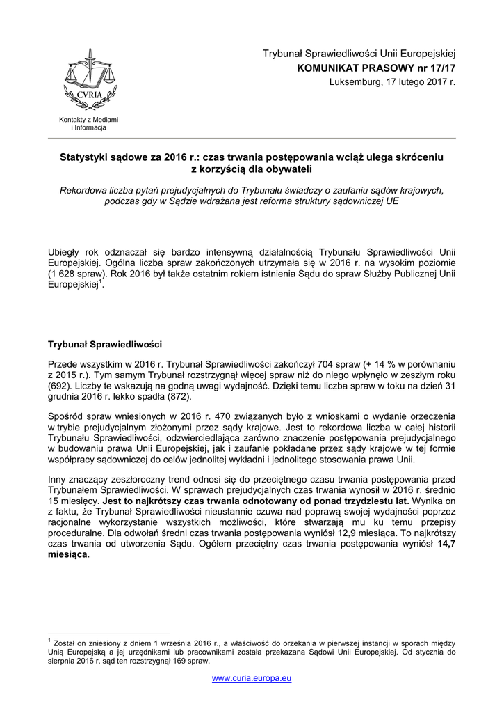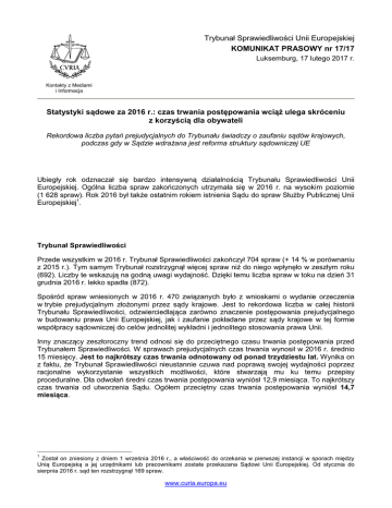 Trybunał Sprawiedliwości Unii Europejskiej KOMUNIKAT PRASOWY nr 17/17 Luksemburg, 17 lutego 2017 r. Kontakty z Mediami i Informacja Statystyki sądowe za 2016 r.: czas trwania postępowania wciąż ulega skróceniu z korzyścią dla obywateli Rekordowa liczba pytań prejudycjalnych do Trybunału świadczy o zaufaniu sądów krajowych, podczas gdy w Sądzie wdrażana jest reforma struktury sądowniczej UE Ubiegły rok odznaczał się bardzo intensywną działalnością Trybunału Sprawiedliwości Unii Europejskiej. Ogólna liczba spraw zakończonych utrzymała się w 2016 r. na wysokim poziomie (1 628 spraw). Rok 2016 był także ostatnim rokiem istnienia Sądu do spraw Służby Publicznej Unii Europejskiej1. Trybunał Sprawiedliwości Przede wszystkim w 2016 r. Trybunał Sprawiedliwości zakończył 704 spraw (+ 14 % w porównaniu z 2015 r.). Tym samym Trybunał rozstrzygnął więcej spraw niż do niego wpłynęło w zeszłym roku (692). Liczby te wskazują na godną uwagi wydajność. Dzięki temu liczba spraw w toku na dzień 31 grudnia 2016 r. lekko spadła (872). Spośród spraw wniesionych w 2016 r. 470 związanych było z wnioskami o wydanie orzeczenia w trybie prejudycjalnym złożonymi przez sądy krajowe. Jest to rekordowa liczba w całej historii Trybunału Sprawiedliwości, odzwierciedlająca zarówno znaczenie postępowania prejudycjalnego w budowaniu prawa Unii Europejskiej, jak i zaufanie pokładane przez sądy krajowe w tej formie współpracy sądowniczej do celów jednolitej wykładni i jednolitego stosowania prawa Unii. Inny znaczący zeszłoroczny trend odnosi się do przeciętnego czasu trwania postępowania przed Trybunałem Sprawiedliwości. W sprawach prejudycjalnych czas trwania wynosił w 2016 r. średnio 15 miesięcy. Jest to najkrótszy czas trwania odnotowany od ponad trzydziestu lat. Wynika on z faktu, że Trybunał Sprawiedliwości nieustannie czuwa nad poprawą swojej wydajności poprzez racjonalne wykorzystanie wszystkich możliwości, które stwarzają mu ku temu przepisy proceduralne. Dla odwołań średni czas trwania postępowania wyniósł 12,9 miesiąca. To najkrótszy czas trwania od utworzenia Sądu. Ogółem przeciętny czas trwania postępowania wyniósł 14,7 miesiąca. 1 Został on zniesiony z dniem 1 września 2016 r., a właściwość do orzekania w pierwszej instancji w sporach między Unią Europejską a jej urzędnikami lub pracownikami została przekazana Sądowi Unii Europejskiej. Od stycznia do sierpnia 2016 r. sąd ten rozstrzygnął 169 spraw. www.curia.europa.eu 1000 900 800 700 600 500 400 300 200 100 0 2012 2013 2014 Nowe sprawy 2015 Sprawy zakończone 2016 Sprawy w toku 2012 2013 2014 2015 2016 Nowe sprawy 632 699 622 713 692 Sprawy zakończone 595 701 719 616 704 Sprawy w toku 886 884 787 884 872 Sąd UE Analiza statystyk sądowych Sądu wskazuje zasadniczo na dwojakie zjawisko, a mianowicie na wzrost liczby nowych spraw i spraw w toku oraz na istotne skrócenie postępowania. Liczba nowych spraw wzrosła o 17 %, z 831 spraw w 2015 r. do 974 w 2016 r., w ogromnej mierze ze względu na przekazanie właściwości do rozpoznania w pierwszej instancji sporów z dziedziny służby publicznej Unii (które same stanowią 163 sprawy). Stosunek wzrostu liczby spraw w toku był podobny, z 1 267 spraw w 2015 r. do 1 486 spraw w 2016 r. Wydajność sądu podążała z kolei zgodnie z kierunkiem rozwoju wydajności osiągniętego od 2013 r., zaś liczba rozstrzygniętych spraw była jednym z trzech najlepszych wyników sądu od jego powstania (755 rozstrzygniętych spraw). Osłabienie odnotowane w stosunku do lat 2015 i 2014 wynika z łącznej konsekwencji pozbywania się zaległości (zwłaszcza w 2015 r.), następującego co trzy lata odnowienia składu Sądu oraz wewnętrznej reorganizacji sądu, która była niezbędna dla włączenia nowych sędziów, którzy przez pierwsze miesiące swej kadencji nie mogą w widoczny i znaczący sposób przyczynić się do wydajności pracy sądu. Jednocześnie ważny wskaźnik wydajności, jakim jest czas trwania postępowania, zachował korzystną tendencję. Dynamika skrócenia czasu trwania postępowania, notowana od 2013 r., znów się potwierdziła dzięki ogólnej przeciętej długości wynoszącej 18,7 miesiąca (sprawy rozstrzygnięte w drodze wyroku lub postanowienia, we wszystkich dziedzinach), czyli spadkowi o 1,9 miesiąca w stosunku do 2015 r. i o 8,2 miesiąca w stosunku do 2013 r. www.curia.europa.eu Ponadto, zwłaszcza w wyniku reorganizacji Sądu i powstania nowych możliwości dzięki wdrożeniu reformy struktury sądowniczej UE, liczba spraw przekazanych do pięcioosobowego składu orzekającego wzrosła w 2016 r. do 29, podczas gdy w latach 2010-2015 odnotowywano średnio poniżej 9 przypadków takiego przekazania rocznie. Wreszcie sytuacja dotycząca charakteru sporów cechowała się wzrostem liczby spraw z zakresu własności intelektualnej (+ 11 %), przekazaniem właściwości do rozstrzygania w pierwszej instancji w sprawach z dziedziny służby publicznej Unii (123 skarg przekazanych przez Sąd do spraw Służby Publicznej do Sądu w dniu 1 września i 40 nowych skarg wniesionych do dnia 31 grudnia 2016 r., czyli w sumie 163 sprawy, stanowiące niemal 17 % nowych spraw), stosunkowym spadkiem liczby spraw z dziedziny środków ograniczających (28 spraw wniesionych w 2016 r.), utrzymaniem się na wysokim poziomie spraw z zakresu pomocy państwa (76 spraw) – zwłaszcza w zakresie polityki fiskalnej państw członkowskich – oraz pojawieniem się nowego źródła sporów w dziedzinie stosowania zasad nadzoru ostrożnościowego wobec instytucji kredytowych. 1.600 1.400 1.200 1.000 800 600 400 200 0 2012 2013 Nowe sprawy Nowe sprawy Sprawy zakończone Sprawy w toku 2014 2015 Sprawy zakończone 2016 Sprawy w toku 2012 2013 2014 2015 2016 617 688 1 237 790 702 1 325 912 814 1 423 831 987 1 267 974 755 1 486 Dokument nieoficjalny, sporządzony na użytek mediów, który nie wią