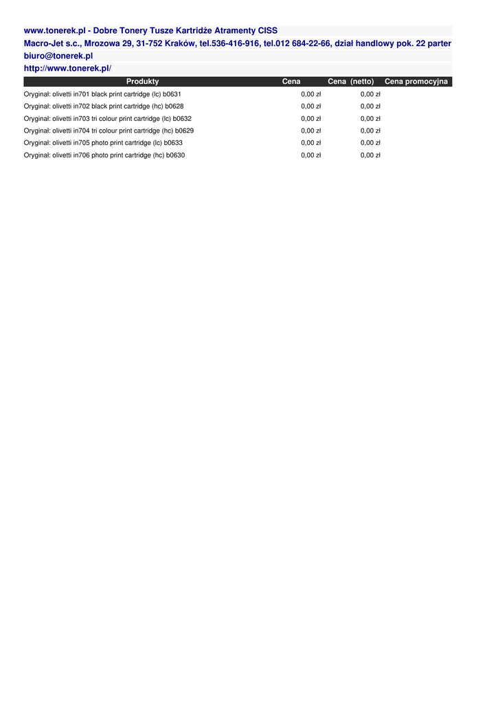 www.tonerek.pl - Dobre Tonery Tusze Kartridże Atramenty CISS Macro-Jet s.c., Mrozowa 29, 31-752 Kraków, tel.536-416-916, tel.012 684-22-66, dział handlowy pok. 22 parter [email protected] http://www.tonerek.pl/ Produkty Cena Cena (netto) Oryginał: olivetti in701 black print cartridge (lc) b0631 0,00 zł 0,00 zł Oryginał: olivetti in702 black print cartridge (hc) b0628 0,00 zł 0,00 zł Oryginał: olivetti in703 tri colour print cartridge (lc) b0632 0,00 zł 0,00 zł Oryginał: olivetti in704 tri colour print cartridge (hc) b0629 0,00 zł 0,00 zł Oryginał: olivetti in705 photo print cartridge (lc) b0633 0,00 zł 0,00 zł Oryginał: olivetti in706 photo print cartridge (hc) b0630 0,00 zł 0,00 zł Cena promocyjna