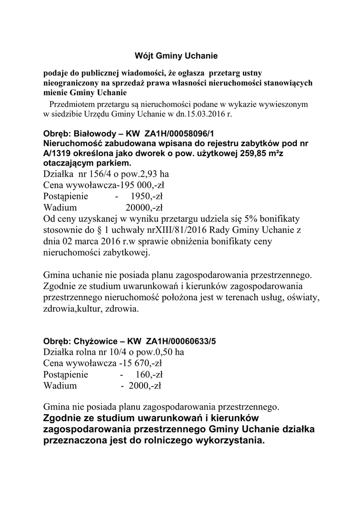 Wójt Gminy Uchanie podaje do publicznej wiadomości, że ogłasza przetarg ustny nieograniczony na sprzedaż prawa własności nieruchomości stanowiących mienie Gminy Uchanie Przedmiotem przetargu są nieruchomości podane w wykazie wywieszonym w siedzibie Urzędu Gminy Uchanie w dn.15.03.2016 r. Obręb: Białowody – KW ZA1H/00058096/1 Nieruchomość zabudowana wpisana do rejestru zabytków pod nr A/1319 określona jako dworek o pow. użytkowej 259,85 m²z otaczającym parkiem. Działka nr 156/4 o pow.2,93 ha Cena wywoławcza-195 000,-zł Postąpienie - 1950,-zł Wadium 20000,-zł Od ceny uzyskanej w wyniku przetargu udziela się 5% bonifikaty stosownie do § 1 uchwały nrXIII/81/2016 Rady Gminy Uchanie z dnia 02 marca 2016 r.w sprawie obniżenia bonifikaty ceny nieruchomości zabytkowej. Gmina uchanie nie posiada planu zagospodarowania przestrzennego. Zgodnie ze studium uwarunkowań i kierunków zagospodarowania przestrzennego nieruchomość położona jest w terenach usług, oświaty, zdrowia,kultur, zdrowia. Obręb: Chyżowice – KW ZA1H/00060633/5 Działka rolna nr 10/4 o pow.0,50 ha Cena wywoławcza -15 670,-zł Postąpienie - 160,-zł Wadium - 2000,-zł Gmina nie posiada planu zagospodarowania przestrzennego. Zgodnie ze studium uwarunkowań i kierunków zagospodarowania przestrzennego Gminy Uchanie działka przeznaczona jest do rolniczego wykorzystania. Zbywane nieruchomości są wolne od obciążeń i zobowiązań. Przetarg odbędzie się dn. 31.05.2016 r. o godz.1000 w siedzibie Urzędu Gminy w Uchaniach (sala posiedzeń). Warunkiem przystąpienia do przetargu jest wpłacenie wadium wnoszone w pieniądzu najpóźniej do dnia.25.05.2016r. na konto Urzędu Gminy Uchanie BS Białopole O/Uchanie nr 59820210162002160003740001 Wadium nie podlega zwrotowi, gdy: -osoba, która wygrała przetarg, uchyli się od zawarcia notarialnej umowy kupna sprzedaży. Szczegółowe informacje dotyczące nieruchomości, warunków sprzedaży można uzyskać w Urzędzie Gminy w Uchaniach – Ref. Infrastruktury Techn., Ochrony Środowiska i Rolnictwa. Przetarg odbędzie się także, jeśli o zakup wystąpi tylko jedna osoba. Zastrzega się prawo odstąpienia od przetargu bez podania przyczyn do chwili rozpoczęcia przetargu oraz prawo unieważnienia przetargu z uzasadnionych przyczyn. Uchanie, dnia 28.04.2016r.
