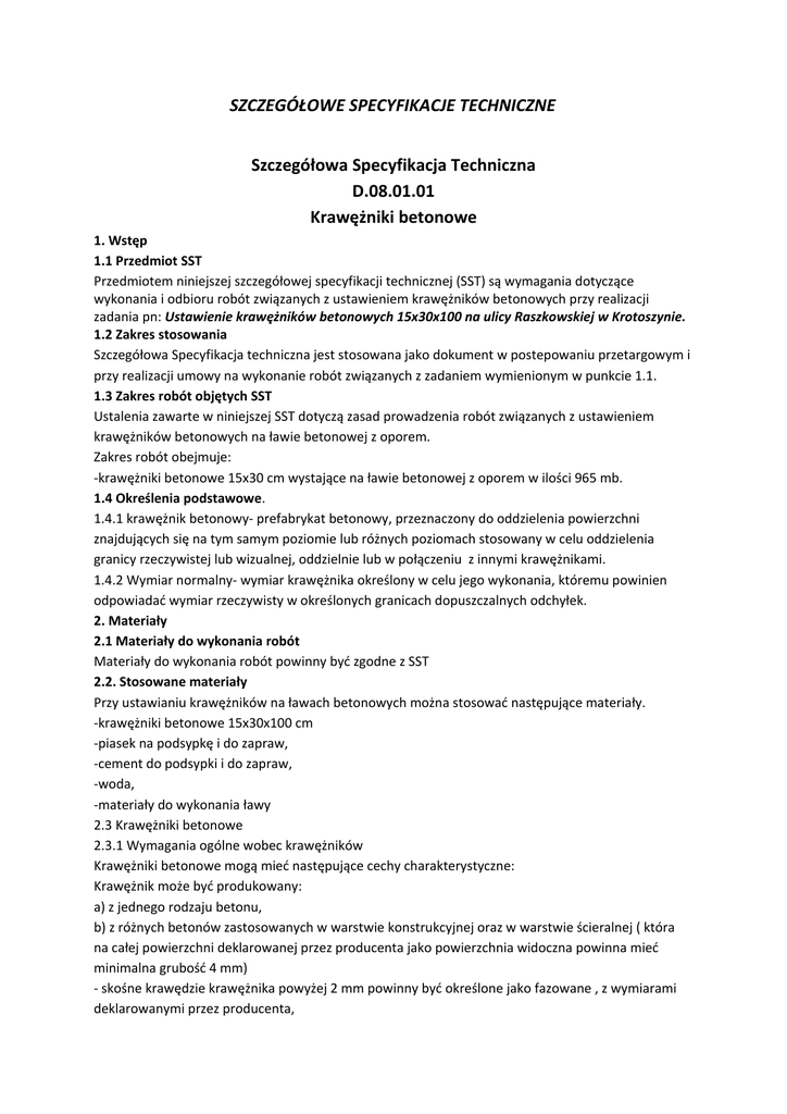 SZCZEGÓŁOWE SPECYFIKACJE TECHNICZNE Szczegółowa Specyfikacja Techniczna D.08.01.01 Krawężniki betonowe 1. Wstęp 1.1 Przedmiot SST Przedmiotem niniejszej szczegółowej specyfikacji technicznej (SST) są wymagania dotyczące wykonania i odbioru robót związanych z ustawieniem krawężników betonowych przy realizacji zadania pn: Ustawienie krawężników betonowych 15x30x100 na ulicy Raszkowskiej w Krotoszynie. 1.2 Zakres stosowania Szczegółowa Specyfikacja techniczna jest stosowana jako dokument w postepowaniu przetargowym i przy realizacji umowy na wykonanie robót związanych z zadaniem wymienionym w punkcie 1.1. 1.3 Zakres robót objętych SST Ustalenia zawarte w niniejszej SST dotyczą zasad prowadzenia robót związanych z ustawieniem krawężników betonowych na ławie betonowej z oporem. Zakres robót obejmuje: -krawężniki betonowe 15x30 cm wystające na ławie betonowej z oporem w ilości 965 mb. 1.4 Określenia podstawowe. 1.4.1 krawężnik betonowy- prefabrykat betonowy, przeznaczony do oddzielenia powierzchni znajdujących się na tym samym poziomie lub różnych poziomach stosowany w celu oddzielenia granicy rzeczywistej lub wizualnej, oddzielnie lub w połączeniu z innymi krawężnikami. 1.4.2 Wymiar normalny- wymiar krawężnika określony w celu jego wykonania, któremu powinien odpowiadać wymiar rzeczywisty w określonych granicach dopuszczalnych odchyłek. 2. Materiały 2.1 Materiały do wykonania robót Materiały do wykonania robót powinny być zgodne z SST 2.2. Stosowane materiały Przy ustawianiu krawężników na ławach betonowych można stosować następujące materiały. -krawężniki betonowe 15x30x100 cm -piasek na podsypkę i do zapraw, -cement do podsypki i do zapraw, -woda, -materiały do wykonania ławy 2.3 Krawężniki betonowe 2.3.1 Wymagania ogólne wobec krawężników Krawężniki betonowe mogą mieć następujące cechy charakterystyczne: Krawężnik może być produkowany: a) z jednego rodzaju betonu, b) z różnych betonów zastosowanych w warstwie konstrukcyjnej oraz w warstwie ścieralnej ( która na całej powierzchni deklarowanej przez producenta jako powierzchnia widoczna powinna mieć minimalna grubość 4 mm) - skośne krawędzie krawężnika powyżej 2 mm powinny być określone jako fazowane , z wymiarami deklarowanymi przez producenta, -powierzchnia krawężnika może być obrabiana, poddana dodatkowej obróbce lub obróbce chemicznej, płaszczyzny czołowe krawężników mogą być proste lub ukształtowane w sposób ułatwiający układanie lub ryglowanie, -krawężniki łukowe mogą być wykonane jako wypukłe lub wklęsłe, -rozróżnia się dwa typy krawężników: a) uliczne, do oddzielenia powierzchni znajdujących się na różnych poziomach (np. jezdni i chodniki), b) drogowe (oporniki) do oddzielenia powierzchni znajdującej się na tym samym poziomie (np. jezdni i pobocza) 2.3.2 Wymagania techniczne wobec krawężników Dopuszczalne odchyłki wymiarów krawężników betonowych podano w tablicy 1. Tablica 1. Dopuszczalne odchyłki wymiarów krawężników betonowych Wymiar Długość, mm Dopuszczalne odchyłki wymiarów ±1% Nie mniej niż Nie więcej niż 4 mm 10 mm Tablica 2 Wymagania dotyczące krawężników betonowych Badania właściwości Nasiąkliwość % masy 3 klasa oznaczenie B Odporność na zamrażanie/rozmrażanie z udziałem soli odladzających, ubytek masy po badaniu kg/m2 Wytrzymałość na zginanie MPa 3 D 2 T Klasa odporności na ścieranie 4 I Wielkość mierzona Wartość średnia mniejsza lub równa 6% Wartość średnia mniejsza lub równa 1 % przy czym żaden pojedynczy wynik nie większy od 1,5 % Charakterystyczna wytrzymałość na zginanie 5,0 MPa, ale minimalna wytrzymałość na zginanie 4,0 MPa Pomiar wykonany zgodnie z metoda opisana w załączniku G do normy; nie mniejsza lub równa 20 mm 2.3.3 Dokumenty potwierdzające jakość wyrobu Aprobaty techniczne wystawione przed czasem wejścia w życie Rozporządzenia w sprawie aprobat technicznych oraz jednostek organizacyjnych uprawnionych do nich wydania, nie mogą być zmieniane lecz zachowują ważność przez okres, na jaki zostały wydane. W tym przypadku do oznakowania wyrobu znakiem budowlanym „B” wystarcza deklaracja zgodności z Aprobata Techniczną Producenci powinni oznakować wyroby znakiem handlowym „B” , co oznacza wystawienie deklaracji zgodności z Aprobata Techniczną ( gdy uzyskali uprzednio Aprobatę Techniczną) lub znakiem „CE”, co oznacza wystawienie deklaracji zgodności z norma zharmonizowana (PN-EN 1340; 2004.) Niezależnie od Deklaracji zgodności producent dostarczy świadectwo jakości- informacja o produkcie dla dostawy elementów. 2.3.4 Składowanie krawężników. Krawężniki betonowe mogą być przechowywane na składowiskach otwartych, posegregowane według typów, rodzajów, kształtów, cech fizycznych i mechanicznych, wielkości, wyglądu itp. Krawężniki betonowe należy układać z zastosowaniem podkładek i przekładek drewnianych o wymiarach : grubość 2,5 cm, szerokość 5 cm, długość min. 5 cm większej od szerokości krawężnika. 2.3.5 Materiały na podsypkę i do zapraw. Na podsypkę cementowo-piaskową i do zapraw należy stosować następujące materiały: -mieszankę cementu i piasku: z piasku naturalnego spełniającego wymagania dla gatunku 1 wg PN-B11113, cementu 32,5 ,spełniającego wymagania PN-EN 197-1 i wody odmiany 1 odpowiadającej wymaganiom PN-88/B-32250. Składowanie kruszywa, nie przeznaczonego do bezpośredniego wbudowania po dostarczeniu na budowę, powinno odbywać się na podłożu równym, utwardzonym i dobrze odwodnionym, przy zabezpieczeniu kruszywa przed zanieczyszczeniem i zmieszaniem z innymi materiałami kamiennymi. Przechowywanie cementu powinno być zgodne z BN-88/6731-08. 2.3.6 Materiał na ławy. Do wykonania ław pod krawężnik należy stosować ławy betonowe z betonu klasy C12/15 wg PN-EN 206-1 2.3.7 Masa zalewowa w szczelinach ławy beton