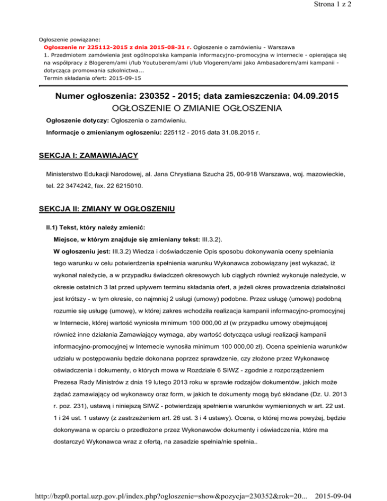 Strona 1 z 2 Ogłoszenie powiązane: Ogłoszenie nr 225112-2015 z dnia 2015-08-31 r. Ogłoszenie o zamówieniu - Warszawa 1. Przedmiotem zamówienia jest ogólnopolska kampania informacyjno-promocyjna w internecie - opierająca się na współpracy z Blogerem/ami i/lub Youtuberem/ami i/lub Vlogerem/ami jako Ambasadorem/ami kampanii dotycząca promowania szkolnictwa... Termin składania ofert: 2015-09-15 Numer ogłoszenia: 230352 - 2015; data zamieszczenia: 04.09.2015 OGŁOSZENIE O ZMIANIE OGŁOSZENIA Ogłoszenie dotyczy: Ogłoszenia o zamówieniu. Informacje o zmienianym ogłoszeniu: 225112 - 2015 data 31.08.2015 r. SEKCJA I: ZAMAWIAJĄCY Ministerstwo Edukacji Narodowej, al. Jana Chrystiana Szucha 25, 00-918 Warszawa, woj. mazowieckie, tel. 22 3474242, fax. 22 6215010. SEKCJA II: ZMIANY W OGŁOSZENIU II.1) Tekst, który należy zmienić: Miejsce, w którym znajduje się zmieniany tekst: III.3.2). W ogłoszeniu jest: III.3.2) Wiedza i doświadczenie Opis sposobu dokonywania oceny spełniania tego warunku w celu potwierdzenia spełnienia warunku Wykonawca zobowiązany jest wykazać, iż wykonał należycie, a w przypadku świadczeń okresowych lub ciągłych również wykonuje należycie, w okresie ostatnich 3 lat przed upływem terminu składania ofert, a jeżeli okres prowadzenia działalności jest krótszy - w tym okresie, co najmniej 2 usługi (umowy) podobne. Przez usługę (umowę) podobną rozumie się usługę (umowę), w której zakres wchodziła realizacja kampanii informacyjno-promocyjnej w Internecie, której wartość wyniosła minimum 100 000,00 zł (w przypadku umowy obejmującej również inne działania Zamawiający wymaga, aby wartość dotycząca usługi realizacji kampanii informacyjno-promocyjnej w Internecie wynosiła minimum 100 000,00 zł). Ocena spełnienia warunków udziału w postępowaniu będzie dokonana poprzez sprawdzenie, czy złożone przez Wykonawcę oświadczenia i dokumenty, o których mowa w Rozdziale 6 SIWZ - zgodnie z rozporządzeniem Prezesa Rady Ministrów z dnia 19 lutego 2013 roku w sprawie rodzajów dokumentów, jakich może żądać zamawiający od wykonawcy oraz form, w jakich te dokumenty mogą być składane (Dz. U. 2013 r. poz. 231), ustawą i niniejszą SIWZ - potwierdzają spełnienie warunków wymienionych w art. 22 ust. 1 i 24 ust. 1 ustawy (z zastrzeżeniem art. 26 ust. 3 i 4 ustawy). Ocena, o której mowa powyżej, będzie dokonywana w oparciu o przedłożone przez Wykonawców dokumenty i oświadczenia, które ma dostarczyć Wykonawca wraz z ofertą, na zasadzie spełnia/nie spełnia.. http://bzp0.portal.uzp.gov.pl/index.php?ogloszenie=show&pozycja=230352&rok=20... 2015-09-04 Strona 2 z 2 W ogłoszeniu powinno być: III.3.2) Wiedza i doświadczenie Opis sposobu dokonywania oceny spełniania tego warunku w celu potwierdzenia spełnienia warunku Wykonawca zobowiązany jest wykazać, iż wykonał należycie, a w przypadku świadczeń okresowych lub ciągłych również wykonuje należycie, w okresie ostatnich 3 lat przed upływem terminu składania ofert, a jeżeli okres prowadzenia działalności jest krótszy - w tym okresie, co najmniej 2 usługi (umowy) podobne. Przez usługę (umowę) podobną rozumie się usługę (umowę), w której zakres wchodziła realizacja kampanii informacyjno-promocyjnej w Internecie, której wartość wyniosła minimum 100 000,00 zł (w przypadku umowy obejmującej również inne działania Zamawiający wymaga, aby wartość dotycząca usługi realizacji kampanii informacyjno-promocyjnej w Internecie wynosiła minimum 100 000,00 zł). Poprzez realizację kampanii informacyjno-promocyjnej w Internecie, Zamawiający rozumie prowadzenie w Internecie działań promujących np. produkty (towary lub usługi) lub ideę (koncepcję, naukę, programy rządowe itd.). Działania te powinny być skierowane do grupy docelowej i spójne z celem danej kampanii, którą realizował Wykonawca. Ocena spełnienia warunków udziału w postępowaniu będzie dokonana poprzez sprawdzenie, czy złożone przez Wykonawcę oświadczenia i dokumenty, o których mowa w Rozdziale 6 SIWZ - zgodnie z rozporządzeniem Prezesa Rady Ministrów z dnia 19 lutego 2013 roku w sprawie rodzajów dokumentów, jakich może żądać zamawiający od wykonawcy oraz form, w jakich te dokumenty mogą być składane (Dz. U. 2013 r. poz. 231), ustawą i niniejszą SIWZ potwierdzają spełnienie warunków wymienionych w art. 22 ust. 1 i 24 ust. 1 ustawy (z zastrzeżeniem art. 26 ust. 3 i 4 ustawy). Ocena, o której mowa powyżej, będzie dokonywana w oparciu o przedłożone przez Wykonawców dokumenty i oświadczenia, które ma dostarczyć Wykonawca wraz z ofertą, na zasadzie spełnia/nie spełnia.. Miejsce, w którym znajduje się zmieniany tekst: IV.4.4). W ogłoszeniu jest: IV.4.4) Termin składania wniosków o dopuszczenie do udziału w postępowaniu lub ofert: 15.09.2015 godzina 12:00, miejsce: Ministerstwo Edukacji Narodowej, al. J. Ch. Szucha 25, 00-918 Warszawa, Sekretariat Departamentu Ekonomicznego, (III piętro, pok. 353).. W ogłoszeniu powinno być: IV.4.4) Termin składania wniosków o dopuszczenie do udziału w postępowaniu lub ofert: 16.09.2015 godzina 12:00, miejsce: Ministerstwo Edukacji Narodowej, al. J. Ch. Szucha 25, 00-918 Warszawa, Sekretariat Departamentu Ekonomicznego, (III piętro, pok. 353).. http://bzp0.portal.uzp.gov.pl/index.php?ogloszenie=show&pozycja=230352&rok=20... 2015-09-04