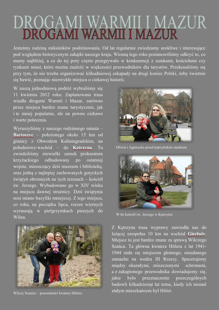 Jesteśmy rodziną miłośników podróżowania. Od lat regularnie zwiedzamy urokliwe i interesujące pod względem historycznym zakątki naszego kraju. Wiosną tego roku postanowiliśmy odkryć to, co mamy najbliżej, a co do tej pory często przegrywało w konkurencji z zamkami, kościołami czy rynkami miast, które można znaleźć w większości przewodników dla turystów. Przekonaliśmy się przy tym, że nie trzeba organizować kilkudniowej eskapady na drugi koniec Polski, żeby świetnie się bawić, poznając niezwykłe miejsca o ciekawej historii. W naszą jednodniową podróż wybraliśmy się 11 kwietnia 2012 roku. Zaplanowana trasa wiodła drogami Warmii i Mazur, zarówno przez miejsca bardzo znane turystycznie, jak i te mniej popularne, ale na pewno ciekawe i warte polecenia. Wyruszyliśmy z naszego rodzinnego miasta – Bartoszyc – położonego około 15 km od granicy z Obwodem Kaliningradzkim, na południowy-wschód – do Kętrzyna. Tu zwiedziliśmy niewielki zamek prokuratora krzyżackiego odbudowany po ostatniej wojnie, mieszczący dziś muzeum i bibliotekę, oraz jedną z najlepiej zachowanych gotyckich świątyń obronnych na tych terenach – kościół św. Jerzego. Wybudowano go w XIV wieku na miejscu dawnej strażnicy. Dziś świątynia nosi miano bazyliki mniejszej. Z tego miejsca, co roku, na początku lipca, rzesze wiernych wyruszają w pielgrzymkach pieszych do Wilna. Wilczy Szaniec – pozostałości kwatery Hitlera Oliwia i Agnieszka przed kętrzyńskim zamkiem W tle kościół św. Jerzego w Kętrzynie Z Kętrzyna trasa wyprawy zawiodła nas do leżącej niespełna 10 km na wschód Gierłoży. Miejsce to jest bardzo znane za sprawą Wilczego Szańca. Ta główna kwatera Hitlera z lat 19411944 stała się miejscem głośnego, nieudanego zamachu na wodza III Rzeszy. Spacerujemy między okazałymi, zniszczonymi schronami, a z zakupionego przewodnika dowiadujemy się, jakie było przeznaczenie poszczególnych budowli kilkadziesiąt lat temu, kiedy ich niemal stałym mieszkańcem był Hitler. Tuż za Wilczym Szańcem znajduje się miejsce zupełnie z innej bajki – to Park Miniatur Warmii i Mazur. Znajdują się tu makiety najpiękniejszych zabytków naszego regionu: bazylika w Świętej Lipce, zamek w Nidzicy, Malborku czy Lidzbarku Warmińskim, pałac w Sztynorcie, a nawet piramida w Rapie. Oprócz miniaturowych budowli możemy zobaczyć tu eksponaty nawiązujące do pobliskiej Gierłoży – pojazdy militarne z czasów II wojny światowej, repliki broni, a także największą na świecie makietę Wilczego Szańca. Miłośnicy średniowiecza mogą zajrzeć natomiast do grodziska rycerskiego, by nauczyć się np. strzelania z łuku czy władania mieczem. Miejsce to jest naprawdę urocze, ciekawe i jak najbardziej godne polecenia. Pośród miniaturowych budowli każdy poczuje się jak Guliwer Dalsza część podróży potwierdza, że Warmia i Mazury to raj dla miłośników historii, również tej najnowszej. Znajduje się tu wiele budowli i umocnień z okresu II wojny światowej. O wspomnianym Wilczym Szańcu słyszał niemal każdy, ale już nieliczni znają Radzieje, Mamerki czy Pozezdrze. Szlakiem Błękitnej wstęgi jezior, ruszyliśmy w stronę miejscowości Radzieje, aby odszukać byłą polową kwaterę gen. Hansa Lammersa – bliskiego współpracownika Hitlera. Zadanie okazało się dosyć trudne, gdyż do budowli nie prowadzi żaden drogowskaz. Kwatera usytuowana jest w lesie, około 1 km od szosy. Przez środek kompleksu przebiega betonowa droga, obok tory kolejowe. Zbudowano tu dwa ciężkie bunkry i kilka lekkich budynków z cegły. Po krótkim spacerze wyruszyliśmy w kierunku Mamerek. Po drodze wstąpiliśmy do Sztynortu. Można tu zobaczyć wspaniałą niegdyś rezydencję pruskiego rodu Lehndorffów, a w sezonie – podziwiać bez Malborski zamek imponuje również w wersji „mini” końca przesuwające się po tafli jeziora liczne żaglówki. Jadąc dalej tą drogą, dojedzie się do miejscowości Pozezdrze, w pobliżu której znajduje się kolejna wojenna kwatera Hochwald. W drodze do Sztynortu towarzyszył nam mazurski wiatr Sztynorcki pałac imponuje, jednak wymaga remontu Po kilkunastu minutach drogi ze Sztynortu dotarliśmy do Mamerek. Jest to najlepiej zachowany kompleks (około 30 budynków) niezniszczonych bunkrów niemieckich z okresu II wojny światowej. Jest pośród nich między innymi „gigant” o ścianach grubości do 7 metrów! Wycofujący się w 1945 r. Niemcy nie zdążyli wysadzić swojej fortyfikacji, stąd tak dobry stan twierdzy. Na jednym ze schronów zbudowano wieżę… Będąc w tym miejscu, koniecznie należy „wspiąć się” po drewnianych schodach na punkt widokowy znajdujący się na szczycie potężnego schronu. Roztacza się tu widok na jezioro Mamry. Znajdują się na nim 33 wyspy, pośród nich największa na Mazurach – Upałty. Latem jezioro zapełnia się miłośnikami żaglówek, jachtów i kajaków. Wczesną wiosną jest tu zdecydowanie spokojniej i można w ciszy podziwiać unikatowe mazurskie cuda natury. … z której roztacza się widok na jezioro Mamry Kolejnym przystankiem na naszej drodze była miejscowość Guja, w pobliżu której znajduje się jedyna dokończona śluza Kanału Mazurskiego. Budowę tego kanału rozpoczęli Niemcy w 1911 roku w celu połączenia Wielkich Jezior Mazurskich z Bałtykiem. Różnica poziomu wód między jeziorem Mamry a rzeką Łyną wynosi ok. 111 metrów, dlatego na Kanale Mazurskim rozpoczęto budowę dziesięciu śluz. Obecnie pięć z nich znajduje się na terenie Polski. Śluza w Guji to atrakcja nie tylko dla miłośników historii, lecz także dla wielbicieli techniki W drodze powrotnej zajrzeliśmy jeszcze do Leśniewa, gdzie można obejrzeć, tym razem nieukończone śluzy – Leśniewo Górne i Dolne. Dodatkową atrakcją tego miejsca w sezonie turystycznym jest możliwość zabawy w parku linowym usytuowanym w pobliżu. Po drodze z Leśniewa d