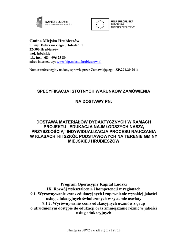 Gmina Miejska Hrubieszów ul. mjr Dobrzańskiego „Hubala” 1 22-500 Hrubieszów woj. lubelskie tel., fax. 084 696 23 80 adres internetowy: www.bip.miasto.hrubieszow.pl Numer referencyjny nadany sprawie przez Zamawiającego: ZP.271.20.2011 SPECYFIKACJA ISTOTNYCH WARUNKÓW ZAMÓWIENIA NA DOSTAWY PN: DOSTAWA MATERIAŁÓW DYDAKTYCZNYCH W RAMACH PROJEKTU „EDUKACJA NAJMŁODSZYCH NASZĄ PRZYSZŁOŚCIĄ” INDYWIDUALIZACJA PROCESU NAUCZANIA W KLASACH I-III SZKÓŁ PODSTAWOWYCH NA TERENIE GMINY MIEJSKIEJ HRUBIESZÓW Program Operacyjny Kapitał Ludzki IX. Rozwój wykształcenia i kompetencji w regionach 9.1. Wyrównywanie szans edukacyjnych i zapewnienie wysokiej jakości usług edukacyjnych świadczonych w systemie oświaty 9.1.2. Wyrównywanie szans edukacyjnych uczniów z grup o utrudnionym dostępie do edukacji oraz zmniejszanie różnic w jakości usług edukacyjnych Niniejsza SIWZ składa się z 71 stron I. INFORMACJE OGÓLNE – TRYB UDZIELENIA ZAMÓWIENIA 1) Zamawiający - Gmina Miejska Hrubieszów ul. mjr H. Dobrzańskiego „Hubala” 1, zaprasza do udziału w postępowaniu o udzielenie zamówienia publicznego na dostawy. 2) Postępowanie prowadzone jest w trybie przetargu nieograniczonego poniżej 193.000 EURO, na podstawie art. 2 pkt 2, art. 10 ust. 1 oraz art. 39 ustawy z dnia 29 stycznia 2004 r. Prawo zamówień publicznych (tekst jednolity Dz. U. z 2010 r., Nr 113, poz. 759 z późn. zm. ), zwanej dalej ustawą PZP. 3) W sprawach nieuregulowanych ustawą Prawo zamówień publicznych, przepisy ustawy – Kodeks cywilny (Dz. U. z 1964 r. Nr 43, poz. 296 z późn. zm.). II. OPIS PRZEDMIOTU ZAMÓWIENIA Przedmiotem zamówienia jest dostawa materiałów dydaktycznych w ramach projektu „Edukacja najmłodszych naszą przyszłością” Indywidualizacja procesu nauczania w klasach I-III szkół podstawowych na terenie Gminy Miejskiej Hrubieszów. Przedmiot zamówienia musi być fabrycznie nowy i spełniający wymagania norm technicznych stosowanych w Polsce (PN) oraz norm europejskich. Produkty, które tego wymagają winny posiadać niezbędne certyfikaty bezpieczeństwa określone w odrębnych przepisach lub protokoły zgodności z obowiązującymi normami. Wszystkie urządzenia i sprzęt muszą posiadać certyfikaty i atesty dopuszczające do użytku w szkole. Zamawiający dopuszcza składanie ofert w częściach – 4 części Wykonawca dostarczy materiały dydaktyczne na własny koszt do wskazanych przez Zamawiającego placówek oświatowych w dniach pracy poniedziałek – piątek w godz. 8.00 - 14.00. Jeżeli w SIWZ przy opisie przedmiotu zamówienia wskazana została nazwa producenta, znak towarowy, patent lub pochodzenie w stosunku do określonych materiałów, urządzeń, itp. Zamawiający wymaga, aby traktować takie wskazanie jako przykładowe i dopuszcza zastosowanie przy realizacji zamówienia materiałów, urządzeń, itp. równoważnych o parametrach nie gorszych niż wskazane. Wykonawca może zastosować materiały równoważne, ale muszą one być nie gorsze od materiałów zastosowanych w dokumentacji lub muszą przewyższać jakością materiały ujęte w dokumentacji. W przypadku zastosowania materiałów równoważnych dotyczących zamówienia wykonawca przedstawi niezbędne certyfikaty lub badania dla wszystkich materiałów tzw. równoważnych na etapie składania ofert. 2 Projekt współfinansowany przez Unię Europejską w ramach Europejskiego Funduszu Społecznego Kody CPV 39.16.21.00 - 6 Pomoce dydaktyczne 37.52.41.00 - 8 Gry edukacyjne 30.19.00.00 - 7 Różny sprzęt i artykuły biurowe 48.19.00.00 - 6 Pakiety oprogramowania edukacyjnego 32.32.20.00 - 6 Urządzenia multimedialne 22.10.00.00 - 1 Drukowane książki, broszury i ulotki 30.21.31.00 - 6 Komputery przenośne 38.51.00.00 - 3 Mikroskopy III. OPIS CZĘŚCI ZAMÓWIENIA Część nr 1 zamówienia – Zakup sprzętu komputerowego i oprogramowania w ramach zamówienia Dostawa materiałów dydaktycznych w ramach projektu „Edukacja najmłodszych naszą przyszłością” Indywidualizacja procesu nauczania w klasach I-III szkół podstawowych na terenie Gminy Miejskiej Hrubieszów Szczegółowy wykaz sprzętu komputerowego i oprogramowania zawiera załącznik nr 6 do SIWZ. Część nr 2 zamówienia – Zakup sprzętu laboratoryjnego w ramach zamówienia Dostawa materiałów dydaktycznych w ramach projektu „Edukacja najmłodszych naszą przyszłością” Indywidualizacja procesu nauczania w klasach I-III szkół podstawowych na terenie Gminy Miejskiej Hrubieszów Szczegółowy wykaz sprzętu laboratoryjnego zawiera załącznik nr 7 do SIWZ. Część nr 3 zamówienia – Zakup pomocy dydaktycznych w ramach zamówienia Dostawa materiałów dydaktycznych w ramach projektu „Edukacja najmłodszych naszą przyszłością” Indywidualizacja procesu nauczania w klasach I-III szkół podstawowych na terenie Gminy Miejskiej Hrubieszów Szczegółowy wykaz pomocy zawiera załącznik nr 8 do SIWZ. Część nr 4 zamówienia – Zakup podręczników w ramach zamówienia Dostawa materiałów dydaktycznych w ramach projektu „Edukacja najmłodszych naszą przyszłością” Indywidualizacja procesu nauczania w klasach I-III szkół podstawowych na terenie Gminy Miejskiej Hrubieszów Szczegółowy wykaz podręczników zawiera załącznik nr 9 do SIWZ. IV. ZAMÓWIENIA UZUPEŁNIAJĄCE Zamawiający nie przewiduje możliwości udzielenia zamówień uzupełniających V.OFERTY WARIANTOWE Zamawiający nie dopuszcza składnia ofert wariantowych VI. ZALICZKI Zamawiający nie przewiduje udzielania zaliczek 3 Projekt współfinansowany przez Unię Europejską w ramach Europejskiego Funduszu Społecznego VII.TERMIN WYKONANIA ZAMÓWIENIA I TERMIN GWARANCJI NA WYKONANE ROBOTY 1. Termin realizacji zamówienia: 14 dni od dnia podpisania umowy 2. Okres udzielenia gwarancji – zgodnie ze szczegółowym wykazem materiałów zawartym w załącznikach nr 6-9 do SIWZ VIII. WARUNKI UDZIAŁU W POSTĘPOWANIU ORAZ OPIS SPOSOBU DOKONYWANIA O