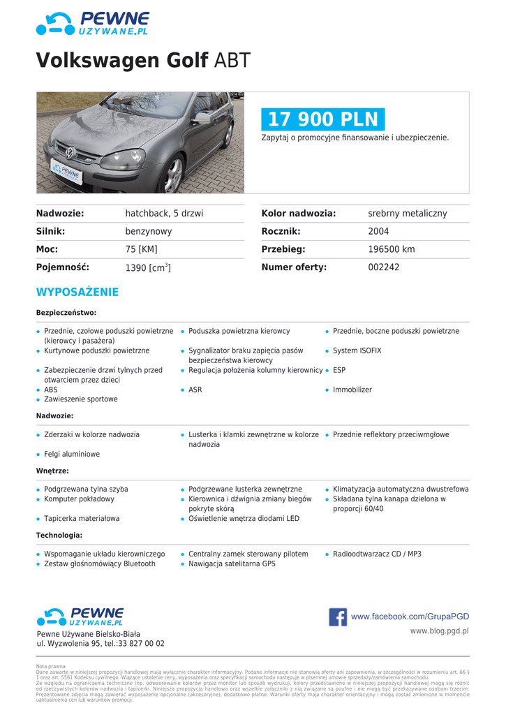 Volkswagen Golf ABT 17 900 PLN Zapytaj o promocyjne finansowanie i ubezpieczenie. Nadwozie: hatchback, 5 drzwi Kolor nadwozia: srebrny metaliczny Silnik: benzynowy Rocznik: 2004 Moc: 75 [KM] Przebieg: 196500 km Pojemność: 1390 [cm ] Numer oferty: 002242 3 WYPOSAŻENIE Bezpieczeństwo: Przednie, czołowe poduszki powietrzne (kierowcy i pasażera) Kurtynowe poduszki powietrzne Zabezpieczenie drzwi tylnych przed otwarciem przez dzieci ABS Zawieszenie sportowe Poduszka powietrzna kierowcy Przednie, boczne poduszki powietrzne Sygnalizator braku zapięcia pasów bezpieczeństwa kierowcy Regulacja położenia kolumny kierownicy System ISOFIX ASR Immobilizer Lusterka i klamki zewnętrzne w kolorze nadwozia Przednie reflektory przeciwmgłowe Podgrzewane lusterka zewnętrzne Kierownica i dźwignia zmiany biegów pokryte skórą Oświetlenie wnętrza diodami LED Klimatyzacja automatyczna dwustrefowa Składana tylna kanapa dzielona w proporcji 60/40 Centralny zamek sterowany pilotem Nawigacja satelitarna GPS Radioodtwarzacz CD / MP3 ESP Nadwozie: Zderzaki w kolorze nadwozia Felgi aluminiowe Wnętrze: Podgrzewana tylna szyba Komputer pokładowy Tapicerka materiałowa Technologia: Wspomaganie układu kierowniczego Zestaw głośnomówiący Bluetooth Pewne Używane Bielsko-Biała ul. Wyzwolenia 95, tel.:33 827 00 02 www.blog.pgd.pl Nota prawna Dane zawarte w niniejszej propozycji handlowej mają wyłącznie charakter informacyjny. Podane informacje nie stanowią oferty ani zapewnienia, w szczególności w rozumieniu art. 66 § 1 oraz art. 5561 Kodeksu cywilnego. Wiążące ustalenie ceny, wyposażenia oraz specyfikacji samochodu następuje w pisemnej umowie sprzedaży/zamówienia samochodu. Ze względu na ograniczenia techniczne (np. odwzorowanie kolorów przez monitor lub sposób wydruku), kolory przedstawione w niniejszej propozycji handlowej mogą się różnić od rzeczywistych kolorów nadwozia i tapicerki. Niniejsza propozycja handlowa oraz wszelkie załączniki z nią związane są poufne i nie mogą być przekazywane osobom trzecim. Prezentowane zdjęcia mogą zawierać wyposażenie opcjonalne (akcesoryjne), dodatkowo płatne. Warunki oferty maja charakter orientacyjny i mogą zostać zmienione w momencie uaktualnienia cen lub warunków promocji.