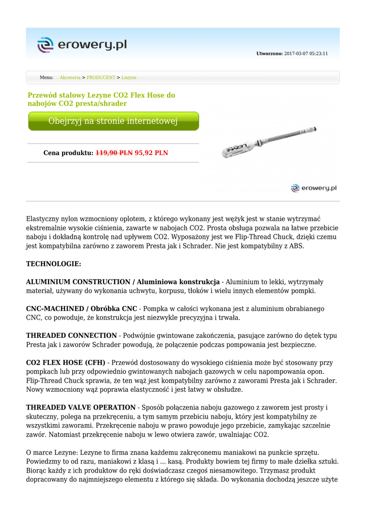 Utworzono: 2017-03-07 05:23:11 Menu: Akcesoria > PRODUCENT > Lezyne Przewód stalowy Lezyne CO2 Flex Hose do nabojów CO2 presta/shrader Obejrzyj na stronie internetowej Cena produktu: 119,90 PLN 95,92 PLN Elastyczny nylon wzmocniony oplotem, z którego wykonany jest wężyk jest w stanie wytrzymać ekstremalnie wysokie ciśnienia, zawarte w nabojach CO2. Prosta obsługa pozwala na łatwe przebicie naboju i dokładną kontrolę nad upływem CO2. Wyposażony jest we Flip-Thread Chuck, dzięki czemu jest kompatybilna zarówno z zaworem Presta jak i Schrader. Nie jest kompatybilny z ABS. TECHNOLOGIE: ALUMINIUM CONSTRUCTION / Aluminiowa konstrukcja - Aluminium to lekki, wytrzymały materiał, używany do wykonania uchwytu, korpusu, tłoków i wielu innych elementów pompki. CNC-MACHINED / Obróbka CNC - Pompka w całości wykonana jest z aluminium obrabianego CNC, co powoduje, że konstrukcja jest niezwykle precyzyjna i trwała. THREADED CONNECTION - Podwójnie gwintowane zakończenia, pasujące zarówno do dętek typu Presta jak i zaworów Schrader powodują, że połączenie podczas pompowania jest bezpieczne. CO2 FLEX HOSE (CFH) - Przewód dostosowany do wysokiego ciśnienia może być stosowany przy pompkach lub przy odpowiednio gwintowanych nabojach gazowych w celu napompowania opon. Flip-Thread Chuck sprawia, że ten wąż jest kompatybilny zarówno z zaworami Presta jak i Schrader. Nowy wzmocniony wąż poprawia elastyczność i jest łatwy w obsłudze. THREADED VALVE OPERATION - Sposób połączenia naboju gazowego z zaworem jest prosty i skuteczny, polega na przekręceniu, a tym samym przebiciu naboju, który jest kompatybilny ze wszystkimi zaworami. Przekręcenie naboju w prawo powoduje jego przebicie, zamykając szczelnie zawór. Natomiast przekręcenie naboju w lewo otwiera zawór, uwalniając CO2. O marce Lezyne: Lezyne to firma znana każdemu zakręconemu maniakowi na punkcie sprzętu. Powiedzmy to od razu, maniakowi z klasą i ... kasą. Produkty bowiem tej firmy to małe dziełka sztuki. Biorąc każdy z ich produktow do ręki doświadczasz czegoś niesamowitego. Trzymasz produkt dopracowany do najmniejszego elementu z którego się składa. Do wykonania dochodzą jeszcze użyte materiały - aluminium, karbon... ach :) Lezyne została założona 1 marca 2007 roku, przez byłego triathlonistę Mickiego Kozuscheka. Na początku Kozuschek wniósł na niemiecki rynek niedrogie, wysokiej jakości rowery i odzież rowerową. Obecnie firma Lezyne jest liderem branży akcesoriów rowerowych z liczną pulą nagradzanych produktów na całym świecie. Lezyne to połączenie miłości do kolarstwa i pasji do projektowania. Producent Lezyne Rodzaj Akcesoria Kolor Srebrny_#C0C0C0 Mimo dołożenia wszelkich starań nie gwarantujemy, że publikowane opisy i specyfikacje techniczne niezawierają uchybień lub błędów, które nie mogą jednak być podstawą do roszczeń. W przypadku jakichkolwiek wątpliwości, przed podjęciem decyzji prosimy o kontakt. Adres: www.erowery.pl Telefon: 605 515 185, 34 361 16 71 Email: [email protected]