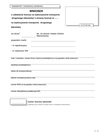 TRANSPORT TAKSÓWKĄ OSOBOWĄ WNIOSEK o udzielenie licencji na wykonywanie transportu drogowego taksówką/ o zmianę licencji nr....... na wykonywanie transportu drogowego DATOWNIK taksówką na okres1 lat, na obszar miasta Ostrów Mazowiecka, pojazdem marki: - nr rejestracyjny - nr nadwozia VIN imię i nazwisko- nazwa firmy/ nazwa przedsiębiorcy w przypadku osób prawnych siedziba przedsiębiorcy, adres do korespondencji, telefon kontaktowy/fax/e-mail, numer KRS (w przypadku osób prawnych), numer identyfikacji podatkowej NIP, ___________ numer boczny taksówki (nadawany przy złożeniu wniosku wraz z kompletem dokumentów) 1/3 W załączeniu przedkładam następujące wymagane przepisami prawa dokumenty: kserokopię aktualnych badań lekarskich i psychologicznych potwierdzającymi zdolność do wykonywania zawodu kierowcy, kserokopię zaświadczenia o ukończeniu szkolenia w zakresie transportu drogowego taksówką 2 potwierdzonego zdanym egzaminem lub wykazania się 5 letnią praktyką w wykonywaniu tego transportu , oświadczenie kierowców. stwierdzające niekaralność przedsiębiorcy, oraz zatrudnionych przez przedsiębiorcę kserokopię dowodu rejestracyjnego pojazdu z wpisem dopuszczenia do ruchu jako taksówki osobowej (w przypadku gdy przedsiębiorca nie jest właścicielem tego pojazdu – również dokument potwierdzający 3 prawo przedsiębiorcy do dysponowania pojazdem ), kserokopię legalizacji taksometru, 4 dowód uiszczenia opłaty za wydanie licencji w wysokości:_____________ zł . W przypadku kserokopii dokumentu wymagany jest jego oryginał do wg lądu W związku z prowadzoną działalnością w zakresie transportu drogowego taksówką wyrażam zgodę na przetwarzanie moich danych osobowych zgodnie z art. 23, ust. 1 pkt 2, 4, 5, ustawy z dnia 29 sierpnia 1997 r. o ochronie danych osobowych (Dz. U. z 1997r. Nr 133, poz. 883 ze zm.). Ostrów Mazowiecka, dnia podpis wnioskodawcy 1 2 3 4 na czas od 2 do 15 lat, od 16 do 30 lat, od 31 do 50 lat gdy wnioskodawca posiada co najmniej 5 letnią praktykę w zakresie wykonywania transportu drogowego taksówką osobową potwierdzoną zaświadczeniem o nieprzerwanym wykonywaniu działalności w zakresie zarobkowego przewozu osób taksówką w okresie ostatnich pięciu lat (stan na dzień składania wniosku) z Urzędu Skarbowego lub ZUS (jeżeli wystąpi przerwa, nie może być dłuższa niż 6 kolejnych miesięcy) oświadczenie o użyczeniu samochodu (do pobrania przy składaniu wniosku), wysokość opłaty określa § 2 ust. 1 pkt. 1) rozporządzenia ministra infrastruktury z dnia 4 grudnia 2007 r. w sprawie wysokości opłat za czynności administracyjne związane z wykonywaniem transportu drogowego oraz za egzaminowanie i wydanie certyfikatu kompetencji zawodowych (Dz. U. z 2007 r. Nr 235, poz. 1726). 2/3 Ostrów Mazowiecka, dnia .............................. OŚWIADCZENIE Ja niżej podpisana/y ........................................................................................................... zamieszkały ........................................................................................................................ legitymujący się dowodem osobistym nr ............................................................................ wydanym przez .................................................................................................................. nr PESEL ........................................................................................................................... oświadczam, że nie zostałam/em skazany prawomocnym wyrokiem sądu za przestępstwa umyślne: karne skarbowe, przeciwko bezpieczeństwu w komunikacji, mieniu, obrotowi gospodarczemu, wiarygodności dokumentów, ochronie środowiska lub warunkom pracy i płacy albo innym przepisom dotyczącym wykonywania zawodu oraz nie wydano w stosunku do mnie prawomocnego orzeczenia zakazującego wykonywania działalności gospodarczej w zakresie transportu drogowego. Oświadczam, że jestem świadoma/y odpowiedzialności karnej za złożenie fałszywego oświadczenia wynikającej z art. 233 Kodeksu Karnego. .............................................................. Czytelny podpis przedsiębiorcy 3/3