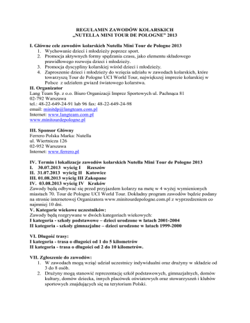 REGULAMIN ZAWODÓW KOLARSKICH „NUTELLA MINI TOUR DE POLOGNE” 2013 I. Główne cele zawodów kolarskich Nutella Mini Tour de Pologne 2013 1. Wychowanie dzieci i młodzieży poprzez sport. 2. Promocja aktywnych formy spędzania czasu, jako elementu składowego prawidłowego rozwoju dzieci i młodzieży. 3. Promocja dyscypliny kolarskiej wśród dzieci i młodzieży. 4. Zaproszenie dzieci i młodzieży do wzięcia udziału w zawodach kolarskich, które towarzyszą Tour de Pologne UCI World Tour, największej imprezie kolarskiej w Polsce z udziałem gwiazd światowego kolarstwa. II. Organizator Lang Team Sp. z o.o. Biuro Organizacji Imprez Sportowych ul. Pachnąca 81 02-792 Warszawa tel.: 48-22-649-24-91 lub 96 fax: 48-22-649-24-98 email: [email protected] Internet: www.langteam.com.pl www.minitourdepologne.pl III. Sponsor Główny Ferrero Polska Marka: Nutella ul. Wiertnicza 126 02-952 Warszawa Internet: www.ferrero.pl IV. Termin i lokalizacje zawodów kolarskich Nutella Mini Tour de Pologne 2013 I. 30.07.2013 wyścig I Rzeszów II. 31.07.2013 wyścig II Katowice III. 01.08.2013 wyścig III Zakopane IV. 03.08.2013 wyścig IV Kraków Zawody będą odbywać się przed przyjazdem kolarzy na metę w 4 wyżej wymienionych miastach 70. Tour de Pologne UCI World Tour. Dokładny program zawodów będzie podany na stronie internetowej Organizatora www.minitourdepologne.com.pl z wyprzedzeniem co najmniej 10 dni. V. Kategorie wiekowe uczestników: Zawody będą rozgrywane w dwóch kategoriach wiekowych: I kategoria - szkoły podstawowe – dzieci urodzone w latach 2001-2004 II kategoria - szkoły gimnazjalne – dzieci urodzone w latach 1999-2000 VI. Długość trasy: I kategoria - trasa o długości od 1 do 5 kilometrów II kategoria - trasa o długości od 2 do 10 kilometrów. VII. Zgłoszenie do zawodów: 1. W zawodach mogą wziąć udział uczestnicy indywidualni oraz drużyny w składzie od 3 do 8 osób. 2. Drużyny mogą stanowić reprezentację szkół podstawowych, gimnazjalnych, domów kultury, domów dziecka, innych placówek oświatowych oraz stowarzyszeń i klubów sportowych znajdujących się na terytorium Polski. 3. Skład drużyny może być mieszany, czyli w jednej drużynie mogą startować zarówno chłopcy, jak i dziewczęta. 4. Drużyna może mieć tylko jednego opiekuna. 5. Zgłoszenie do wyścigu następuje poprzez prawidłowe wypełnienie formularza zgłoszeniowego, który jest do pobrania na stronie internetowej Organizatora www.minitourdepologne.com.pl, należy wypełnić i odesłać do Organizatora na adres mailowy [email protected] lub faksem na numer 22-649 24 98. 6. Warunkiem udziału w wyścigu jest wyrażenie zgody rodziców lub opiekunów prawnych na udział dziecka, potwierdzone podpisem na formularzu zgłoszeniowym. 7. Podpisany oryginał formularza musi być przedstawiony i pozostawiony komisji sędziowskiej na 2 godziny przed startem. 8. Formularz powinien być wypełniony i podpisany bez wprowadzania w tekście poprawek. Brak podpisu, względnie wprowadzenie do tekstu formularza poprawek, podanie nieprawdziwych lub niepełnych danych w dokumencie wykluczy zawodnika z udziału w wyścigu lub spowoduje dyskwalifikację. 9. Administratorem danych osobowych uczestników zawodów Nutella Mini Tour de Pologne jest Organizator. 10. Zarówno uczestnicy indywidualni, jak i drużyny muszą spełnić wszystkie wymogi regulaminu, aby móc startować w zawodach kolarskich Nutella Mini Tour de Pologne 2012. VIII. Termin nadsyłania zgłoszeń: Termin przyjęcia zgłoszeń wypada na 19-07 -2013 r. IX. Lista dokumentów, potrzebnych w dniu zawodów: 1. Przed wystartowaniem w zawodach Nutella Mini Tour de Pologne należy przedłożyć: dokument potwierdzający dane osobowe dziecka np.: legitymacja szkolna lub inny dokument potwierdzający tożsamość dziecka podpisany formularz zgłoszeniowy wraz ze zgodą rodziców lub opiekunów prawnych zawodnika na udział w zawodach 2. Dokumenty powinny być przedłożone komisji sędziowskiej w oryginale. Organizator zastrzega sobie prawo weryfikacji przedstawionych dokumentów. X. Zasady rozgrywania wyścigów: Każdy z zawodników, czy to startujący indywidualnie czy też jako drużyna, może wybrać maksymalnie 1 wyścig (miasto), na trasie którego będzie startować. Jeśli uczestnik indywidualny lub też drużyna będą chcieli wystartować na większej ilości wyścigów, to mogą to zrobić - jednak ich wynik nie będzie liczony w klasyfikacji i nie mogą starać się o nagrody. 1. Każdy z uczestników zawodów otrzyma koszulkę kolarską wyścigu oraz numer startowy z chipem, który będzie uprawniał go do wstępu na teren zastrzeżony dla Organizatora i uczestników zawodów. Obowiązkowo należy zwrócić chip organizatorowi po wyścigu – w zamian każdy uczestnik otrzyma pakiet sportowy. 2. Zawody będą rozgrywane ze startu wspólnego. 3. W zawodach kolarskich prowadzone będą dwie klasyfikacje – indywidualna i drużynowa zarówno wśród I jak i II kategorii. Dodatkowo w klasyfikacji indywidualnej I i II kategorii funkcjonować będzie ranking dla chłopców oraz dla dziewczynek. 4. Zwycięzcą indywidualnym danego wyścigu będzie zawodnik, który minie metę jako pierwszy. 5. O zwycięstwie drużyny decyduje suma miejsc trzech najlepszych zawodników każdej drużyny - im niższa suma miejsc tym wyższe miejsce w klasyfikacji generalnej danego wyścigu (np. I miejsce - 1 pkt, II miejsce - 2 pkt itd.). 6. Przy równej ilości punktów w drużynie, decyduje lepsze miejsce zawodnika na mecie. 7. Drużyna będzie klasyfikowana, jeśli wyścig ukończy przynajmniej trzech zawodników wchodzących w jej skład. 8. Nad prawidłowym przebiegiem zawodów czuwać będzie Skład Sędziowski z Sędzią Głównym, jako Przewodniczącym Składu na czele. 9. Szkoły, placówki oświatowe, domy dziecka, stowarzyszenia lub kluby sportowe mogą wystawić więcej niż jedną drużynę. 10. Uczestnicy wyścigu są zobowiązani do pr
