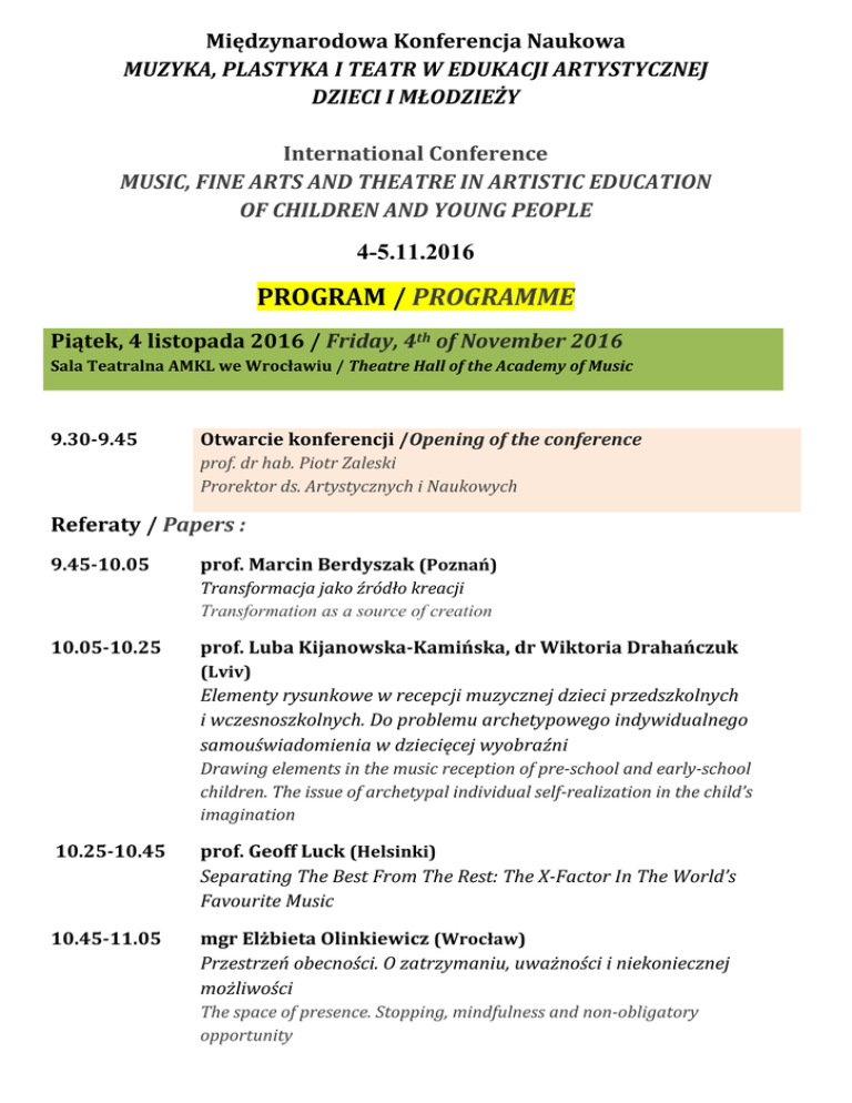 Międzynarodowa Konferencja Naukowa MUZYKA, PLASTYKA I TEATR W EDUKACJI ARTYSTYCZNEJ DZIECI I MŁODZIEŻY International Conference MUSIC, FINE ARTS AND THEATRE IN ARTISTIC EDUCATION OF CHILDREN AND YOUNG PEOPLE 4-5.11.2016 PROGRAM / PROGRAMME Piątek, 4 listopada 2016 / Friday, 4th of November 2016 Sala Teatralna AMKL we Wrocławiu / Theatre Hall of the Academy of Music 9.30-9.45 Otwarcie konferencji /Opening of the conference prof. dr hab. Piotr Zaleski Prorektor ds. Artystycznych i Naukowych Referaty / Papers : 9.45-10.05 prof. Marcin Berdyszak (Poznań) Transformacja jako źródło kreacji Transformation as a source of creation 10.05-10.25 prof. Luba Kijanowska-Kamińska, dr Wiktoria Drahańczuk (Lviv) Elementy rysunkowe w recepcji muzycznej dzieci przedszkolnych i wczesnoszkolnych. Do problemu archetypowego indywidualnego samouświadomienia w dziecięcej wyobraźni Drawing elements in the music reception of pre-school and early-school children. The issue of archetypal individual self-realization in the child’s imagination 10.25-10.45 prof. Geoff Luck (Helsinki) Separating The Best From The Rest: The X-Factor In The World’s Favourite Music 10.45-11.05 mgr Elżbieta Olinkiewicz (Wrocław) Przestrzeń obecności. O zatrzymaniu, uważności i niekoniecznej możliwości The space of presence. Stopping, mindfulness and non-obligatory opportunity 11.05-11.25 prof. Jan Peszek (Kraków) Teatr i aktor instrumentalny Bogusława Schäffera The theatre and instrumental actor by Bogusław Schäffer 11.30-12.00 przerwa / break 12.00-13.30 prof. Jan Peszek warsztaty teatralne / theater workshop Sala Koncertowa (budynek E) / Concert Hall (building E) 13.30-14.00 dyskusja / discussion 14.00-15.00 przerwa obiadowa / lunch break Referaty / Papers: 15.00-15.20 dr Joanna Jemielnik (Lublin) Wybrane aspekty komunikacji pedagogicznej uczniów i nauczycieli we współczesnej szkole muzycznej Selected aspects of pedagogical communication between students and teachers in the contemporary music school 15.20-15.40 dr hab. Małgorzata Kaniowska (Katowice) Interdyscyplinarny projekt artystyczny jako forma stymulacji wyobraźni i wrażliwości estetycznej dzieci i młodzieży The interdisciplinary art project as a form of stimulating the imagination and aesthetic sensitivity in children and young adults 15.40-16.00 dr Krystyna Miłobędzka (Poznań) Teatr i dziecko Theatre and the child 16.00-16.20 Samuel Alty (Wellington) Riding the Tsunami - Music education for younger years 16.30-17.00 prezentacja artystyczna / artistic presentation: Zespół Muzyki Dawnej CARMEN ALACRE The Early Music Ensemble CARMEN ALACRE Kierownictwo artystyczne / Artistic director: dr Małgorzata Szymańska Sala Teatralna (budynek A) / Theatre Hall (building A) 17.00-17.15 przerwa / break Referaty / Papers: 17.15-17.35 lic. Anna Siek (Gdańsk) Praca dziecka nad sobą – techniki aktorskie pomocne w kształtowaniu wrażliwości i rozwoju artystycznym dzieci i młodzieży Child’s work on himself – acting techniques useful in creating sensitivity and developement of children and young people 17.35-18.00 dr Joanna Nowicka (Katowice) Baśń muzyczno-baletowa w edukacji artystycznej dzieci i młodzieży A musical ballet tale in the art education of children and young adults 18.00-18.20 dyskusja / discussion 18.30-19.30 prezentacja artystyczna / artistic presentation: „Serce wiolonczeli” Teatru MAŁE CO NIECO „The Heart of Cello” by Theatre MAŁE CO NIECO Kierownictwo artystyczne / Artistic directors: mgr Gemma Dżugaj-Michalska, mgr Wiesław Michalski Sala Koncertowa (budynek E) / Concert Hall (building E) Sobota, 5 listopada 2016 / Saturday, 5 November 2016 Sala Teatralna AMKL we Wrocławiu / Theatre Hall of the Academy of Music Referaty / Papers: 9.30-9.50 prof. Aneta Głuch-Klucznik (Wrocław) „Gdy pofrunąć zechcesz ze mną…”. O edukacji studentów szkoły teatralnej i sztuce mówienia do dziecka “When you wish to fly with me…”. Educating theatre majors and the art of speaking to a child 9.50-10.10 dr Agnieszka Zawadzka oraz dr Edyta Lisek-Lubaś (Lublin) Co łączy grafikę japońską i huculski piec z warsztatami twórczymi dla dzieci? What is the link between Japanese graphic art, a Hutsul stove and creative workshops for children? 10.15-11.45 mgr Marta Jarosz i mgr Renata Bryjanowska warsztaty muzyczno-plastyczne (I grupa) musical-fine arts workshop (1st group) Sala 001 (budynek B) / Classroom No.001 (building B) 11.45-12.15 przerwa / break 12.15-13.45 mgr Marta Jarosz i mgr Renata Bryjanowska warsztaty muzyczno-plastyczne (II grupa) musical-fine arts workshop (2nd group) Sala 001 (budynek B) / Classroom No.001 (building B) Referaty / Papers: 12.15-12.35 prof. Carla Cuomo (Bologna) Kształcenie i kompetencje muzyczne w edukacji demokratycznej Music education and competences for democratic education 12.35-12.55 prof. Alena Tichá (Praha) Kształcenie głosu w chórach dziecięcych Voice education in children choirs 12.55-13.15 dr hab. Lidia Kataryńczuk-Mania (Zielona Góra) Odkrywać świat muzyki. Nowe trendy w elementarnej edukacji muzycznej Discovering the world of music. New trends in elementary musical education 13.15-14.15 przerwa obiadowa/ lunch break Referaty / Papers: 14.15-14.35 dr Amelia Golema (Wrocław) Wybrane elementy edukacji muzycznej w kształtowaniu kompetencji komunikacyjnej młodzieży z niepełnosprawnością intelektualną Selected elements of music education in the formation of communicative competence in adolescents with intellectual disabilities 14.35-14.55 mgr Małgorzata Kramarz (Wrocław) Sztuka dialogu w procesie kształcenia artystów muzyków The art of dialogue in the process of educating musicians 14.55-15.15 dr Maria Zawartko (Wrocław) Edukacja artystyczna dzieci i młodzieży na przykładzie Młodzieżowej Akademii Musicalowej The art education of children and young adults set by the example of the Youth Musical Academy (Młodzieżowa Akademia Musicalowa) 15.15-15.40 dyskus