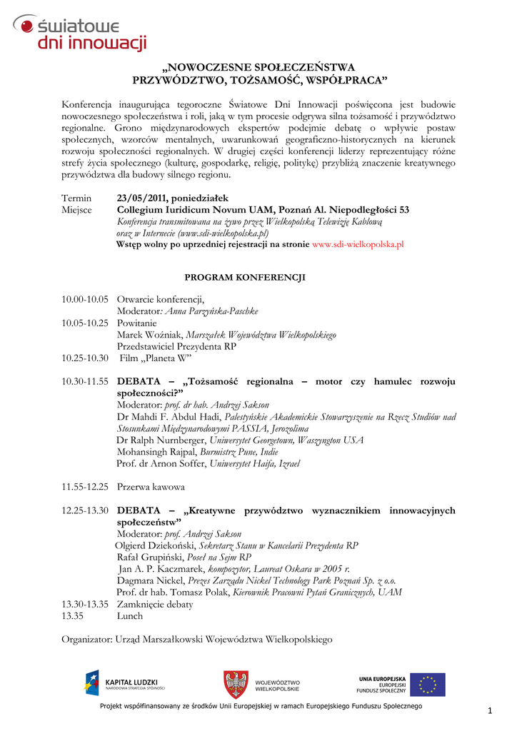 „NOWOCZESNE SPOŁECZEŃSTWA PRZYWÓDZTWO, TOŻSAMOŚĆ, WSPÓŁPRACA” Konferencja inaugurująca tegoroczne Światowe Dni Innowacji poświęcona jest budowie nowoczesnego społeczeństwa i roli, jaką w tym procesie odgrywa silna tożsamość i przywództwo regionalne. Grono międzynarodowych ekspertów podejmie debatę o wpływie postaw społecznych, wzorców mentalnych, uwarunkowań geograficzno-historycznych na kierunek rozwoju społeczności regionalnych. W drugiej części konferencji liderzy reprezentujący różne strefy życia społecznego (kulturę, gospodarkę, religię, politykę) przybliżą znaczenie kreatywnego przywództwa dla budowy silnego regionu. Termin Miejsce 23/05/2011, poniedziałek Collegium Iuridicum Novum UAM, Poznań Al. Niepodległości 53 Konferencja transmitowana na żywo przez Wielkopolską Telewizję Kablową oraz w Internecie (www.sdi-wielkopolska.pl) Wstęp wolny po uprzedniej rejestracji na stronie www.sdi-wielkopolska.pl PROGRAM KONFERENCJI 10.00-10.05 Otwarcie konferencji, Moderator: Anna Parzyńska-Paschke 10.05-10.25 Powitanie Marek Woźniak, Marszałek Województwa Wielkopolskiego Przedstawiciel Prezydenta RP 10.25-10.30 Film „Planeta W” 10.30-11.55 DEBATA – „Tożsamość regionalna – motor czy hamulec rozwoju społeczności?” Moderator: prof. dr hab. Andrzej Sakson Dr Mahdi F. Abdul Hadi, Palestyńskie Akademickie Stowarzyszenie na Rzecz Studiów nad Stosunkami Międzynarodowymi PASSIA, Jerozolima Dr Ralph Nurnberger, Uniwersytet Georgetown, Waszyngton USA Mohansingh Rajpal, Burmistrz Pune, Indie Prof. dr Arnon Soffer, Uniwersytet Haifa, Izrael 11.55-12.25 Przerwa kawowa 12.25-13.30 DEBATA – „Kreatywne przywództwo wyznacznikiem innowacyjnych społeczeństw” Moderator: prof. Andrzej Sakson Olgierd Dziekoński, Sekretarz Stanu w Kancelarii Prezydenta RP Rafał Grupiński, Poseł na Sejm RP Jan A. P. Kaczmarek, kompozytor, Laureat Oskara w 2005 r. Dagmara Nickel, Prezes Zarządu Nickel Technology Park Poznań Sp. z o.o. Prof. dr hab. Tomasz Polak, Kierownik Pracowni Pytań Granicznych, UAM 13.30-13.35 Zamknięcie debaty 13.35 Lunch Organizator: Urząd Marszałkowski Województwa Wielkopolskiego 1 „POSTAWA WOBEC NOWEGO I NOWYCH KLUCZEM DO BUDOWY KONSENSUSU SPOŁECZNEGO” Spotkanie poświęcone jest publicznej debacie o znaczeniu tolerancji, otwartości na inne społeczności oraz o kreatywnym wykorzystaniu tradycji, kultury i tożsamości regionalnej. Uczestnikami dyskusji są przedstawiciele nauk społecznych i cudzoziemcy, dla których nasz region stał się drugą ojczyzną, młodzież akademicka z Poznania oraz z subregionów (Kalisza, Konina, Leszna i Piły). Termin Miejsce 24/05/2011, wtorek Wyższa Szkoła Umiejętności Społecznych, ul. Głogowska 26, Poznań Konferencja transmitowana na żywo przez Wielkopolską Telewizję Kablową oraz w Internecie (www.sdi-wielkopolska.pl) Wstęp wolny po uprzedniej rejestracji na stronie www.sdi-wielkopolska.pl PROGRAM KONFERENCJI 10.00-10.05 Otwarcie konferencji Moderator: dr hab. Hanna Mamzer 10.05-10.15 Powitanie Leszek Wojtasiak, Wicemarszałek Województwa Wielkopolskiego DEBATA – „My i oni – kim jesteśmy w zglobalizowanym świecie?” Prof. Ryszard Cichocki, Uniwersytet im. A. Mickiewicza w Poznaniu Ivan Djurdjević, KKS Lech Poznań Killion Munyama, Sejmik Województwa Wielkopolskiego Muhamad Saeed Shekh Al Shabab, Stowarzyszenie Kultury Arabskiej w Poznaniu Stanisław Stankiewicz, Centralna Rada Romów w Polsce Prof. Magdalena Środa, Uniwersytet Warszawski 11.15-11.45 Pytania przedstawicieli młodzieżowych organizacji społeczno-politycznych zgromadzonych na sali oraz w uczelniach województwa wielkopolskiego (telemost) 11.45-12.15 Prezentacja kultury i kuchni arabskiej 10.15-11.15 DEBATA –„Innowacyjne myślenie a stosunek do Innego” Prof. Ryszard Cichocki, Uniwersytet im. A. Mickiewicza w Poznaniu Ivan Djurdjević, KKS Lech Poznań Killion Munyama, Sejmik Województwa Wielkopolskiego Muhamad Saeed Shekh Al Shabab, Stowarzyszenie Kultury Arabskiej w Poznaniu Stanisław Stankiewicz, Centralna Rada Romów w Polsce Prof. Magdalena Środa, Uniwersytet Warszawski 13.15-13.45 Pytania przedstawicieli młodzieżowych organizacji społeczno-politycznych zgromadzonych na sali oraz w uczelniach subregionów wielkopolskich (telemost) 13.45-13.55 Podsumowanie 13.55-14.00 Film „Planeta W” 14.00 Prezentacja kultury i kuchni żydowskiej 12.15-13.15 Organizator: Urząd Marszałkowski Województwa Wielkopolskiego 2 „SMART SPECIALIZATIONS – TOŻSAMOŚĆ MAŁYCH OJCZYZN” Strategia Europa 2020, poprzez inicjatywę przewodnią „Unia Innowacji” wskazuje na badania i innowacje jako priorytetowe kierunki rozwoju Europy w najbliższej przyszłości. W wymiarze regionalnym „Unia Innowacji” mobilizuje regiony do inteligentnego rozwoju poprzez przygotowanie strategii specjalizacji tzw. Smart Specializations Strategies. Czym są inteligentne specjalizacje i czy rzeczywiście potrzebujemy ich w Europie i w Wielkopolsce? W ramach V edycji Światowych Dni Innowacji zainicjujemy wielkopolską debatę na temat inteligentnych specjalizacji regionalnych. Termin Miejsce 25/05/2011, środa Sheraton Poznań Hotel ul. Bukowska 3/9 Konferencja transmitowana na żywo przez Wielkopolską Telewizję Kablową oraz w Internecie (www.sdi-wielkopolska.pl) Wstęp wolny po uprzedniej rejestracji na stronie www.sdi-wielkopolska.pl PROGRAM KONFERENCJI 10.00-10.10 Oficjalne otwarcie Leszek Wojtasiak, Wicemarszałek Województwa Wielkopolskiego 10.10-10.20 Wprowadzenie do konferencji Moderator: Elżbieta Książek PANEL – Dlaczego inteligentne specjalizacje? 10.20-10.50 Dlaczego Europa potrzebuje inteligentnie wyspecjalizowanych regionów? Przedstawiciel Komisji Europejskiej 10.50-11.20 Z perspektywy eksperta: Jak regiony mogą się wyspecjalizować? Prof. Philip Cooke, Uniwersytet Walijski w Cardiff, Wielka Brytania 11.20-11.40 Przerwa kawowa DEBATA - Jakie są drogi do określenia specjaliz