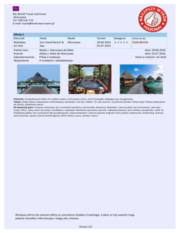 My World Travel and Event Warszawa Tel: 530 516 715 E-mail: [email protected] Oferta 1 Kierunek Malediwy Ari Atol Hotel Sun Island Resort & Spa Podróż tam: Powrót: Zakwaterowanie: Wyżywienie: Wylot z: Warszawa do Male Wylot z: Male do Warszawa Pokoj 2-osobowy H sniadania i obiadokolacje Wylot Warszawa Termin 28.06.2016 02.07.2016 Kategoria Cena za os. 5154.00 PLN dnia: 28.06.2016 dnia: 02.07.2016 Hotel w mieście: Ari Atoll Położenie: W południowym Atolu Ari o białym piasku i turkusowym morzu. Jest to kompleks składający się z bungalowów. Pokoje: pokoje Deluxe wyposażone w klimatyzację, wentylator, mini bar, telefon, TV, sejf, prysznic, suszarka do włosów. Pokoje Super-Deluxe wyposażone jak Deluxe, dodatkowo wanna. Do dyspozycji gości: recepcja, restauracje, bar na świeżym powietrzu, sala karaoke, kawiarnia, dyskoteka, 2 bary na plaży, bar przy basenie, salon gier, fryzjer, lekarz, sklep, basen przy plaży z brodzikiem, wodospad. Możliwość uprawiania sportów- siatkówka plażowa, tenis stołowy, koszykówka, rzutki. Za dodatkową opłatą- kurs nurkowania dla początkujących i zaawansowanych, centrum sportów wodnych (narty wodne, katamarany, windsurfing, skutery), korty tenisowe, squash, hala do bandmingtona, bilard, fitness, sauna, masaże, rowery. Niniejsza oferta nie stanowi oferty w rozumieniu Kodeksu Cywilnego, a dane w niej zawarte mają jedynie charakter informacyjny i mogą ulec zmianie. Strona 1/1 Powered by TCPDF (www.tcpdf.org)