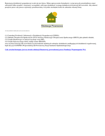 Rejestracja działalności gospodarczej wcale nie jest łatwa. Mimo uproszczenia formalności, wciąż przyszły przedsiębiorca musi odwiedzić kilka urzędów i instytucji, szczególnie, jeśli jego działalność wymaga dodatkowych koncesji lub zezwoleń. Aby ułatwić przejście przez cały proces rejestracji, przedstawiamy wszystkie niezbędne kroki do założenia własnej firmy. Aby własne przedsiębiorstwo działało zgodnie z prawem, musi zostać zgłoszone do: (1) Centralnej Ewidencji i Informacji o Działalności Gospodarczej (CEIDG), (2) Zakładu Ubezpieczeń Społecznych (ZUS) lub Kasy Rolniczego Ubezpieczenia Społecznego (KRUS) jako płatnik składek, (3) Urzędu Skarbowego (w którym uzyskuje swój NIP), (4) Urzędu Statystycznego (który nadaje numer REGON) oraz uzyskać koncesje lub zezwolenia na prowadzenie niektórych rodzajów działalności podlegających działalności regulowanej, bądź decyzji SANEPID (Wojewódzkiej lub Powiatowej Stacji Sanitarno-Epidemiologicznej). Cały artykuł dostępny jest na stronie edukacji finansowej, prowadzonej przez Fundację Wspomagania Wsi. Powered by TCPDF (www.tcpdf.org)