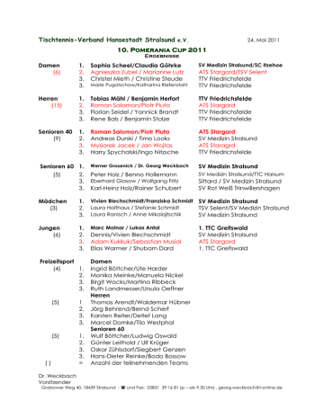 Tischtennis-Verband Hansestadt Stralsund e.V. 24. Mai 2011 10. 10. Pomerania Cup 201 2011 Ergebnisse Damen (6) SV Medizin Stralsund/SC Itzehoe 1. 2. 3. 3. Sophia Scheel/Claudia Göhrke Agnieszka Zubel / Marianne Lutz Christel Mieth / Christine Steude Marie Pugatschow/Katharina Riefenstahl ATS Stargard/TSV Selent TTV Friedrichsfelde TTV Friedrichsfelde Herren (15) 1. 2. 3. 3. Tobias Mähl / Benjamin Herfort Roman Salomon/Piotr Pluta Florian Seidel / Yannick Brandt Rene Bals / Benjamin Stolze TTV Friedrichsfelde ATS Stargard TTV Friedrichsfelde TTV Friedrichsfelde Senioren 40 (9) 1. 2. 3. 3. Roman Salomon/Piotr Pluta Andreas Durski / Timo Looks Mysiorek Jacek / Jan Wojtas Harry Spychalski/Ingo Nitzsche ATS Stargard SV Medizin Stralsund ATS Staragrd TTV Friedrichsfelde Werner Grosenick / Dr. Georg Weckbach SV Medizin Stralsund Peter Holz / Benno Hollemann SV Medizin Stralsund/TTC Harsum Eberhard Glasow / Wolfgang Fritz Karl-Heinz Holz/Rainer Schubert Sittard / SV Medizin Stralsund SV Rot Weiß Trinwillershagen Senioren 60 1. (5) 2. 3. 3. Mädchen (3) 1. 2. 3. Vivien Blechschmidt/Franziska Schmidt Laura Holthaus / Stefanie Schmidt Laura Ranisch / Anne Mikolajtschik SV Medizin Stralsund TSV Selent/SV Medizin Stralsund SV Medizin Stralsund Jungen (6) 1. 2. 3. 3. Marc Molnar / Lukas Antal 1. TTC Greifswald SV Medizin Stralsund ATS Stargard 1. TTC Greifswald Freizeitsport (4) 1. 2. 3. 3. (5) 1 2. 3. 3. (5) 1. 2. 3. 3. = () Dennis/Vivien Blechschmidt Adam Kukkuk/Sebastian Musial Elias Warmer / Shubam Dard Damen Ingrid Böttcher/Ute Harder Monika Meinke/Manuela Nickel Birgit Wacks/Martina Ribbeck Ruth Landmesser/Ursula Oeffner Herren Thomas Arendt/Waldemar Hübner Jörg Behrend/Bernd Scherf Karsten Reiter/Detlef Lang Marcel Domke/Tilo Westphal Senioren 60 Wulf Böttcher/Ludwig Oswald Günter Leithold / Ulf Krüger Oskar Zühlsdorf/Siegbert Genzen Hans-Dieter Reinke/Bodo Bossow Anzahl der teilnehmenden Teams Dr. Weckbach Vorsitzender Grabower Weg 40, 18439 Stralsund - und Fax: 03831 39 16 81 (p – ab 9.30 Uhr) , [email protected]