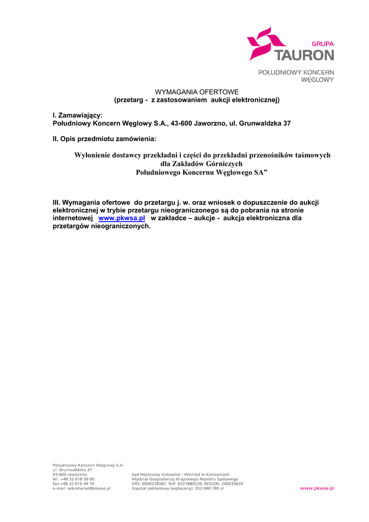 WYMAGANIA OFERTOWE (przetarg - z zastosowaniem aukcji elektronicznej) I. Zamawiający: Południowy Koncern Węglowy S.A., 43-600 Jaworzno, ul. Grunwaldzka 37 II. Opis przedmiotu zamówienia: Wyłonienie dostawcy przekładni i części do przekładni przenośników taśmowych dla Zakładów Górniczych Południowego Koncernu Węglowego SA” III. Wymagania ofertowe do przetargu j. w. oraz wniosek o dopuszczenie do aukcji elektronicznej w trybie przetargu nieograniczonego są do pobrania na stronie internetowej www.pkwsa.pl w zakładce – aukcje - aukcja elektroniczna dla przetargów nieograniczonych.