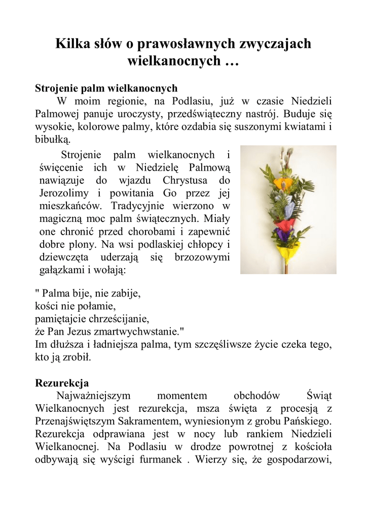 Kilka słów o prawosławnych zwyczajach wielkanocnych … Strojenie palm wielkanocnych W moim regionie, na Podlasiu, już w czasie Niedzieli Palmowej panuje uroczysty, przedświąteczny nastrój. Buduje się wysokie, kolorowe palmy, które ozdabia się suszonymi kwiatami i bibułką. Strojenie palm wielkanocnych i święcenie ich w Niedzielę Palmową nawiązuje do wjazdu Chrystusa do Jerozolimy i powitania Go przez jej mieszkańców. Tradycyjnie wierzono w magiczną moc palm świątecznych. Miały one chronić przed chorobami i zapewnić dobre plony. Na wsi podlaskiej chłopcy i dziewczęta uderzają się brzozowymi gałązkami i wołają: " Palma bije, nie zabije, kości nie połamie, pamiętajcie chrześcijanie, że Pan Jezus zmartwychwstanie." Im dłuższa i ładniejsza palma, tym szczęśliwsze życie czeka tego, kto ją zrobił. Rezurekcja Najważniejszym momentem obchodów Świąt Wielkanocnych jest rezurekcja, msza święta z procesją z Przenajświętszym Sakramentem, wyniesionym z grobu Pańskiego. Rezurekcja odprawiana jest w nocy lub rankiem Niedzieli Wielkanocnej. Na Podlasiu w drodze powrotnej z kościoła odbywają się wyścigi furmanek . Wierzy się, że gospodarzowi, który pierwszy wróci z rezurekcji, szybko i bujnie wzejdzie zboże i wyda obfite plony. Święcone Po powrocie z kościoła wszystkim wyjątkowo smakuje śniadanie, które ma charakter uroczysty. Najważniejszą potrawą jest święcone, czyli pokarm pokropiony przez kapłana wodą święconą w Wielką Sobotę . Jeszcze w XX w. na Podlasiu święcono pokarmy w domach prywatnych, zwłaszcza tych oddalonych od kościoła. Obecnie przynosi się do świątyni małe koszyczki z symboliczną ilością jaj, kiełbasy, chleba i soli. Koszyczki ze święconką ozdabia się zielonymi gałązkami borówek, czasami baziami i żółciutkimi kurczaczkami. W niektórych kościołach np. w Żarnowie koło Augustowa, po rezurekcji odbywa się uroczyste dzielenie się jajkiem i szynką, którymi kościelny częstuje wiernych. Na stole podczas śniadania wielkanocnego królują mięsa i wędliny (szczególnie biała kiełbasa), a także ciasta: mazurki – płaskie placki z bakaliami oraz baby - słodkie ciasta drożdżowe. Na Podlasiu tradycyjną potrawą był korowaj, kołacz pieczony z białej mąki pszennej lub żytniej, z dodatkiem jaj, mleka, cukru, ozdobiony ptaszkami lub laleczkami z ciasta. Koszyczek ze święconką zajmuje honorowe miejsce na świątecznym stole. Wielkanocne stoły zdobią także pisanki. W zależności od techniki wykonania zdobione jaja określa się różnymi nazwami: kraszanki, malowanki lub byczki, to jajka malowane na jeden kolor, zazwyczaj czerwony w barwniku lub w wywarze z łusek cebuli, Pisankami nazywa się jajka ozdobione jednobarwnym lub wielobarwnym deseniem naniesionym na jednolite tło przy współudziale wosku. Znane są jeszcze: rysowanki, skrobanki, nalepianki i wyklejanki. W Lipsku nad Biebrzą gospodynie "wyczarowują" prawdziwe dzieła sztuki. Posługują się techniką zdobienia jajek tzw. woskową. Polega ona na tym, że delikatne wzory maluje się na skorupkach jajek woskiem pszczelim, a potem jajko zanurza się w farbie. Jaja gęsie malowane motywami z ikon , są typowe dla wyznawców prawosławia, którzy licznie zamieszkują Białostocczyznę. Pisanek używa się też do szczególnej gry, spotykanej u nas tylko w okresie wielkanocnym. Gra nazywa się Walatka albo zabawa w bitki czy na wybitki. Rywalizujący gracze toczą pisanki po stole tak, by przy spotkaniu się stłukły. Można też uderzać swoją pisanką w jajko przeciwnika. Wygrywa ten, kto odbierze innym najwięcej pisanek. W naszym regionie do dziś zachował się zwyczaj obdarowywania pisankami. W poniedziałek wielkanocny grupa młodzieży chodzi od zagrody do zagrody po tzw. „wykupie” i zbiera od gospodarzy jajka, ciasto, mięso. Śpiewa się przy tym wesołą piosenkę, tzw. „Konopielkę”, opowiadającą o miłości, zalotach i przyszłym ślubie. Kawalerowie przychodzą do tych domów ,w których są panny na wydaniu. Na ziemi białostockiej praktykowany jest jeszcze zwyczaj zwany wołoczebne, wołoczonno, włóczebno, który polega na obdarowywaniu chrześniaków. Już z samego rana dzieci biegną do domu chrzestnych i proszą o podarunek. Śmigus-dyngus Oczywiście drugi dzień Wielkanocy, to tradycyjny śmigusdyngus. Chłopcy polewają dziewczęta wodą, gonią ,bawią się. Jest to miły zwyczaj, jeśli zachowa się umiar w oblewaniu wodą.