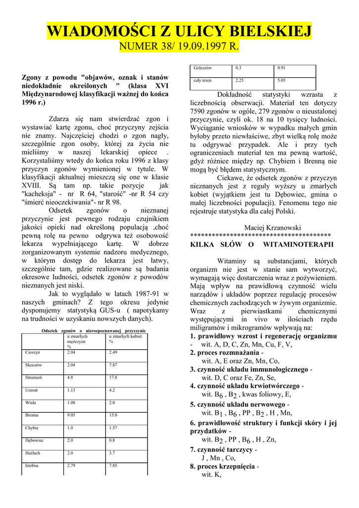 WIADOMOŚCI Z ULICY BIELSKIEJ NUMER 38/ 19.09.1997 R. Zgony z powodu "objawów, oznak i stanów niedokładnie określonych " (klasa XVI Międzynarodowej klasyfikacji ważnej do końca 1996 r.) Zdarza się nam stwierdzać zgon i wystawiać kartę zgonu, choć przyczyny zejścia nie znamy. Najczęściej chodzi o zgon nagły, szczególnie zgon osoby, której za życia nie mieliśmy w naszej lekarskiej opiece . Korzystaliśmy wtedy do końca roku 1996 z klasy przyczyn zgonów wymienionej w tytule. W klasyfikacji aktualnej mieszczą się one w klasie XVIII. Są tam np. takie pozycje jak "kacheksja" - nr R 64, "starość" -nr R 54 czy "śmierć nieoczekiwania"- nr R 98. Odsetek zgonów o nieznanej przyczynie jest pewnego rodzaju czujnikiem jakości opieki nad określoną populacją ,choć pewną rolę na pewno odgrywa też osobowość lekarza wypełniającego kartę. W dobrze zorganizowanym systemie nadzoru medycznego, w którym dostęp do lekarza jest łatwy, szczególnie tam, gdzie realizowane są badania okresowe ludności, odsetek zgonów z powodów nieznanych jest niski. Jak to wyglądało w latach 1987-91 w naszych gminach? Z tego okresu jedynie dysponujemy statystyką GUS-u ( napotykamy na trudności w uzyskaniu nowszych danych). Odsetek zgonów o nierozpoznawanej przyczynie u zmarłych u zmarłych kobiet mężczyzn % % Cieszyn 2.04 2.49 Skoczów 2.04 7.87 Strumień 4.8 17.8 Ustroń 1.13 4.2 Wisła 1.08 2.0 Brenna 9.05 15.0 Chybie 1.0 1.57 Dębowiec 2.0 0.8 Hażlach 2.0 3.7 Istebna 2.79 7.85 Goleszów 0.3 0.91 cały teren 2.25 5.05 Dokładność statystyki wzrasta z liczebnością obserwacji. Materiał ten dotyczy 7590 zgonów w ogóle, 279 zgonów o nieustalonej przyczynie, czyli ok. 18 na 10 tysięcy ludności. Wyciąganie wniosków w wypadku małych gmin byłoby przeto niewłaściwe, zbyt wielką rolę może tu odgrywać przypadek. Ale i przy tych ograniczeniach materiał ten ma pewną wartość, gdyż różnice między np. Chybiem i Brenną nie mogą być błędem statystycznym. Ciekawe, że odsetek zgonów z przyczyn nieznanych jest z reguły wyższy u zmarłych kobiet (wyjątkiem jest tu Dębowiec, gmina o małej liczebności populacji). Fenomenu tego nie rejestruje statystyka dla całej Polski. Maciej Krzanowski *************************************** KILKA SŁÓW O WITAMINOTERAPII Witaminy są substancjami, których organizm nie jest w stanie sam wytworzyć, wymagają więc dostarczenia wraz z pożywieniem. Mają wpływ na prawidłową czynność wielu narządów i układów poprzez regulację procesów chemicznych zachodzących w żywym organizmie. Wraz z pierwiastkami chemicznymi występującymi in vivo w ilościach rzędu miligramów i mikrogramów wpływają na: 1. prawidłowy wzrost i regenerację organizmu - wit. A, D, C, Zn, Mn, Cu, F, V, 2. proces rozmnażania wit. A, E oraz Zn, Mn, Co, 3. czynność układu immunologicznego wit. D, C oraz Fe, Zn, Se, 4. czynność układu krwiotwórczego wit. B6 , B2 , kwas foliowy, E, 5. czynność układu nerwowego wit. B1 , B6 , PP , B2 , H , Mn, 6. prawidłowość struktury i funkcji skóry i jej przydatków wit. B2 , PP , B6 , H , Zn, 7. czynność tarczycy J , Mn , Co, 8. proces krzepnięcia wit. K, 9. ochronę przed miażdżycą wit. A , C , E , Se, 10. czynność narządu wzroku wit. A , B2 Przy prawidłowej diecie i w warunkach fizjologicznych zapotrzebowanie na witaminy i mikroelementy powinno zostać pokryte. Niedobory powyższych składników obserwuje się w następujących sytuacjach: przy niewłaściwej diecie; alkoholicy, ludzie ze złych warunków socjalno- bytowych, pacjenci nieprzytomni, odżywiani pozajelitowo, przy zaburzeniach wchłaniania z przewodu pokarmowego: - stany zapalne żołądka, jelit, - choroby pasożytnicze, - immunologiczne tło zaburzeń wchłaniania a/ niedokrwistość złośliwa, b/ celiakia c/ sprue - niedomoga wydzielnicza trzustki, -choroby wątroby (niedobór kwasów tłuszczowych- wpływ na witaminy rozpuszczalne w tłuszczach, - stany poresekcyjne, niemożność wykorzystania witamin: - choroby wątroby (ze względu na zaburzenia magazynowania) a/ marskość, b/ toksyczne uszkodzenie wątroby, c/ wirusowe zapalenie wątroby (dotyczy witaminy B12 , Fe , Cu, - stosowanie antywitamin i antymetabolitów; Metotreksat , INH, niewystarczająca synteza witamin przez drobnoustroje jelitowe po antybiotykoterapii (wit. K, B1, PP, H,B12), zwiększone zapotrzebowanie: - intensywny wzrost organizmu, - ciąża, - laktacja, - okres rekonwalescencji, - przewlekłe choroby zakaźne ( gruźlica). W dzisiejszych czasach rzadko spotyka się izolowane niedobory witamin czy też pierwiastków. Oprócz przyczyn przytoczonych powyżej, często niedobór ogółu witamin i mikroelementów jest wynikiem stosowania niewłaściwej diety, co jest związane ze wzrastającym tempem naszego życia, kiedy to na dobieranie składników pokarmowych i odpowiednie przygotowywanie posiłków poświęcamy coraz mniej czasu. Badania przeprowadzone przez Instytut Żywności i Żywienia w Europie, USA i Polsce wykazały, że spożywamy zbyt mało witamin w stosunku do zapotrzebowania naszych organizmów. Również stosowanie różnego rodzaju używek sprzyja temu stanowi rzeczy. I tak na przykład u palaczy stwierdzono obniżenie zawartości witaminy C, natomiast nadużywanie kawy prowadzi do utraty magnezu, z kolei długotrwały stres powoduje obniżenie stężenia chromu. Na uwagę zasługuje fakt, że na występowanie niedoboru witamin i pierwiastków narażeni są w dużym stopniu ludzie w podeszłym wieku, a jest to związane z niewłaściwą zazwyczaj dietą, problemami z przyswajaniem pokarmów oraz nadmiernym przebywaniem w zamkniętych pomieszczeniach (niedobory wit. B,C,D,Fe). Wymienione powyżej fakty prowadzą do jednego wniosku: konieczne jest uzupełnienie codziennej diety preparatami wielowitaminowymi, najlepiej zawierającymi również mikroelementy. Szczegółowy zestaw dostępnych na polskim rynku preparatów wraz z 