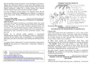 Bóg nie potrzebuje naszego przymierza. To my potrzebujemy przymierza z Bogiem, aby otrzymywać wsparcie w swoim życiu. Bóg oczekuje od nas zdemaskowania i zniszczenia naszych własnych bożków. Bóg bowiem jest Bogiem zazdrosnym i pragnie być w centrum naszego życia. Naszymi bożkami mogą być dzieci, praca zawodowa, pieniądze, ogródek… CHODZIĆ W DUCHU ŚWIĘTYM Czy masz świadomość swoich bożków? Czy zaprosiłeś Jezusa, aby był twoim Panem i Zbawicielem? Pomódl się: Jezu, dziękuję Ci, że pragniesz być po mojej stronie. Dziękuję za pragnienie przymierza z Tobą, Bogiem żywym. 18 czerwca 2016, sobota 2 Krn 24,17-25; Ps 89,4-34; Mt 6,24-34 CHODZIĆ W DUCHU ŚWIĘTYM, TO WZRASTAĆ W POKORZE 2 Krn 24, 20-22a Wtedy duch Boży zstąpił na Zachariasza, syna kapłana Jojady, który stanął przed ludem i rzekł: „Tak mówi Bóg: Dlaczego przekraczacie przykazania Pańskie? Dlatego się wam nie wiedzie! Ponieważ opuściliście Pana, i On was opuści”. Lecz oni sprzysięgli się przeciw niemu i ukamienowali go z rozkazu króla na dziedzińcu świątyni Pańskiej. Król Joasz zapomniał już o dobrodziejstwie, jakie wyświadczył mu ojciec Zachariasza, Jojada, i zabił jego syna. Okazuje się, ze człowiek szybko zapomina o otrzymanych dobrodziejstwach od Boga i ludzi. Potrzebujemy wzrastać we wdzięczności i pokorze, aby nie zniszczyć tego co otrzymaliśmy i co wypracowaliśmy. Brak pokory prowadzi do nieszczęść czego dramatycznie doświadczył król Joasz. Czy prosisz Jezusa o łaskę pokory? Czy jesteś człowiekiem wdzięczności? Pomódl się: Jezu proszę Cię o łaskę pokory i wdzięczności. Dziękuję za Twoje uniżenie. Opracowała: Jolanta Prokopiuk, korekta: Elżbieta i Grzegorz Kowalewscy, ilustracje: Marta Stańco, skład: Mariusz Stańco.Wspólnota Domowego Kościoła Ruchu Światło – Życie „On Jest” Teksty do medytacji znajdują się na stronie: www.strachocin.archidiecezja.wroc.pl. Istnieje możliwość codziennego otrzymywania Słowa Bożego (liturgia na każdy dzień) wraz z rozważaniami poprzez pocztę elektroniczną; wystarczy przesłać swój adres e-mail ze stosowną prośbą (zakładka Kontakt na www.gajkow.archidiecezja.wroc.pl) 12 czerwca 2016, niedziela 2 Sm 12,1-13; Ps 32,1-11; Ga 2,16-21; Łk 7,36-8,3 CHODZIĆ W DUCHU ŚWIĘTYM, TO WZRASTAĆ WE WRAŻLIWOŚCI NA SŁOWO PANA 2 Sm 12, 9-10 Czemu zlekceważyłeś słowo Pana, popełniając to, co złe w Jego oczach? Zabiłeś mieczem Chittytę Uriasza, a jego żonę wziąłeś sobie za małżonkę. Zamordowałeś go mieczem Ammonitów. Dlatego właśnie miecz nie oddali się od domu twojego na wieki, albowiem Mnie zlekceważyłeś, a żonę Uriasza Chittyty wziąłeś sobie za małżonkę. W Biblii istotą grzechu jest zlekceważenie słowa Pana, czyli nieposłuszeństwo mu. Król Dawid był nieposłuszny szóstemu przykazaniu – nie cudzołóż. Można mieć wiele swojego, a i tak ukraść innemu. Potrzebujemy wzrastać we wrażliwości na słowo Boże, aby być mu posłusznym. Potrzebujemy odkryć w swoim życiu, że słowo Boże jest dla mnie dobrem i błogosławieństwem. Jest dla mnie życiem. Jak często czytasz i słuchasz słowa Bożego? Czy robisz to codziennie? Pomódl się: Jezu, dziękuję Ci za Twoje słowo. Dziękuję za wzrastanie we wrażliwości na Twoje słowo. 13 czerwca 2016, poniedziałek 2 Krn 18,3-22; Ps 5,2-7; Mt 5,38-42 CHODZIĆ W DUCHU ŚWIĘTYM, TO DEMASKOWAĆ SWOJĄ CHCIWOŚĆ 1 Krl 21, 5-6 Niebawem przyszła do niego Izebel, jego żona, i zapytała go: „Czemu duch twój jest tak rozgoryczony, że nic nie jesz?” On zaś jej odpowiedział: „Bo rozmawiałem z Nabotem Jizreelitą. Powiedziałem mu: Sprzedaj mi twoją winnicę za pieniądze albo, jeśli chcesz, dam ci zamiast niej inną. A on powiedział: Nie dam tobie mojej winnicy”. Chciwość Achaba rodzi nieszczęście dla niego samego i dla innych. Chciwość to postawa, która sprawia, że rzeczy materialne stają się dla człowieka ważniejsze od osób. Chciwiec bardziej „kocha” pieniądze niż ludzi. W konsekwencji staje się niewrażliwy na los i na potrzeby bliźnich. Nie jest w stanie nikomu pomóc w bezinteresowny sposób. Chciwość nie tylko blokuje zdolność do miłości, lecz prowadzi do bolesnych konfliktów w relacjach międzyludzkich. Czy dostrzegasz w jakiś sposób chciwość w swoim życiu? Czy jesteś człowiekiem hojnym? Pomódl się: Jezu, dziękuję Ci, że pozwalasz mi demaskować w swoim życiu chciwość. Proszę Cię o łaskę bezinteresowności i hojności. 14 czerwca 2016, wtorek 2 Krn 18,25-34; Ps 51,3-16; Mt 5,43-48 CHODZIĆ W DUCHU ŚWIĘTYM, TO PODEJMOWAĆ WŁAŚCIWE DECYZJE 1 Krl 21, 25-26 Naprawdę nie było nikogo, kto by tak, jak Achab, zaprzedał się, aby czynić to, co jest złe w oczach Pana. Albowiem do tego skłoniła go jego żona, Izebel. Bardzo haniebnie postępował, służąc bożkom; zupełnie tak, jak to czynili Amoryci, których Pan wydziedziczył na rzecz Izraelitów. Człowiek może czynić dobro albo zło. Może „specjalizować się” w dobru albo złu. Nic nie bierze się samo z siebie. Ludzkie decyzje sprawiają, że człowiek czyni dobro albo zło. Często brak decyzji o zmianie, jest także decyzją, która niesie swoje konsekwencje. Potrzebujemy prosić Jezusa, aby nauczył nas podejmować właściwe decyzje i czynić dobro. Czy prosisz Jezusa, aby nauczył cię czynić dobro? Czy specjalizujesz się w dobrym? Pomódl się: Jezu, dziękuję Ci za otrzymane dobro i to, którym mogę obdarzać innych. 15 czerwca 2016, środa 2 Krl 2,1-14; Ps 31,20-24; Mt 6,1-6.16-18 CHODZIĆ W DUCHU ŚWIĘTYM, TO DZIEDZICZYĆ DARY 2 Krl 2, 12c-14 Ująwszy następnie swoje szaty, Elizeusz rozdarł je na dwie części i podniósł płaszcz Eliasza, który spadł od niego z góry. Wrócił i stanął nad brzegiem Jordanu. I wziął płaszcz Eliasza, który spadł od niego z góry, i uderzył w wody. Wtedy rzekł: „Gdzie jest Pan, Bóg Eliasza?