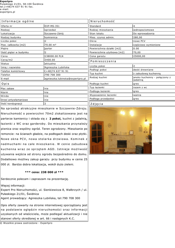 Expertpro Pułaskiego 21/01, 58-100 Świdnica tel.(+48)74 637 91 91 fax. e-mail: expertpro.pl Informacje ogólne Nieruchomość Oferta nr EXP-MS-351 Standard 4 Rodzaj sprzedaż Rodzaj mieszkania jednopoziomowe Lokalizacja Szczawno-Zdrój Stan lokalu Do wprowadzenia Rodzaj budynku kamienica Mies. czynsz admin. 280,00 Liczba pokoi 2 Okna nowe PCV Pow. całkowita [m2] 70.00 m² Instalacje częściowo wymienione Piętro parter Powierzchnia działki [m2] 0.00 Ilość pięter w budynku 2 Powierzchnia użytkowa [m2] 70,00 Cena 238000.00 PLN Cena garażu 25000,00 Cena/m2 3400.00 Status aktualna Imię i nazwisko Agnieszka Lubińska Telefon komórkowy (+48)74 637 91 91 Telefon 790 708 300 E-mail [email protected] Opis Pomieszczenia Liczba pokoi 2 Podłogi pokoi deski drewniane Typ kuchni z zabudową kuchenną Rodzaj kuchni aneks kuchenny - połączony z jadalnią Podłoga kuchni gres razem z wc Plac zabaw nie Typ łazienki Alarm nie Podłoga łazienki gres nie Wyposażenie łazienki wanna Drzwi antywłamaniowe nie Podłoga przedpokoi gres Ilość kondygnacji 2 Zdjęcia Winda Na sprzedaż atrakcyjne mieszkanie w Szczawnie-Zdroju. Nieruchomość o powierzchni 70m2 zlokalizowana jest na parterze kamienicy i składa się z 2 pokoi, kuchni z jadalnią, łazienki z WC oraz garderoby. Do mieszkania przynależy piwnica oraz wspólny ogród. Teren ogrodzony. Mieszkanie po remoncie: na ścianach gładzie, na podłogach deski oraz płytki. Nowe okna PCV, nowa stolarka drzwiowa. Kominek z nadmuchami na całe mieszkanie. W cenie zabudowa kuchenna wraz ze sprzętem AGD. Istnieje możliwość używania wejścia od strony ogrodu bezpośrednio do domu. Dodatkowo możliwy zakup garażu przy budynku w cenie 25 000 zł. Bardzo dobra lokalizacja, wokół dużo zieleni. *** cena: 238 000 zł *** Serdecznie polecam i zapraszam na prezentację. Więcej informacji: Expert Pro Nieruchomości, ul. Sienkiewicza 8, Wałbrzych / ul. Pułaskiego 21/01, Świdnica Agent prowadzący: Agnieszka Lubińska, tel:790 708 300 Opis oferty zawarty na stronie internetowej sporządzany jest na podstawie oględzin nieruchomości oraz informacji uzyskanych od właściciela, może podlegać aktualizacji i nie stanowi oferty określonej w art. 66 i następnych K.C. © Wszelkie prawa zastrzeżone - Expertpro