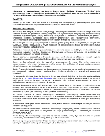 Regulamin bezpiecznej pracy pracowników Partnerów Biznesowych Informacja o występujących na terenie Grupy Azoty Zakłady Chemiczne "Police" S.A. zagrożeniach, oraz o sposobach postępowania w sytuacjach awaryjnych dla pracowników Partnerów Biznesowych działających na terenie zakładów. PAMIĘTAJ Wchodząc na teren zakładów jesteś zobowiązany do bezwzględnego przestrzegania przepisów i zasad bezpieczeństwa i higieny pracy obowiązujących na terenie Spółki. Przepisy porządkowe. Pracownicy firm obcych, zwani w dalszym ciągu niniejszej informacji Pracownikami mogą wchodzić na teren zakładu na podstawie ważnej przepustki. Do wyznaczonych miejsc pracy należy udać się najbliższą ogólnodostępną drogą zakładową korzystając z chodników i wyznaczonych przejść. Chodzenie skrótami, zwłaszcza przez obiekty przemysłowe jest kategorycznie zabronione. Kategorycznie zabrania się przechodzenia w miejscach do tego nie przeznaczonych. Pracownik jest zobowiązany przebywać w czasie godzin pracy tylko w miejscach, w których ma wykonywać pracę. Przebywanie w innych miejscach lub samowolne chodzenie po terenie zakładu lub do innych wydziałów jest zabronione. Podczas poruszania się po drogach zakładowych, zarówno pieszo jak i różnymi środkami lokomocji, obowiązują przepisy Kodeksu Drogowego. Maksymalna szybkość poruszania się pojazdów po drogach zakładowych wynosi 30 km/godz. Należy zachować szczególną ostrożność podczas wychodzenia z obiektów, których wyjścia prowadzą bezpośrednio na drogi zakładowe, place manewrowe oraz tory kolejowe. Należy podporządkować się do sygnałów przekazywanych przez kierownika manewrów wstrzymujących ruch kołowy i pieszy na obu kierunkach dróg zakładowych przed każdym wjazdem taboru kolejowego na niestrzeżony przejazd. Każdy Pracownik jest zobowiązany do bezwzględnego stosowania się do znaków bezpieczeństwa: ostrzegawczych, nakazu, zakazu, ewakuacyjnych i informacyjnych oraz sygnalizacji akustycznej i świetlnej. Po usłyszeniu dźwięku dzwonka i pojawieniu się sygnalizacji świetlnej na kominie węzła rozkładu surowców z Jednostki Biznesowej Pigmenty informujących o mającej nastąpić reakcji nie wchodź bądź wyjdź szybkim krokiem ze strefy zagrożenia, aby uniknąć ewentualnego kontaktu z wydzielającymi się kwaśnymi oparami z kominów. Wszyscy Pracownicy winni być wyposażeni przez swoje firmy w niezbędny indywidualny sprzęt ochrony, a w szczególności w sprzęt ucieczkowy w związku z zagrożeniem gazowym amoniakiem, ochrony słuchu, dróg oddechowych, głowy oraz inny sprzęt zabezpieczający w zależności od rodzaju prowadzonych prac (np. chroniący przed upadkiem z wysokości). Na terenie zakładu, w strefie produkcyjnej, obowiązuje bezwzględny nakaz poruszania się i wykonywania pracy w kaskach ochronnych a w obrębie instalacji z mediami niebezpiecznymi w okularach ochronnych. Kask powinien być oznaczony skrótem nazwy firmy, w której jest zatrudniony Pracownik. W zakładach obowiązuje zakaz wnoszenia i spożywania napojów alkoholowych lub innych środków podobnie działających. Na terenie wszystkich instalacji i budynków obowiązuje kategoryczny zakaz palenia tytoniu. Palenie tytoniu dozwolone jest tylko w miejscach do tego przeznaczonych i oznaczonych napisem „TU WOLNO PALIĆ”. Środki transportu wewnętrznego używane na terenie zakładu winny być oznakowane w sposób pozwalający na zidentyfikowanie firmy, która jest ich właścicielem. Zabrania się kategorycznie samowolnego manipulowania przy urządzeniach, zaworach, wyłącznikach lub innych częściach instalacji produkcyjnych lub elektrycznych. Strona 1/4 Z-3/IO-O-M03-01 Zmiany zatwierdził Pełnomocnik Dyrektora Generalnego ds. ZSZ – w/z Ireneusz Bielawski (podpis nieczytelny) 2014-10-24 Regulamin bezpiecznej pracy pracowników Partnerów Biznesowych Cały teren zakładu posiada uzbrojenie podziemne tj. sieć kablową, wodno-kanalizacyjną itp. O ile tego nie zapisano inaczej w umowach wykonywanie wszelkich prac ziemnych, zwłaszcza jakiekolwiek wykopy, wymagają pisemnego zezwolenia i uzgodnienia z odpowiednimi służbami na terenie Zakładów. O takie zezwolenie należy występować za pośrednictwem właściwych służb eksploatacyjnych. Wnoszenie, przewożenie, przechowywanie i eksploatacja na terenie zakładów pojemników, urządzeń i aparatów zawierających substancje promieniotwórcze wymaga pisemnego zezwolenia. Zagrożenia wynikające z warunków środowiska pracy Czynniki środowiska pracy szkodliwe dla zdrowia to przede wszystkim hałas, zapylenie oraz substancje niebezpieczne. We wszystkich obiektach gdzie występuje przekroczenie dopuszczalnych norm hałasu, zapylenia lub możliwość kontaktu z niebezpiecznymi substancjami chemicznymi należy bezwzględnie stosować odpowiedni sprzęt ochronny (ochronniki słuchu, maski przeciwpyłowe, odzież ochronną, przesłony twarzy, itp.). Przy wejściu do obiektów są wywieszone tablice informacyjne o obowiązku stosowania odpowiedniego sprzętu. Sposób postępowania w przypadku powstania pożaru lub zagrożenia gazowym amoniakiem Każdy, kto zauważy pożar, zagrożenie chemiczne lub inne zagrożenie (np. katastrofa budowlana) powinien powiadomić: współpracowników oraz wszystkie inne osoby znajdujące się w rejonie zagrożenia, Zakładową Straż Pożarną, Przełożonego. Alarmując telefonicznie należy podać: miejsce zdarzenia (zakład, wydział), rodzaj i rozmiar zagrożenia (pożar, zagrożenie chemiczne), numer obiektu i jego kondygnacje (numery obiektu wypisane są na żółtym tle czarnymi cyframi na zewnętrznych ścianach każdego obiektu), czy istnieje zagrożenie dla ludzi w miejscu zdarzenia lub w bezpośrednim sąsiedztwie, imię i nazwisko zgłaszającego, stanowisko służbowe, nazwę firmy zatrudniającej. Alarmując przy pomocy sygnalizacji pożarowe należy: zbić szybkę przycisku alarmowego. wcisną