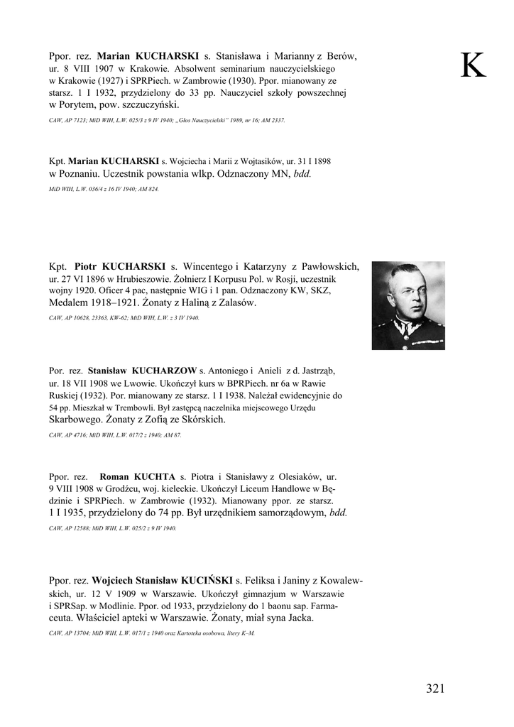 K Ppor. rez. Marian KUCHARSKI s. Stanisława i Marianny z Berów, ur. 8 VIII 1907 w Krakowie. Absolwent seminarium nauczycielskiego w Krakowie (1927) i SPRPiech. w Zambrowie (1930). Ppor. mianowany ze starsz. 1 I 1932, przydzielony do 33 pp. Nauczyciel szkoły powszechnej w Porytem, pow. szczuczyński. CAW, AP 7123; MiD WIH, L.W. 025/3 z 9 IV 1940; „Głos Nauczycielski” 1989, nr 16; AM 2337. Kpt. Marian KUCHARSKI s. Wojciecha i Marii z Wojtasików, ur. 31 I 1898 w Poznaniu. Uczestnik powstania wlkp. Odznaczony MN, bdd. MiD WIH, L.W. 036/4 z 16 IV 1940; AM 824. Kpt. Piotr KUCHARSKI s. Wincentego i Katarzyny z Pawłowskich, ur. 27 VI 1896 w Hrubieszowie. Żołnierz I Korpusu Pol. w Rosji, uczestnik wojny 1920. Oficer 4 pac, następnie WIG i 1 pan. Odznaczony KW, SKZ, Medalem 1918–1921. Żonaty z Haliną z Zalasów. CAW, AP 10628, 23363, KW-62; MiD WIH, L.W. z 3 IV 1940. Por. rez. Stanisław KUCHARZOW s. Antoniego i Anieli z d. Jastrząb, ur. 18 VII 1908 we Lwowie. Ukończył kurs w BPRPiech. nr 6a w Rawie Ruskiej (1932). Por. mianowany ze starsz. 1 I 1938. Należał ewidencyjnie do 54 pp. Mieszkał w Trembowli. Był zastępcą naczelnika miejscowego Urzędu Skarbowego. Żonaty z Zofią ze Skórskich. CAW, AP 4716; MiD WIH, L.W. 017/2 z 1940; AM 87. Ppor. rez. Roman KUCHTA s. Piotra i Stanisławy z Olesiaków, ur. 9 VIII 1908 w Grodźcu, woj. kieleckie. Ukończył Liceum Handlowe w Będzinie i SPRPiech. w Zambrowie (1932). Mianowany ppor. ze starsz. 1 I 1935, przydzielony do 74 pp. Był urzędnikiem samorządowym, bdd. CAW, AP 12588; MiD WIH, L.W. 025/2 z 9 IV 1940. Ppor. rez. Wojciech Stanisław KUCIŃSKI s. Feliksa i Janiny z Kowalewskich, ur. 12 V 1909 w Warszawie. Ukończył gimnazjum w Warszawie i SPRSap. w Modlinie. Ppor. od 1933, przydzielony do 1 baonu sap. Farma- ceuta. Właściciel apteki w Warszawie. Żonaty, miał syna Jacka. CAW, AP 13704; MiD WIH, L.W. 017/1 z 1940 oraz Kartoteka osobowa, litery K–M. 321 K Józef Wacław KUCZA s. Stefana i Balbiny z d. Szmajda, ur. 31 XII 1896 w Sieradzu. W l. 1914–1918 przebywał w Rosji, gdzie ukończył m.in. szkołę realną i kursy handlowo-buchalteryjne. Uczestnik wojny 1920 w 42 pp. Do 1938 urzędnik Ministerstwa Skarbu, od maja tego roku prezes Banku Rolnego. Odznaczony KKOOP, ZKZ. Żonaty z Marią z Karbowskich, miał syna Jerzego. MiD WIH, L.W. z 3 IV 1940 oraz Kartoteka osobowa, litery K–Ł; Dane WRK; AM 162. Por. Józef KUCZYŃSKI s. Jana i Antoniny ze Strzeleckich, ur. 9 IX 1909 w Zambrowie. Służył w 33 pp, od 1938 był dowódcą plutonu w baonie KOP „Krasne”. Żonaty z Eugenią z Dmochowskich, bdd. MiD WIH, L.W. z 5 IV 1940 oraz Kartoteka osobowa, litery K–M. Ppor. rez. Mieczysław KUCZYŃSKI s. Jana i Jadwigi z Tyszków, ur. 28 I 1906 w Krynicznej, na Ukrainie. Inżynier dróg i mostów, absolwent PW i SPRPiech. Ppor. mianowany ze starsz. 1 I 1936, przydzielony do 21 pp. Od 1936 pracował w Kierownictwie Robót Fortyfikacyjnych nr 13 SarnyKostopol. Żonaty z Reginą z Czernichowskich. CAW, AP 5756; MiD WIH, L.W. 022/1 z 9 IV 1940; AM 1502. Ppor. rez. Piotr KUCZYŃSKI s. Antoniego i Zofii z Jańców, ur. 28 IV 1901 w Matczu, pow. hrubieszowski. Uczestnik wojny 1920 w 50 pp. Absolwent Wydziału Matematyki UW i SPRPiech. w Śremie (1927). Ppor. mianowany w 1931, przydzielony do 23 pp. Nauczyciel gimnazjalny w Drohiczynie. Miał żonę Janinę i dwie córki. CAW, AP 5755; MiD WIH, L.W. 015/1 z 1940 oraz Kartoteka osobowa, litery K–M; M. Walczak, Ludzie nauki i nauczyciele podczas II wojny światowej. Por. rez. Stefan KUCZYŃSKI s. Franciszka i Marii, ur. 3 VII 1899 w Krakowie. Uczestnik wojny 1920 i III powstania śląskiego. Od 1924 w rez. Należał do 77 pp. Ukończył polonistykę na UW. W l. 1927–1930 był nauczy- cielem gimnazjum w Kielcach, później dyrektorem biura Zarządu Tow. „Zawiercie S.A.” w Warszawie. Odznaczony MN, Wstęgą Waleczności I kl., Medalem 1918–1921. Miał żonę Danutę. CAW, AP 19721, 10962, Odrz. 31 I 1938; MiD WIH, L.W. 029/3 z 13 IV 1940; AM 2747. Ppor. rez. Alfons Stefan KUDELSKI s. Władysława i Marii z Babskich, ur. 3 IX 1909 we Lwowie. W 1930 ukończył Państwową Szkołę Średnią Rolniczą w Bydgoszczy (1930) i SPRPiech. w Zambrowie (1932). Ppor. mianowany ze starsz. 1 I 1934, przydzielony do 32 pp. Mieszkał i pracował w Działdowie, był kierownikiem Towarzystwa Rolniczego, bdd. CAW, AP 6149; MiD WIH, L.W. 052/2 z 27 IV 1940. 322 K Pchor. rez. Jan KUDELSKI s. Ludwika, ur. 1918. Prawdopodobnie słuchacz SPSan. w Warszawie, bdd. MiD WIH, L.W. 059/1 z V 1940. Ppor. rez. Józef KUDELSKI s. Franciszka i Bronisławy z Książków, ur. 6 II 1913 w Działoszycach, pow. pińczowski. Ukończył Szkołę Handlową w Kielcach (1934) i dywizyjny kurs pchor. rez. przy 4 pp. Ppor. mianowany ze starsz. 1 I 1938, przydzielony do 2 pp Leg. Pracował jako urzędnik w Kielcach, bdd. CAW, AP 6150; MiD WIH, L.W. 025/3 z 9 IV 1940. Ppor. rez. Kazimierz KUDELSKI s. Bazylego i Marceli z Wójcików, ur. 29 VI 1908 we Lwowie. Ukończył gimnazjum we Lwowie i SPRPiech. w Rawie Ruskiej (1930). Ppor. mianowany ze starsz. 1 I 1933, przydzielony do 52 pp. Był urzędnikiem skarbowym w Zborowie, bdd. CAW, AP 6154; MiD WIH, L.W. 040/3 z 20 IV 1940. Kpt. Oskar Rudolf KUEHNEL (Kühnel) s. Leopolda i Eugenii z d. Kieseweter, ur. 14 VI 1897 w Brzeżanach, woj. tarnopolskie. Uczestnik wojny 1920. Do 1935 należał do korpusu oficerów artylerii OK IX, później służył w 10 pal. Odznaczony KW. Żonaty z Ireną z Majewskich, miał córkę Gizellę. MiD WIH, L.W. 017/1 z 1940; AM 1627. Pchor. Tadeusz Józef Wojciech KUFEL s. Józefa i Marii, ur. 24 III 1913. Podchorąży służby sanitarnej, bdd. MiD WIH, L.W. 059/1 z V 1940. Czesław Bolesław KUJAWSKI s. Józefa, ur. 1915, bdd. MiD WIH, L.W. z 2 IV 1940. 323 K Por. rez. Józef Leon KUKIOŁKA s. Piotra i Joanny z Guzów, ur. 9 IV 1898 w Sandomierzu. Żołnierz Legionów. Uczestnik wojny 1920. Służył w 19 i 26 pp. Po ukończeniu Szkoły Pchor.