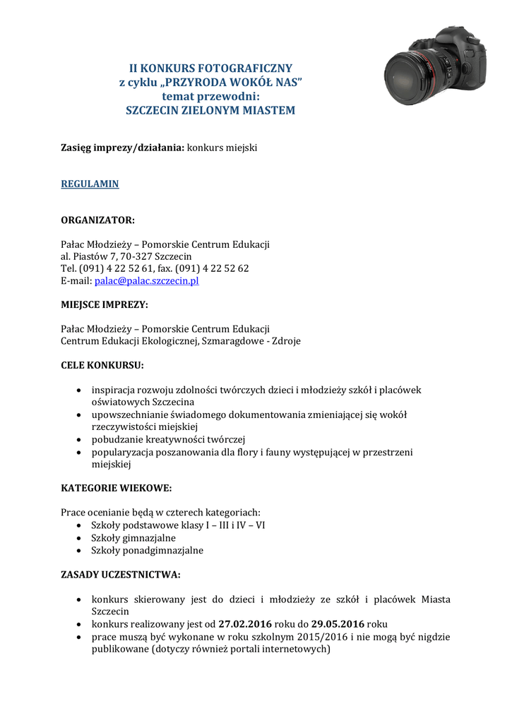 II KONKURS FOTOGRAFICZNY z cyklu „PRZYRODA WOKÓŁ NAS” temat przewodni: SZCZECIN ZIELONYM MIASTEM Zasięg imprezy/działania: konkurs miejski REGULAMIN ORGANIZATOR: Pałac Młodzieży – Pomorskie Centrum Edukacji al. Piastów 7, 70-327 Szczecin Tel. (091) 4 22 52 61, fax. (091) 4 22 52 62 E-mail: [email protected] MIEJSCE IMPREZY: Pałac Młodzieży – Pomorskie Centrum Edukacji Centrum Edukacji Ekologicznej, Szmaragdowe - Zdroje CELE KONKURSU: inspiracja rozwoju zdolności twórczych dzieci i młodzieży szkół i placówek oświatowych Szczecina upowszechnianie świadomego dokumentowania zmieniającej się wokół rzeczywistości miejskiej pobudzanie kreatywności twórczej popularyzacja poszanowania dla flory i fauny występującej w przestrzeni miejskiej KATEGORIE WIEKOWE: Prace ocenianie będą w czterech kategoriach: Szkoły podstawowe klasy I – III i IV – VI Szkoły gimnazjalne Szkoły ponadgimnazjalne ZASADY UCZESTNICTWA: konkurs skierowany jest do dzieci i młodzieży ze szkół i placówek Miasta Szczecin konkurs realizowany jest od 27.02.2016 roku do 29.05.2016 roku prace muszą być wykonane w roku szkolnym 2015/2016 i nie mogą być nigdzie publikowane (dotyczy również portali internetowych) zdjęcia nie mogą zawierać treści ogólnie uważanych za nieobyczajne autor może przedstawić tylko 2 swoje prace w formacie 20 cm na 30 cm każde zdjęcie powinno być oznakowane z tyłu logo autora (nie może być żadnych innych danych identyfikacyjnych na samym zdjęciu) po konkursie prace nie będą zwracane autorom, ponieważ pozostają do dyspozycji Organizatora prace powinny być przesłane lub dostarczone w zamkniętej kopercie, w której dodatkowo, oprócz prac autora powinna się znaleźć druga zamknięta koperta oznakowana jego logo i zawierająca dane osobowe uczestnika konkursu: imię i nazwisko, wiek, adres szkoły lub placówki, do której uczęszcza, telefon i email autora lub rodzica/opiekuna prawnego (w przypadku uczestnictwa niepełnoletniego), imię i nazwisko opiekuna artystycznego do prac musi być dołączona: zgoda autora na bezpłatne prezentowanie jego prac podczas wystawy pokonkursowej, oświadczenie, że autor jest wyłącznym właścicielem zdjęć (w przypadku uczestnika niepełnoletniego zgodę i oświadczenie podpisują jego rodzice/opiekunowie prawni)* OCENA: Organizator powoła jury złożone z doświadczonych artystów fotografików, plastyków oraz przewodników turystycznych pracujących z dziećmi i młodzieżą Nagrodę lun wyróżnienie otrzyma tylko jedna z nadesłanych prac autora, która uzyska najwyższą ocenę jury NAGRODY: Jury przyzna we wszystkich kategoriach po trzy równorzędne nagrody i trzy wyróżnienia. Wszyscy autorzy zdjęć otrzymają dyplomy uczestnictwa. Laureaci i wyróżnieni autorzy zdjęć zostaną poinformowani o miejscu i czasie odebrania nagród i wyróżnień oraz wystawie pokonkursowej drogą e - mailową lub telefoniczną. Informacja TERMINY I MIEJSCE: Prace należy dostarczyć osobiście lub drogą pocztową w nieprzekraczalnym terminie do 29.05.2016 roku, prace które wpłyną po tym terminie nie będą rozpatrywane. Wyniki konkursu ukażą się do dnia 8.06.2016 roku na stronie internetowej Pałacu Młodzieży – www.palac.szczecin.pl Uroczyste wręczenie nagród, wyróżnień i dyplomów oraz wystawa prac nastąpi dnia 18.06.2016 roku w Centrum Edukacji Ekologicznej, Szmaragdowe – Zdroje podczas imprezy kończącej Leśne Soboty z Pałacem Młodzieży w roku szkolnym 2015/2016. UWAGI KOŃCOWE: Prace należy przesłać lub dostarczyć na adres: sekretariat Pałacu Młodzieży – PCE lub Pracownia Turystyczno-Ekologiczna (sala 202) al. Piastów 7, 70-327 Szczecin informacje: tel. (091) 422-52-61, fax. (091) 422-52-62 e-mail: [email protected] Prace nie wystawione podczas imprezy kończącej Leśne Soboty, będzie można odebrać u Organizatora do 30.06.2016 roku, w godzinach pracy nauczycieli Pracowni Turystyczno - Ekologicznej Pałacu Młodzieży PCE w szczecinie, w Sali 202. * Zgodnie z art. 23 ust. 1 pkt. 1 ustawy z 29.08.1997 r. o ochronie danych osobowych (Dz. U. Nr 133, poz. 883 z późn. zm.) dane osobowe zawarte w karcie zgłoszenia wykorzystywane będą jedynie do celów statutowych Pałacu Młodzieży – PCE w Szczecinie. Zgłoszenie na konkurs, jest jednoznaczne z wyrażeniem zgody na publikację zdjęć uczestników na stronie internetowej oraz w publikacjach i folderach Pałacu Młodzieży. Niniejsza zgoda dotyczy wyłącznie publikacji w celach niekomercyjnych.