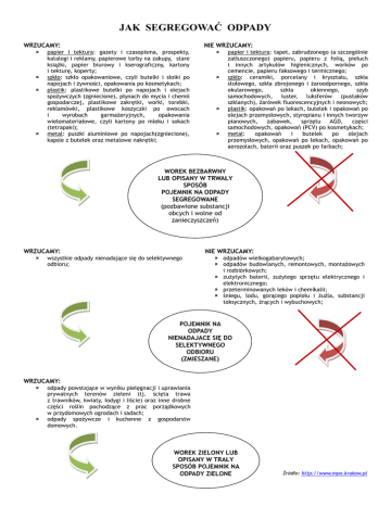 JAK SEGREGOWAĆ ODPADY WRZUCAMY: NIE WRZUCAMY: papier i tektura: gazety i czasopisma, prospekty, katalogi i reklamy, papierowe torby na zakupy, stare książki, papier biurowy i kserograficzny, kartony i tekturę, koperty; szkło: szkło opakowaniowe, czyli butelki i słoiki po napojach i żywności, opakowania po kosmetykach; plastik: plastikowe butelki po napojach i olejach spożywczych (zgniecione), płynach do mycia i chemii gospodarczej, plastikowe zakrętki, worki, torebki, reklamówki, plastikowe koszyczki po owocach i wyrobach garmażeryjnych, opakowania wielomateriałowe, czyli kartony po mleku i sokach (tetrapaki); metal: puszki aluminiowe po napojach(zgniecione), kapsle z butelek oraz metalowe nakrętki; papier i tektura: tapet, zabrudzonego (a szczególnie zatłuszczonego) papieru, papieru z folią, pieluch i innych artykułów higienicznych, worków po cemencie, papieru faksowego i termicznego; szkło: ceramiki, porcelany i kryształu, szkła stołowego, szkła zbrojonego i żaroodpornego, szkła okularowego, szkła okiennego, szyb samochodowych, luster, luksferów (pustaków szklanych), żarówek fluorescencyjnych i neonowych; plastik: opakowań po lekach, butelek i opakowań po olejach przemysłowych, styropianu i innych tworzyw pianowych, zabawek, sprzętu AGD, części samochodowych, opakowań (PCV) po kosmetykach; metal: opakowań i butelek po olejach przemysłowych, opakowań po lekach, opakowań po aerozolach, baterii oraz puszek po farbach; WOREK BEZBARWNY LUB OPISANY W TRWAŁY SPOSÓB POJEMNIK NA ODPADY SEGREGOWANE (pozbawione substancji obcych i wolne od zanieczyszczeń) WRZUCAMY: NIE WRZUCAMY: wszystkie odpady nienadające się do selektywnego odbioru; odpadów wielkogabarytowych; odpadów budowlanych, remontowych, montażowych i rozbiórkowych; zużytych baterii, zużytego sprzętu elektrycznego i elektronicznego; przeterminowanych leków i chemikalii; śniegu, lodu, gorącego popiołu i żużla, substancji toksycznych, żrących i wybuchowych; POJEMNIK NA ODPADY NIENADAJACE SIĘ DO SELEKTYWNEGO ODBIORU (ZMIESZANE) WRZUCAMY: odpady powstające w wyniku pielęgnacji i uprawiania prywatnych terenów zieleni (tj. ścięta trawa z trawników, kwiaty, łodygi i liście) oraz inne drobne części roślin pochodzące z prac porządkowych w przydomowych ogrodach i sadach; odpady spożywcze i kuchenne z gospodarstw domowych. WOREK ZIELONY LUB OPISANY W TRAŁY SPOSÓB POJEMNIK NA ODPADY ZIELONE Źródło: http://www.mpo.krakow.pl
