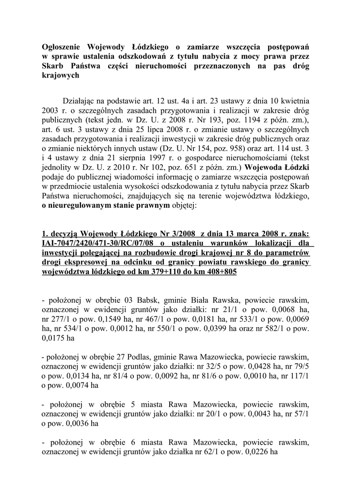 Ogłoszenie Wojewody Łódzkiego o zamiarze wszczęcia postępowań w sprawie ustalenia odszkodowań z tytułu nabycia z mocy prawa przez Skarb Państwa części nieruchomości przeznaczonych na pas dróg krajowych Działając na podstawie art. 12 ust. 4a i art. 23 ustawy z dnia 10 kwietnia 2003 r. o szczególnych zasadach przygotowania i realizacji w zakresie dróg publicznych (tekst jedn. w Dz. U. z 2008 r. Nr 193, poz. 1194 z późn. zm.), art. 6 ust. 3 ustawy z dnia 25 lipca 2008 r. o zmianie ustawy o szczególnych zasadach przygotowania i realizacji inwestycji w zakresie dróg publicznych oraz o zmianie niektórych innych ustaw (Dz. U. Nr 154, poz. 958) oraz art. 114 ust. 3 i 4 ustawy z dnia 21 sierpnia 1997 r. o gospodarce nieruchomościami (tekst jednolity w Dz. U. z 2010 r. Nr 102, poz. 651 z późn. zm.) Wojewoda Łódzki podaje do publicznej wiadomości informację o zamiarze wszczęcia postępowań w przedmiocie ustalenia wysokości odszkodowania z tytułu nabycia przez Skarb Państwa nieruchomości, znajdujących się na terenie województwa łódzkiego, o nieuregulowanym stanie prawnym objętej: 1. decyzją Wojewody Łódzkiego Nr 3/2008 z dnia 13 marca 2008 r. znak: IAI-7047/2420/471-30/RC/07/08 o ustaleniu warunków lokalizacji dla inwestycji polegającej na rozbudowie drogi krajowej nr 8 do parametrów drogi ekspresowej na odcinku od granicy powiatu rawskiego do granicy województwa łódzkiego od km 379+110 do km 408+805 - położonej w obrębie 03 Babsk, gminie Biała Rawska, powiecie rawskim, oznaczonej w ewidencji gruntów jako działki: nr 21/1 o pow. 0,0068 ha, nr 277/1 o pow. 0,1549 ha, nr 467/1 o pow. 0,0181 ha, nr 533/1 o pow. 0,0069 ha, nr 534/1 o pow. 0,0012 ha, nr 550/1 o pow. 0,0399 ha oraz nr 582/1 o pow. 0,0175 ha - położonej w obrębie 27 Podlas, gminie Rawa Mazowiecka, powiecie rawskim, oznaczonej w ewidencji gruntów jako działki: nr 32/5 o pow. 0,0428 ha, nr 79/5 o pow. 0,0134 ha, nr 81/4 o pow. 0,0092 ha, nr 81/6 o pow. 0,0010 ha, nr 117/1 o pow. 0,0074 ha - położonej w obrębie 5 miasta Rawa Mazowiecka, powiecie rawskim, oznaczonej w ewidencji gruntów jako działki: nr 20/1 o pow. 0,0043 ha, nr 57/1 o pow. 0,0036 ha - położonej w obrębie 6 miasta Rawa Mazowiecka, powiecie rawskim, oznaczonej w ewidencji gruntów jako działka nr 62/1 o pow. 0,0226 ha 2. decyzją Wojewody Łódzkiego Nr 1/2008 z dnia 25 stycznia 2008 r. znak: IAI-7047/2615/509-20/KC/07/08 o ustaleniu warunków lokalizacji dla inwestycji polegającej na rozbudowie drogi krajowej nr 8 do parametrów drogi ekspresowej na odcinku Piotrków Trybunalski – granica powiatu Rawa Mazowiecka (od km 324+772 do km 379+110) z wyłączeniem odcinka Wolbórz – Tomaszów Mazowiecki (od km 346+803,80 do km 356+700) - położonej w obrębie 3 Daszówka, gminie Moszczenica, powiecie piotrkowskim, oznaczonej w ewidencji gruntów jako działka nr 116/5 o pow. 1,1179 ha 3. decyzją Wojewody Łódzkiego Nr 19/2008 z dnia 5 grudnia 2008 r. o ustaleniu warunków lokalizacji dla przedsięwzięcia pn. „Rozbudowa drogi krajowej Nr 14 na odcinku Głowno – Stryków – granica miasta Łodzi – tj. od km 25+100 do km 41+774,14 (z wyłączeniem odcinka od km 32+642,62 do km 33+485,90 i od km 34+966,00 do km 35+205,00) - położonej w obrębie S-6 miasta Stryków, powiecie zgierskim, oznaczonej w ewidencji gruntów jako działka nr 1/10 o pow. 0,0255 ha 4. decyzją Wojewody Łódzkiego Nr 179/10 z dnia 30 czerwca 2010 r. znak: IA.II.7111-Ip-35.1830.PG/z/10 o zezwoleniu na realizację inwestycji drogowej polegającej na budowie autostrady A-1 na odcinku: granica województwa kujawsko-pomorskiego/łódzkiego, do węzła Stryków, od km 230+817 do km 295+850 – zadanie II, odcinek 2 od węzła „Sójki” – do węzła „Piątek” (wraz z węzłem), od km 245+800 do km 273+400, sekcja 2 od km 261+000 do km 270+000 wraz z infrastrukturą - położonej w obrębie 15 Łęki Łąki, gminie Krzyżanów, powiecie kutnowskim, oznaczonej w ewidencji gruntów jako działka nr 4 o pow. 0,5472 ha - położonej w obrębie 22 Pęcławice, gminie Piątek, powiecie łęczyckim, oznaczonej w ewidencji gruntów jako działki nr 83/2 o pow. 0,0729 ha, nr 82/2 o pow. 0,0437 ha - położonej w obrębie 9 Janków – Jankówek, gminie Piątek, powiecie łęczyckim, oznaczonej w ewidencji gruntów jako działka nr 160/2 o pow. 0,1370 ha - położonej w obrębie 16 Łęki Majątek, gminie Krzyżanów, powiecie kutnowskim, oznaczonej w ewidencji gruntów jako działki nr 11/6 o pow. 0,0068 ha, nr 11/3 o pow. 0,0962 ha, nr 27/1 o pow. 0,0509 ha, nr 28/2 o pow. 0,1784 ha, nr 29/1 o pow. 0,0764 ha - położonej w obrębie 15 Łęki Łąki, gminie Krzyżanów, powiecie kutnowskim, oznaczonej w ewidencji gruntów jako działki nr 229/5 o pow. 0,0621 ha, nr 221/2 o pow. 0,0417 ha, nr 222/2 o pow. 0,0347 ha - położonej w obrębie 29 Stefanów, gminie Krzyżanów, powiecie kutnowskim, oznaczonej w ewidencji gruntów jako działki nr 82 o pow. 0,1178 ha, nr 71/2 o pow. 0,0060 ha, nr 50/2 o pow. 0,0726 ha, nr 48/6 o pow. 0,0207 ha - położonej w obrębie 15 Łęki Łąki, gminie Krzyżanów, powiecie kutnowskim, oznaczonej w ewidencji gruntów jako działki: nr 96/1 o pow. 0,1521 ha, nr 96/2 o pow. 0,3572 ha - położonej w obrębie 15 Łęki Łąki, gminie Krzyżanów, powiecie kutnowskim, oznaczonej w ewidencji gruntów jako działka nr 95/3 o pow. 0,0981 ha - położonej w obrębie 20 Młogoszyn, gminie Krzyżanów, powiecie kutnowskim, oznaczonej w ewidencji gruntów jako działka nr 272/2 o pow. 0,1523 ha - położonej w obrębie 20 Młogoszyn, gminie Krzyżanów, powiecie kutnowskim, oznaczonej w ewidencji gruntów jako działka nr 277/2 o pow. 0,2221 ha - położonej w obrębie 20 Młogoszyn, gminie Krzyżanów, powiecie kutnowskim, oznaczonej w ewidencji gruntów jako działka nr 267/2 o pow. 0,1175 ha - położonej w obrębie 20 Młogoszyn, gminie Krzyżanów, powiecie kutnowskim, oznaczonej w ewidencji gruntów jako dzi