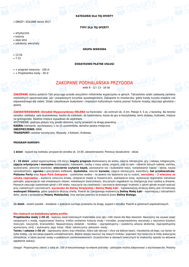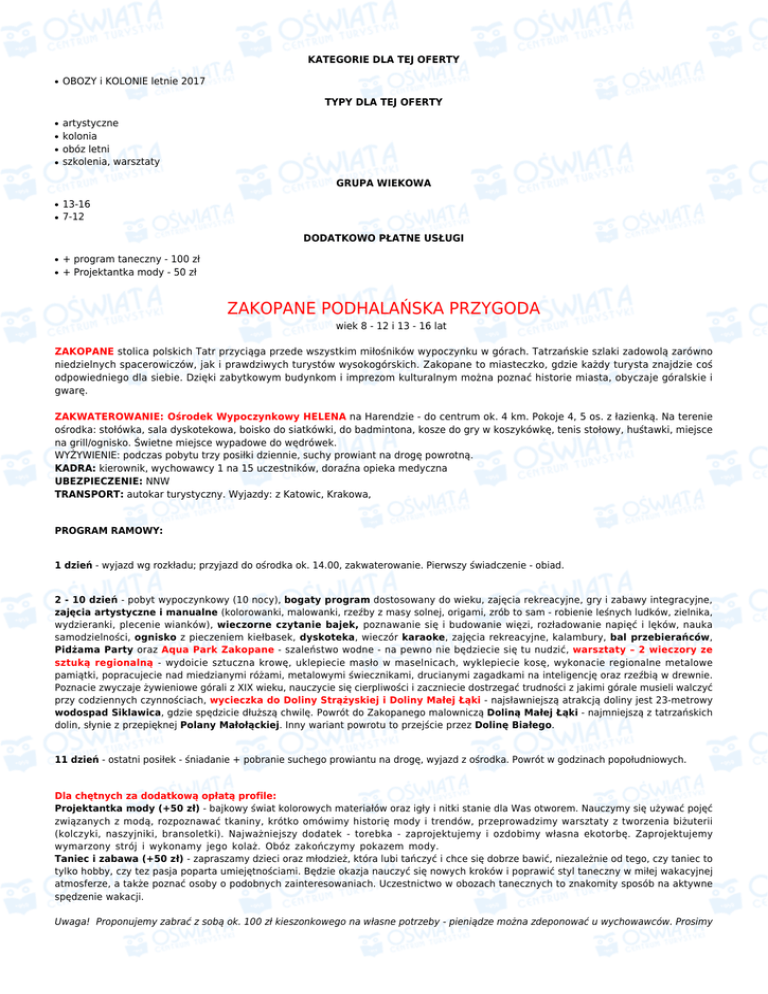 KATEGORIE DLA TEJ OFERTY ● OBOZY i KOLONIE letnie 2017 TYPY DLA TEJ OFERTY ● ● ● ● artystyczne kolonia obóz letni szkolenia, warsztaty GRUPA WIEKOWA ● ● 13-16 7-12 DODATKOWO PŁATNE USŁUGI ● ● + program taneczny - 100 zł + Projektantka mody - 50 zł ZAKOPANE PODHALAŃSKA PRZYGODA wiek 8 - 12 i 13 - 16 lat ZAKOPANE stolica polskich Tatr przyciąga przede wszystkim miłośników wypoczynku w górach. Tatrzańskie szlaki zadowolą zarówno niedzielnych spacerowiczów, jak i prawdziwych turystów wysokogórskich. Zakopane to miasteczko, gdzie każdy turysta znajdzie coś odpowiedniego dla siebie. Dzięki zabytkowym budynkom i imprezom kulturalnym można poznać historie miasta, obyczaje góralskie i gwarę. ZAKWATEROWANIE: Ośrodek Wypoczynkowy HELENA na Harendzie - do centrum ok. 4 km. Pokoje 4, 5 os. z łazienką. Na terenie ośrodka: stołówka, sala dyskotekowa, boisko do siatkówki, do badmintona, kosze do gry w koszykówkę, tenis stołowy, huśtawki, miejsce na grill/ognisko. Świetne miejsce wypadowe do wędrówek. WYŻYWIENIE: podczas pobytu trzy posiłki dziennie, suchy prowiant na drogę powrotną. KADRA: kierownik, wychowawcy 1 na 15 uczestników, doraźna opieka medyczna UBEZPIECZENIE: NNW TRANSPORT: autokar turystyczny. Wyjazdy: z Katowic, Krakowa, PROGRAM RAMOWY: 1 dzień - wyjazd wg rozkładu; przyjazd do ośrodka ok. 14.00, zakwaterowanie. Pierwszy świadczenie - obiad. 2 - 10 dzień - pobyt wypoczynkowy (10 nocy), bogaty program dostosowany do wieku, zajęcia rekreacyjne, gry i zabawy integracyjne, zajęcia artystyczne i manualne (kolorowanki, malowanki, rzeźby z masy solnej, origami, zrób to sam - robienie leśnych ludków, zielnika, wydzieranki, plecenie wianków), wieczorne czytanie bajek, poznawanie się i budowanie więzi, rozładowanie napięć i lęków, nauka samodzielności, ognisko z pieczeniem kiełbasek, dyskoteka, wieczór karaoke, zajęcia rekreacyjne, kalambury, bal przebierańców, Pidżama Party oraz Aqua Park Zakopane - szaleństwo wodne - na pewno nie będziecie się tu nudzić, warsztaty – 2 wieczory ze sztuką regionalną - wydoicie sztuczna krowę, uklepiecie masło w maselnicach, wyklepiecie kosę, wykonacie regionalne metalowe pamiątki, popracujecie nad miedzianymi różami, metalowymi świecznikami, drucianymi zagadkami na inteligencję oraz rzeźbią w drewnie. Poznacie zwyczaje żywieniowe górali z XIX wieku, nauczycie się cierpliwości i zaczniecie dostrzegać trudności z jakimi górale musieli walczyć przy codziennych czynnościach, wycieczka do Doliny Strążyskiej i Doliny Małej Łąki - najsławniejszą atrakcją doliny jest 23-metrowy wodospad Siklawica, gdzie spędzicie dłuższą chwilę. Powrót do Zakopanego malowniczą Doliną Małej Łąki - najmniejszą z tatrzańskich dolin, słynie z przepięknej Polany Małołąckiej. Inny wariant powrotu to przejście przez Dolinę Białego. 11 dzień - ostatni posiłek - śniadanie + pobranie suchego prowiantu na drogę, wyjazd z ośrodka. Powrót w godzinach popołudniowych. Dla chętnych za dodatkową opłatą profile: Projektantka mody (+50 zł) - bajkowy świat kolorowych materiałów oraz igły i nitki stanie dla Was otworem. Nauczymy się używać pojęć związanych z modą, rozpoznawać tkaniny, krótko omówimy historię mody i trendów, przeprowadzimy warsztaty z tworzenia biżuterii (kolczyki, naszyjniki, bransoletki). Najważniejszy dodatek - torebka - zaprojektujemy i ozdobimy własna ekotorbę. Zaprojektujemy wymarzony strój i wykonamy jego kolaż. Obóz zakończymy pokazem mody. Taniec i zabawa (+50 zł) - zapraszamy dzieci oraz młodzież, która lubi tańczyć i chce się dobrze bawić, niezależnie od tego, czy taniec to tylko hobby, czy tez pasja poparta umiejętnościami. Będzie okazja nauczyć się nowych kroków i poprawić styl taneczny w miłej wakacyjnej atmosferze, a także poznać osoby o podobnych zainteresowaniach. Uczestnictwo w obozach tanecznych to znakomity sposób na aktywne spędzenie wakacji. Uwaga! Proponujemy zabrać z sobą ok. 100 zł kieszonkowego na własne potrzeby - pieniądze można zdeponować u wychowawców. Prosimy o zabranie karty kolonijnej z numerem PESEL, odpowiedniej odzieży, obuwia, małego plecaka turystycznego. Możliwe terminy wyjazdu Lp. Data początku Data końca Cena Wolne miejsca 1. 08-07-2017 18-07-2017 1150 zł powyżej 5 miejsc 2. 18-07-2017 28-07-2017 1150 zł powyżej 5 miejsc 3. 28-07-2017 07-08-2017 1150 zł powyżej 5 miejsc