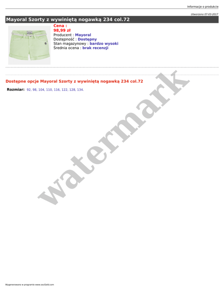 Informacje o produkcie Utworzono 07-03-2017 Mayoral Szorty z wywiniętą nogawką 234 col.72 Cena : 98,99 zł Producent : Mayoral Dostępność : Dostępny Stan magazynowy : bardzo wysoki Średnia ocena : brak recenzji er m ar k Dostępne opcje Mayoral Szorty z wywiniętą nogawką 234 col.72 w at Rozmiar: 92, 98, 104, 110, 116, 122, 128, 134. Wygenerowano w programie www.oscGold.com