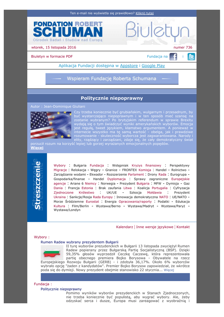 Ten e-mail nie wyświetla się prawidłowo? Kliknij tutaj wtorek, 15 listopada 2016 numer 736 Biuletyn w formacie PDF Fundacja na i Aplikacja Fundacji dostępna w Appstore i Google Play Politycznie niepoprawny Autor : Jean-Dominique Giuliani Czy trzeba koniecznie być grubiańskim, wulgarnym i przesadnym, by być wystarczająco niepoprawnym i w ten sposób mieć szansę na zostanie wybranym? Po brytyjskim referendum w sprawie Brexitu wydają się o tym świadczyć wyniki amerykańskich wyborów. Emocja jest regułą, tweet językiem, kłamstwo argumentem. A ponieważ w internecie wszystko ma tę samą wartość - obelga, jak i prawdziwe rozumowanie - skuteczność wyborcza jest zagwarantowana. Narody i elity, rządzący i zarządzani, zdaje się, że cały demokratyczny świat porzucił rozum na korzyść lepiej lub gorzej wyrażanych emocjonalnych popędów. Więcej Wybory : Bułgaria Fundacja : Wstępniak Kryzys finansowy : Perspektywy Migracje : Relokacja - Węgry - Granice - FRONTEX Komisja : Handel - Rolnictwo Zarządzanie wodami - Ekwador - Rozszerzenie Parlament : Drony Rada : Eurogrupa Gospodarka/finanse - Handel Dyplomacja : Sprawy zagraniczne Europejskie agencje : Ariane 6 Niemcy : Norwegia - Prezydent Bułgaria : MFW - Dymisja - Gaz Dania : Francja Estonia : Brak zaufania Litwa : Koalicja Portugalia : Cyfryzacja Szkocja Mołdawia : Prezydent Zjednoczone Królestwo : UK/UE Ukraina : Sankcje/Rosja Rada Europy : Innowacja demokratyczna NATO : UE/NATO Morze Śródziemne Eurostat : Energia Opracowania/raporty : Podatki - Edukacja Kultura : Film/Berlin - Wystawa/Berno - Wystawa/Madryt - Wystawa/Paryż Wystawa/Londyn Kalendarz | Inne wersje językowe | Kontakt Wybory : Rumen Radew wybrany prezydentem Bułgarii II turę wyborów prezydenckich w Bułgarii 13 listopada zwyciężył Rumen Radew popierany przez Bułgarską Partię Socjalistyczną (BSP). Dzięki 59,35% głosów wyprzedził Ceczkę Caczewę, która reprezentowała partię obecnego premiera Bojko Borysowa - Obywatele na rzecz Europejskiego Rozwoju Bułgarii (GERB) - i zdobyła 36,17%. Około 6% wyborców wybrało opcję "żaden z kandydatów". Premier Bojko Borysow zapowiedział, że wkrótce poda się do dymisji. Nowy prezydent obejmie stanowisko 22 stycznia... Więcej Fundacja : Politycznie niepoprawny Pomimo wyników wyborów prezydenckich w Stanach Zjednoczonych, nie trzeba koniecznie być populistą, aby wygrać wybory. Ale, żeby odzyskać serca i dusze, Europa musi zareagować z wyobraźnią i odwagą... Więcej Kryzys finansowy : Jesienne prognozy gospodarcze 2016: umiarkowany wzrost 9 listopada Komisja zaprezentowała swoje jesienne prognozy gospodarcze na 2016 rok. Umiarkowane tempo rozwoju gospodarczego w Europie powinno się w dalszym ciągu utrzymywać - w 2017 rok wzrost w Unii Europejskiej powinien sięgnąć 1,6%, a w 2018 1,8%. Komisja przewiduje także do 2018 wzrost inwestycji, inflacji i przyrost liczby miejsc pracy... Więcej Więcej Migracje : Raport na temat postępów unijnych programów relokacji 9 listopada Komisja przyjęła najświeższy raport na temat postępów programów w dziedzinie relokacji i awaryjnych przesiedleń oraz podsumowała działania prowadzone od 28 września 2016 roku. W październiku relokowano 1 212 osób, czyli o 160 mniej niż we wrześniu... Więcej Więcej Migranci: parlament odrzuca rewizję konstytucji 8 listopada węgierskiemu premierowi Viktorowi Orbanowi zabrakło 2 głosów do większości 2/3 koniecznej, by wprowadzić do węgierskiej konstytucji zapis o nielegalności relokacji uchodźców na Węgry przez Unię Europejską... Więcej Przedłużenie kontroli na granicach wewnętrznych Schengen 11 listopada Rada przyjęła propozycję Komisji dotyczącą przedłużenia kontroli na niektórych wewnętrznych granicach strefy Schengen - w Niemczech, Austrii, Szwecji, Danii i w Norwegii - o dodatkowe 3 miesiące... Więcej Pierwsze posiedzenie europejskiej sieci straży przybrzeżnej 8 listopada odbyło się 1. spotkanie gromadzące europejskie straże przybrzeżne i inne instytucje oraz organizmy zaangażowane w ochronę morskich granic... Więcej Więcej Komisja : Modyfikacja instrumentów ochrony handlu 9 listopada Komisja Europejska zaproponowała modyfikację legislacji antydumpingowej Unii Europejskiej i wzmocnienie jej instrumentów ochrony handlu, aby dostosować je do bieżących realiów, takich jak znaczące zakłócenia rynkowe występujące w gospodarkach niektórych partnerów handlowych... Więcej Zwiększenie budżetu na promocję produktów rolnych Komisja przyjęła strategię promocji unijnych produktów rolnych na 2017 rok. Europejscy producenci dysponować będą zwiększonym budżetem 133 mln euro na promocję swoich produktów rolnych zarówno w jak i poza Unią oraz na dalsze poszukiwania nowych rynków... Więcej Międzynarodowe zarządzanie oceanami - wkład Unii 10 listopada Komisja oraz Wysoka Przedstawicielka Unii do Spraw Zagranicznych i Polityki Bezpieczeństwa przyjęli wspólny komunikat, w którym zaproponowano działania na rzecz bezpieczeństwa, ochrony i czystości oceanów oraz zrównoważonego zarządzania nimi... Więcej Podpisanie protokołu akcesji Ekwadoru do porozumienia handlowego UEKolumbia/Peru 11 listopada Unia Europejska podpisała protokół akcesji Ekwadoru do porozumienia handlowego UE-Kolumbia/Peru. Obniżki ceł będą wprowadzane stopniowo przez 17 lat... Więcej Więcej Konsolidacja stabilności w Europie Południowo-Wschodniej 9 listopada Komisja przyjęła swoje doroczne raporty, które śledzą postępy reform politycznych i gospodarczych w krajach Bałkanów Zachodnich oraz w Turcji... Więcej Parlament : Deputowani Komisji Transportu za projektem przepisów w sprawie dronów 10 listopada Komisja Transportu i Turystyki zmodyfikowała oraz przyjęła projekt uaktualniający europejskie przepisy dotyczące lotnictwa cywilnego, aby zapanować nad pojawiającymi się zagrożeniami. Zaktualizowane rozporządzenie wp
