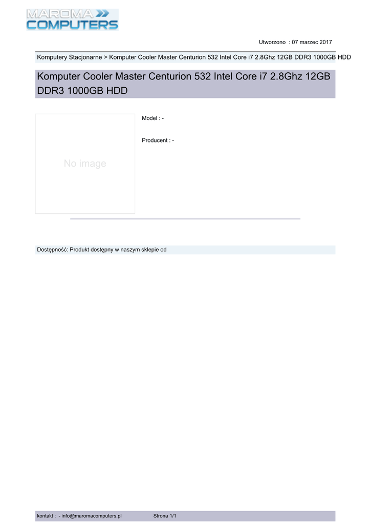 Utworzono : 07 marzec 2017 Komputery Stacjonarne > Komputer Cooler Master Centurion 532 Intel Core i7 2.8Ghz 12GB DDR3 1000GB HDD Komputer Cooler Master Centurion 532 Intel Core i7 2.8Ghz 12GB DDR3 1000GB HDD Model : - s r te Producent : - No image C a Dostępność: Produkt dostępny w naszym sklepie od m ro a M kontakt : - [email protected] Strona 1/1 m o u p