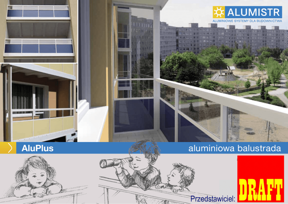 AluPlus aluminiowa balustrada systemy przeszklenia balkonów i loggii www.alumistr.cz Przedstawiciel: Charakterystyka Konstrukcja aluminiowej balustrady opiera się na ramowym systemie AluPlus. Tworzą go profile aluminiowe z rowkiem okuciowym do wypełnienia w postaci bezpiecznego szkła lub wysokociśnieniowych płyt z laminatu w różnych odcieniach i wzorach. Balustrada produkowana jest zawsze na podstawie zamówienia inwestora. System oferuje różnorodne rozwiązania techniczne, które można wzajemnie kombinować i łączyć. Konstrukcja przeznaczona jest do dodatkowego zaszklenia balkonu, lodżii i półlodżii. Do dodatkowego zaszklenia można zastosować ramowy system przesuwny AluPlus lub AluCombi. Nadają się do tego również bezramowe systemy AluVista lub AluVerso. Niezależna konstrukcja aluminiowych balustrad z kolorowym wypełnieniem wpływa na atrakcyjny wygląd budynku i zapewnia bezpieczne użytkowanie balkonu. Zalety •kompleksowość dostawy •szybki montaż •możliwość wyboru kolorystyki ram i wypełnienia •użycie materiałów nierdzewnych •lekka konstrukcja •pomiary i montaż wykonywane przez wyszkolone firmy •konstrukcja balustrady sprawdzana przez specjalistę w dziedzinie stabilności Opis techniczny Balustrada zbudowana jest z aluminiowych profili 50 × 30 mm z rowkiem okuciowym. Wypełnienie o grubości 4–9 mm umieszczone jest w rowku profilu, wyposażonym we wkładki dystansujące, uszczelnione z każdej strony silikonem. Poszczególne elementy balustrady połączone są połączeniami śrubowymi. Rama z wmontowanym wypełnieniem dzielona jest przez pionowe poprzeczki z aluminium zgodnie z życzeniem inwestora lub możliwościami technicznymi otworu budowlanego. Wypełnienie w górnej części balustrady można przedzielić poziomym tzw. wizjerami z przeźroczystego szkła bezpiecznego. W dolnej części ramy znajdują się otwory drenażowe odprowadzające wodę. Materiały •profile ze stopów aluminum w standardowej wersji kolorystycznej biały komaxit lub srebrny elox (inne kolory z palety RAL na zamówienie) •wypełnienie ze szkła bezpiecznego 3.3.1 z przeźroczystą, mleczną lub kolorową folią i wysokociśnieniowych płyt laminatowych MAX Exterior spełniające normy w zakresie odporności uderzeniowej i ogniowej •elementu montażowe i kotwiczące wykonane z materiałów nierdzewnych Dane techniczne •maksymalna długość balustrady 7 m •ciężar: powierzchniowy 18 kg/m2 (dla wypełnienia 4 mm) Balkon: balustrada aluminiowa wraz z bocznym zaszkleniem – wariant wykonania: Wizjer ze szkła przeźroczystego + wypełnienie ze szkła mlecznego Poręcz profil 100×50×5 Wypełnienie balustrady (szkło) Certyfikacja Certyfikat produktu: nr 02.478.917/10/07/02/0 wydany przez TÜV SÜD Czech s.r.o., Novodvorská 994, Praha 4 Balustrada w połączeniu ze szkłem bezpiecznym z folią 3.3.1 (Conex 3.3.1) i MAX Exterior wielokrotnie przeszła testy pożarowe i ogniowe, które poświadczone są przez certyfikaty wydane przez Centrum inżynierii budowlanej S.A., Praga, zakład Zlin (Centrum stavebního inženýrství, Praha, pracoviště Zlín). Aktualne certyfikaty dostępne na stronie www.alumistr.cz. Informacje handlowe i dotyczące dostawy Kraj pochodzenia: Szwecja, produkcja Republika Czeska Realizacja zamówienia: przed podpisaniem umowy technik firmy montażowej przeprowadzi bezpłatne pomiary, kontrolę stanu części nośnej i opracuje kompleksową ofertę włączając w to wycenę Termin dostawy: zgodnie z umową o dzieło Termin gwarancyjny: zgodnie z wymaganiami prawa W ramach kompleksowej dostawy dla całego domu okres gwarancyjny ulega przedłużeniu do 60 miesięcy Żywotność: min. 20 lat, przewidywana ok. 50 lat Transport: zapewnia dostawca po uzgodnieniu z zamawiającym AluPlus System aluminiowej balustrady w przekroju Profil balustrady Poprzeczka dzieląca Wypełnienie balustrady (MAX Exterior) Profil balustrady Listwa kryjąca z otworami odpływowymi Podłoga Stopka zregulowaną wysokością Pokrycie blaszane – blacha aluminiowa Kotwa chemiczna Konsola nośna aluminiowa balustrada Poręcz blaszane z blachy aluminiowej Lodżia: balustrada aluminiowa – wariant wykonania: Wizjer – szkło przeźroczyste + wypełnienie MAX Exterior Pokrycie blaszane z blachy aluminiowej Słupek narożny (maszt) profil 100×50×2 Wypełnieni: szkło (Float 4 mm) Poręcz profil 100×50×2 Wypełnienie: szkło bezpieczne z przeźroczystą folią3.3.1 Wypełnienie: szkło bezpieczne z folią mleczną 3.3.1 Pokrycie blaszane z blachy aluminiowej Poręcz balustrady profil 100×50×2 Wizjery Wypełnienie ze szkła bezpiecznego z przeźroczystą folią 3.3.1 Wypełnienie: wysokociśnieniowa płyta z laminatu (MAX Exterior 4 mm) Pokrycie blaszane z blachy aluminiowej