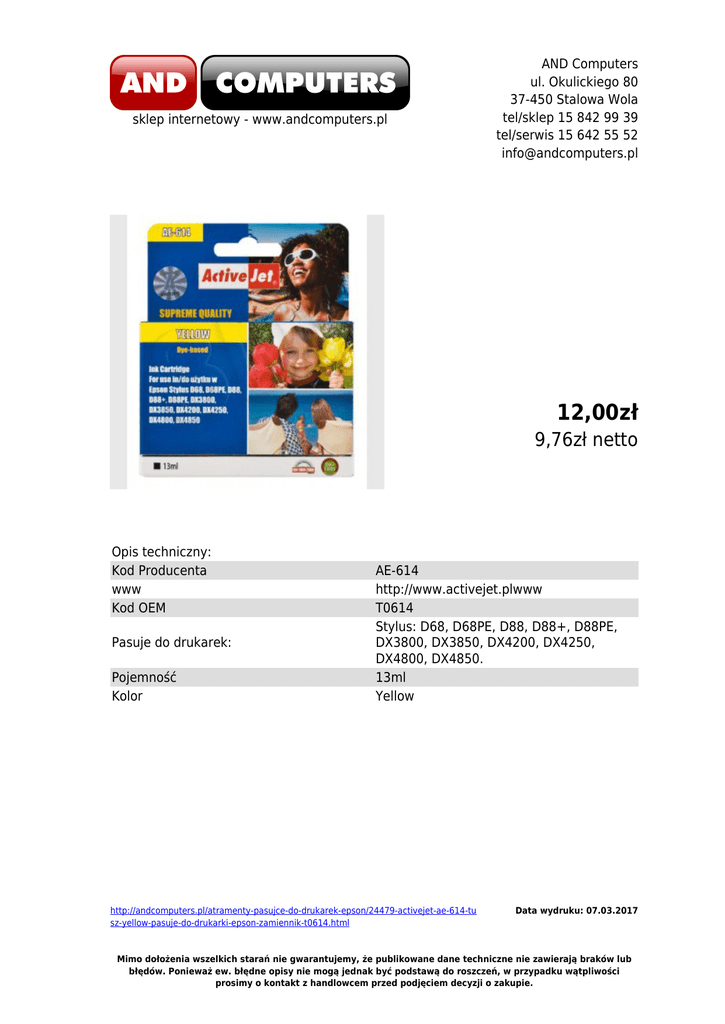 sklep internetowy - www.andcomputers.pl AND Computers ul. Okulickiego 80 37-450 Stalowa Wola tel/sklep 15 842 99 39 tel/serwis 15 642 55 52 [email protected] 12,00zł 9,76zł netto Opis techniczny: Kod Producenta www Kod OEM Pasuje do drukarek: Pojemność Kolor AE-614 http://www.activejet.plwww T0614 Stylus: D68, D68PE, D88, D88+, D88PE, DX3800, DX3850, DX4200, DX4250, DX4800, DX4850. 13ml Yellow http://andcomputers.pl/atramenty-pasujce-do-drukarek-epson/24479-activejet-ae-614-tu sz-yellow-pasuje-do-drukarki-epson-zamiennik-t0614.html Data wydruku: 07.03.2017 Mimo dołożenia wszelkich starań nie gwarantujemy, że publikowane dane techniczne nie zawierają braków lub błędów. Ponieważ ew. błędne opisy nie mogą jednak być podstawą do roszczeń, w przypadku wątpliwości prosimy o kontakt z handlowcem przed podjęciem decyzji o zakupie.