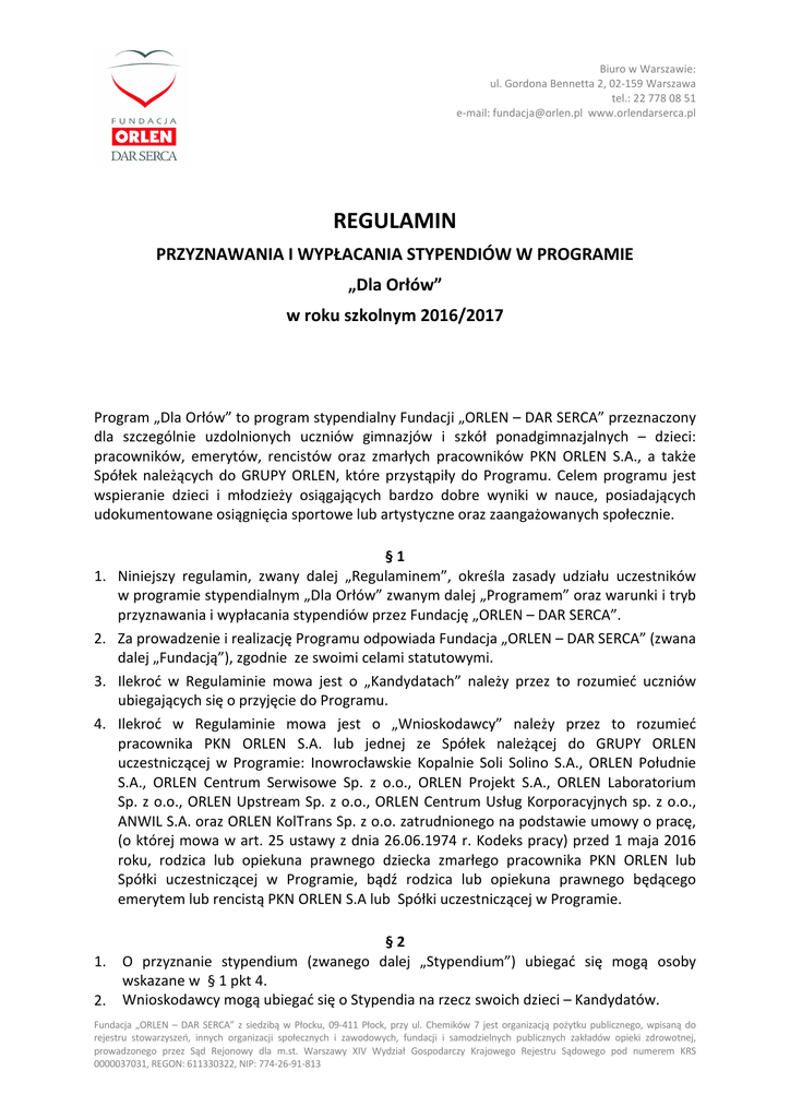 Biuro w Warszawie: ul. Gordona Bennetta 2, 02-159 Warszawa tel.: 22 778 08 51 e-mail: [email protected] www.orlendarserca.pl REGULAMIN PRZYZNAWANIA I WYPŁACANIA STYPENDIÓW W PROGRAMIE „Dla Orłów” w roku szkolnym 2016/2017 Program „Dla Orłów” to program stypendialny Fundacji „ORLEN – DAR SERCA” przeznaczony dla szczególnie uzdolnionych uczniów gimnazjów i szkół ponadgimnazjalnych – dzieci: pracowników, emerytów, rencistów oraz zmarłych pracowników PKN ORLEN S.A., a także Spółek należących do GRUPY ORLEN, które przystąpiły do Programu. Celem programu jest wspieranie dzieci i młodzieży osiągających bardzo dobre wyniki w nauce, posiadających udokumentowane osiągnięcia sportowe lub artystyczne oraz zaangażowanych społecznie. 1. 2. 3. 4. 1. 2. §1 Niniejszy regulamin, zwany dalej „Regulaminem”, określa zasady udziału uczestników w programie stypendialnym „Dla Orłów” zwanym dalej „Programem” oraz warunki i tryb przyznawania i wypłacania stypendiów przez Fundację „ORLEN – DAR SERCA”. Za prowadzenie i realizację Programu odpowiada Fundacja „ORLEN – DAR SERCA” (zwana dalej „Fundacją”), zgodnie ze swoimi celami statutowymi. Ilekroć w Regulaminie mowa jest o „Kandydatach” należy przez to rozumieć uczniów ubiegających się o przyjęcie do Programu. Ilekroć w Regulaminie mowa jest o „Wnioskodawcy” należy przez to rozumieć pracownika PKN ORLEN S.A. lub jednej ze Spółek należącej do GRUPY ORLEN uczestniczącej w Programie: Inowrocławskie Kopalnie Soli Solino S.A., ORLEN Południe S.A., ORLEN Centrum Serwisowe Sp. z o.o., ORLEN Projekt S.A., ORLEN Laboratorium Sp. z o.o., ORLEN Upstream Sp. z o.o., ORLEN Centrum Usług Korporacyjnych sp. z o.o., ANWIL S.A. oraz ORLEN KolTrans Sp. z o.o. zatrudnionego na podstawie umowy o pracę, (o której mowa w art. 25 ustawy z dnia 26.06.1974 r. Kodeks pracy) przed 1 maja 2016 roku, rodzica lub opiekuna prawnego dziecka zmarłego pracownika PKN ORLEN lub Spółki uczestniczącej w Programie, bądź rodzica lub opiekuna prawnego będącego emerytem lub rencistą PKN ORLEN S.A lub Spółki uczestniczącej w Programie. §2 O przyznanie stypendium (zwanego dalej „Stypendium”) ubiegać się mogą osoby wskazane w § 1 pkt 4. Wnioskodawcy mogą ubiegać się o Stypendia na rzecz swoich dzieci – Kandydatów. Fundacja „ORLEN – DAR SERCA” z siedzibą w Płocku, 09-411 Płock, przy ul. Chemików 7 jest organizacją pożytku publicznego, wpisaną do rejestru stowarzyszeń, innych organizacji społecznych i zawodowych, fundacji i samodzielnych publicznych zakładów opieki zdrowotnej, prowadzonego przez Sąd Rejonowy dla m.st. Warszawy XIV Wydział Gospodarczy Krajowego Rejestru Sądowego pod numerem KRS 0000037031, REGON: 611330322, NIP: 774-26-91-813 3. 4. 2. 3. Wnioskodawca może wnioskować o Stypendium na każde z dzieci, które spełnia kryteria określone Regulaminem. Wnioskowanie odbywa się wówczas osobno na każde dziecko. Kandydaci do Programu muszą spełniać następujące kryteria: a. być dziećmi (własnymi lub przysposobionymi) Wnioskodawców, bądź przebywać pod ich opieką na podstawie wyroku sądu rodzinnego, b. w roku szkolnym 2016/2017 być uczniami szkoły gimnazjalnej lub ponadgimnazjalnej, c. posiadać średnią ocen z przedmiotów na świadectwie z poprzedniego roku szkolnego minimum 4,7 lub wyższą, d. w roku przyznania stypendium nie ukończą 19 lat (w przypadku uczniów szkół ponadgimnazjalnych o trzyletnim programie nauki) lub 20 lat (w przypadku uczniów szkół ponadgimnazjalnych o czteroletnim programie nauki). e. zaprezentują we wniosku stypendialnym lokalną organizację pozarządową, która ich zdaniem zasługuje na wsparcie Fundacji "ORLEN – DAR SERCA". Kandydaci mogą również otrzymać punkty zgodnie z § 5 za: a. zaangażowanie w działania społeczne, b. posiadanie innych udokumentowanych szczególnych osiągnięć w dziedzinie kultury, sportu, nauki. Stypendium będzie wypłacane do końca trwania umowy stypendialnej, również w przypadku rozwiązania lub zakończenia umowy o pracę w PKN ORLEN S.A. przez Wnioskodawcę. Zarząd Fundacji określa wysokość Funduszu Stypendialnego na dany rok szkolny oraz liczbę osób, którym zostaną przyznane stypendia. §3 1. Wniosek o przyznanie stypendium w imieniu Kandydata składa rodzic lub opiekun prawny dziecka. 2. Wzór wniosku stanowi Załącznik nr 1 do Regulaminu. 3. Do wniosku należy dołączyć: a. kopię świadectwa z roku szkolnego 2015/2016 poświadczoną za zgodność z oryginałem przez szkołę, do której uczeń uczęszcza; b. w przypadku ucznia niepełnosprawnego – kopię orzeczenia o niepełnosprawności potwierdzoną za zgodność z oryginałem przez wystawcę dokumentu lub szkołę; c. kserokopię dowodu osobistego rodzica/opiekuna prawnego lub pełnoletniego ucznia; d. kopie dokumentów potwierdzających osiągnięcia dziecka (np. ze szkoły, klubu sportowego itp.) oraz poświadczających zaangażowanie w działania społeczne, potwierdzonych za zgodność z oryginałem przez wystawcę dokumentu (np. organizację pozarządową, stowarzyszenie itp. ) lub szkołę; e. oświadczenie o udzieleniu zgody na wykorzystanie wizerunku dziecka; f. oświadczenie o osiąganym dochodzie brutto na osobę z ostatnich 3 miesięcy oraz oświadczenie, że Wnioskodawca spełnia zapisy z § 1 pkt 4 Regulaminu (wzór oświadczeń stanowi Załącznik nr 2 do Regulaminu). 4. Wnioskodawcy ponoszą pełną odpowiedzialność prawną za prawdziwość danych podanych w dokumentach wymienionych w § 3 ust. 3 powyżej. Fundacja „ORLEN – DAR SERCA” z siedzibą w Płocku, 09-411 Płock, przy ul. Chemików 7 jest organizacją pożytku publicznego, wpisaną do rejestru stowarzyszeń, innych organizacji społecznych i zawodowych, fundacji i samodzielnych publicznych zakładów opieki zdrowotnej, prowadzonego przez Sąd Rejonowy dla m.st. Warszawy XIV Wydział Gospodarczy 