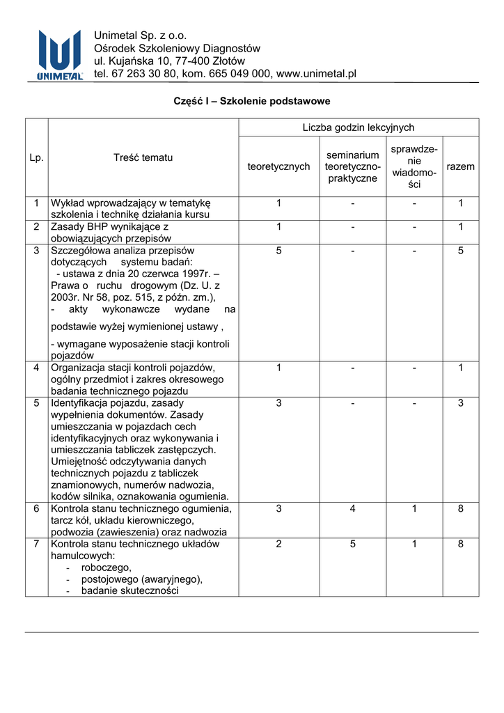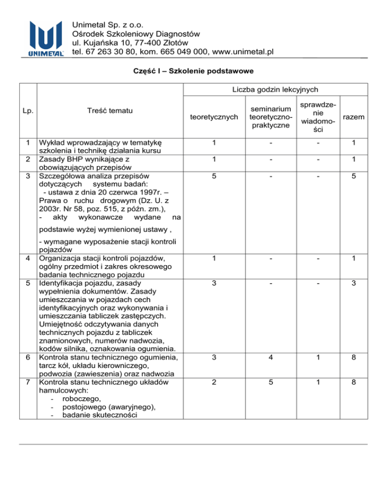 Unimetal Sp. z o.o. Ośrodek Szkoleniowy Diagnostów ul. Kujańska 10, 77-400 Złotów tel. 67 263 30 80, kom. 665 049 000, www.unimetal.pl Część I – Szkolenie podstawowe Liczba godzin lekcyjnych Lp. Treść tematu 1 Wykład wprowadzający w tematykę szkolenia i technikę działania kursu Zasady BHP wynikające z obowiązujących przepisów Szczegółowa analiza przepisów dotyczących systemu badań: - ustawa z dnia 20 czerwca 1997r. – Prawa o ruchu drogowym (Dz. U. z 2003r. Nr 58, poz. 515, z późn. zm.), - akty wykonawcze wydane na 2 3 sprawdzenie razem wiadomości teoretycznych seminarium teoretycznopraktyczne 1 - - 1 1 - - 1 5 - - 5 1 - - 1 3 - - 3 3 4 1 8 2 5 1 8 podstawie wyżej wymienionej ustawy , 4 5 6 7 - wymagane wyposażenie stacji kontroli pojazdów Organizacja stacji kontroli pojazdów, ogólny przedmiot i zakres okresowego badania technicznego pojazdu Identyfikacja pojazdu, zasady wypełnienia dokumentów. Zasady umieszczania w pojazdach cech identyfikacyjnych oraz wykonywania i umieszczania tabliczek zastępczych. Umiejętność odczytywania danych technicznych pojazdu z tabliczek znamionowych, numerów nadwozia, kodów silnika, oznakowania ogumienia. Kontrola stanu technicznego ogumienia, tarcz kół, układu kierowniczego, podwozia (zawieszenia) oraz nadwozia Kontrola stanu technicznego układów hamulcowych: - roboczego, - postojowego (awaryjnego), - badanie skuteczności Unimetal Sp. z o.o. Ośrodek Szkoleniowy Diagnostów ul. Kujańska 10, 77-400 Złotów tel. 67 263 30 80, kom. 665 049 000, www.unimetal.pl 8 Kontrola i ocena prawidłowości działania świateł: - mijania, - drogowych, - przeciwmgielnych, - cofania. Zasady kontroli prawidłowości ustawienia świateł 2 2 1 5 Kontrola prawidłowości działania świateł sygnalizacyjnych oraz pozostałego osprzętu elektrycznego 10 Kontrola i ocena działania elementów związanych z ochroną środowiska: - emisja spalin, - hałas 11 Badanie dodatkowe taksówki, pojazdu uprzywilejowanego, pojazdu przystosowanego do nauki jazdy i do przeprowadzania egzaminu państwowego 12 Badanie pojazdu zabytkowego 4 3 1 8 2 5 1 8 1 - - 1 1 - - 1 - - 2 2 1 1 - 2 27 20 7 54 9 13 Sprawdzenie wiadomości z zakresu przeprowadzonego szkolenia w części teoretycznej i praktycznej 14 Wykład podsumowujący wyniki szkolenia i analizujący popełniane przez kursantów błędy, pokazy RAZEM