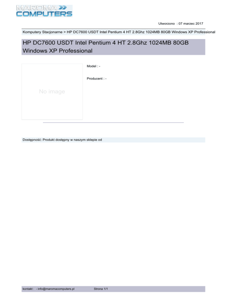 Utworzono : 07 marzec 2017 Komputery Stacjonarne > HP DC7600 USDT Intel Pentium 4 HT 2.8Ghz 1024MB 80GB Windows XP Professional HP DC7600 USDT Intel Pentium 4 HT 2.8Ghz 1024MB 80GB Windows XP Professional Model : - s r te Producent : - No image C a Dostępność: Produkt dostępny w naszym sklepie od m ro a M kontakt : - [email protected] Strona 1/1 m o u p