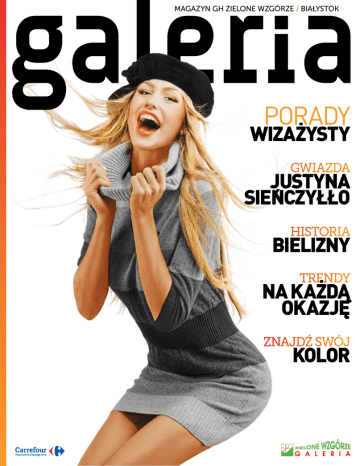 magazyn gH ZIELONE WZGÓRZE / BIAŁYSTOK porady wizażysty gwiazda justyna sieNczyłło historia bielizny trendy na każdą okazję znajdŹ swóJ KOLOR GASPERTIN x 50 kapsułek (8,98 zł) Skład: symetykon 40 mg Wskazania: niestrawność, wzdęcia, uczucie pełności Podmiot odpowiedzialny: Teva Kutno SA MAXFLU x 10 tabletek musujących (8,98 zł) Skład: paracetamol 500 mg, pseudoefedryna 30 mg kwas askorbowy 60 mg Wskazania: przeciw objawom przeziębienia i grypy Podmiot odpowiedzialny: Pliva Kraków HEPATIL x 40 tabletek (9,98 zł) Skład: L-asparaginian L-ornityny 150 mg Wskazania: wspomaganie prawidłowej pracy wątroby Podmiot odpowiedzialny: Pliva Kraków VIBOVIT ZOOŻELKI x 50 sztuk (19,98 zł) Skład: witaminy i minerały od 4. roku życia Wskazania: uzupełnienie diety obniżona odporność Podmiot odpowiedzialny: Teva Kutno SA Przed użyciem zapoznaj się z ulotką, która zawiera wskazania, przeciwwskazania, dane dotyczące działań niepożądanych i dawkowanie oraz informacje dotyczące stosowania produktu leczniczego, bądź skonsultuj się z lekarzem lub farmaceutą, gdyż każdy lek niewłaściwie stosowany zagraża Twojemu życiu lub zdrowiu. imprezy NOWE LOKALE „Zatańcz w Galerii” – warsztaty taneczne z Iwoną Pavlović. 13 marca Galerię Zielone Wzgórze odwiedziła wielokrotna mistrzyni Polski w tańcach latynoamerykańskich i standardowych, trenerka wielu par tanecznych i jurorka popularnego programu telewizyjnego „Taniec z Gwiazdami” – Iwona Pavlović. „Czarna Mamba” – taki pseudonim artystka otrzymała w „Tańcu z Gwiazdami” – uczyła klientów różnych stylów tańca, pozowała do zdjęć, rozdawała autografy w niezwykłej scenerii, bo przy gigantycznym bucie, a także zdradziła kilka swoich tajemnic w wywiadach przeprowadzonych przez Pawła Pawleca. On także prowadził konkursy dla klientów z wieloma atrakcyjnymi nagrodami. Otwarcie dwóch nowych butików: KWIACIARNIA „Forsycja”, SKLEP Z ODZIEŻĄ „Vertus” • • • • • • • Zapraszamy Państwa do nowo otwartego lokalu „Expression” portfele, wizytowniki, teczki konferencyjne, kosmetyczki, etui i inne drobne wyroby skórzane rękawiczki w szerokim wachlarzu wzorów i kolorów wysokiej jakości szale jesienne, zimowe i wizytowe, etole i poncza czapki, kapelusze parasole szeroki wybór pasmanterii i włóczek wszystko niezbędne do haftu Strzelaj gole w Galerii! 11 września w Galerii Zielone Wzgórze miały miejsce niezwykłe warsztaty sportowe z Gwiazdą polskiego futbolu Radosławem Majdanem! Słynny piłkarz nie tylko odpowiadał na pytania gości, ale również opowiedział, jak to jest być bramkarzem, zawodnikiem reprezentacji Polski oraz dyrektorem czołowego klubu piłkarskiego. Uczestnicy warsztatów dowiedzieli się, jak trenować w sposób właściwy dla zdrowia, a także jakie ćwiczenia należy wykonywać, by móc szczycić się doskonałą wytrzymałością. Ponadto gość udzielał wskazówek, jak skutecznie obronić każdy strzał. Były zdjęcia z gwiazdą, autografy i liczne konkursy z atrakcyjnymi nagrodami dla klientów. WIELKA LOTERIA Startujemy 24.10. Wielka loteria urodzinowa – do wygrania m.in. Peugeot 206! Spotkaj się z Bestią – w czerwcu klienci Galerii Zielone Wzgórze mieli okazję przeżyć ekscytującą wizytę we wnętrzu hollywoodzkiego potwora. Projekt i opracowanie POLA design; zdjęcia packshotowe i aranżacyjne Ania Denis; Informacje zawarte w niniejszym wydawnictwie mają charakter reklamowy i nie stanowią oferty w rozumieniu przepisów prawa cywilnego. Białystok 1 Galeria Zielone Wzgórze WYWIAD Białystok noszę w sobie Justyna Sieńczyłło podkreśla, że wszystko, co osiągnęła w życiu, zawdzięcza wartościom, które kultywuje się na Białostocczyźnie. z tzw. podwórka na tym nie ucierpiały. Niestety, ta forma kontaktu jest coraz rzadsza. Teraz znajomości przeniosły się do wirtualnej rzeczywistości. Staram się wytłumaczyć synom, że zabawa, rozmowy z rówieśnikami dostarczają wspaniałych emocji, prawdziwych. To ludzie, nasze spotkania z nimi znaczą najwięcej, wnoszą najciekawsze rzeczy. Takich osób było w moim życiu wiele. Wśród nich wyjątkowe miejsce zajmuje Antonina Sokołowska, która prowadziła teatr Klaps. To ona zaraziła mnie pasją do literatury i teatru. To dzięki niej zdawałam do szkoły teatralnej. Jakie uczucia pani towarzyszą, gdy myśli pani o Białymstoku? Jestem bardzo związana emocjonalnie z Białymstokiem. To nadal jest mój drugi dom. Które miejsca lubi pani najbardziej? Białystok jest pełen takich miejsc, które darzę sentymentem. Na pewno park i pałac Branickich, słynne praczki przy maleńkim stawiku, okolice Białki. Te rejony oczywiście dziś wyglądają inaczej. Tam, gdzie zrywaliśmy jabłka czy urządzaliśmy podchody, stoi galeria handlowa. Ale niezależnie od zmieniającej się rzeczywistości te wspomnienia cały czas noszę w sobie. Jaka atmosfera panowała w pani domu? Można powiedzieć, że jedną nogą jestem tu, drugą tam. Pozostałam Białostocczanką a jednocześnie wrosłam w Warszawę. Ale teatr „Kamienica”, który stworzyłam z mężem, ma w sobie ducha wschodniego. W naszym teatrze pracują aktorzy i reżyserzy z Białegostoku, tamtejsi artyści pokazują swoje prace. Był to dom, w którym we wszystko angażowało się dzieci. Nie było spraw, które się przed nimi ukrywało. W naszej kuchni wciąż toczyły się rozmowy o problemach bliższych i dalszych krewnych oraz znajomych. Można powiedzieć, że odbywała się tam wieczna psychoanaliza i pewnego rodzaju psychoterapia. Życia uczyłam się, słuchając rozmów dorosłych. Myślę, że uchroniło mnie to przed wieloma błędami. Jak wyglądało pani dzieciństwo? Czy tak samo wychowuje pani swoje dzieci? Było bardzo szczęśliwe, choć pracowite. Chodziłam jednocześnie do kilku szkół – normalnej podstawowej, muzycznej i baletowej. Dzięki temu, że miałam tyle zaję
