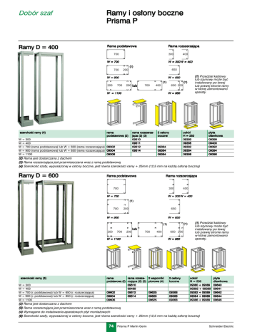 Ramy D = 400 Rama podstawowa E55127 Ramy i os∏ony boczne Prisma P 045731d Dobór szaf Rama rozszerzajàca 300 700 W = 700 400 W = 300 W = 400 (1) 700 650 200 W = 900 200 700 (1) Przedzia∏ kablowy lub szynowy mo˝e byç instalowany po lewej lub prawej stronie ramy w której zamontowano aparaty. W = 650 (1) 200 lub 700 (1) 650 200 400 W = 1100 E55128 W = 850 szerokoÊç ramy (4) rama podstawowa (2) rama rozszerzajàca (2) (3) 09310 09311 09312 09314 W = 300 W = 400 W = 700 (rama podstawowa) lub W = 650 (rama rozszerzajàca) 09302 W = 900 (rama podstawowa) lub W = 850 (rama rozszerzajàca) 09304 09306 W = 1100 2 os∏ony boczne cokó∏ H = 250 09380 09385 09382 09384 09386 09364 09364 09364 p∏yta d∏awikowa 09399 09400 09392 09394 09396 (2) Rama jest dostarczana z dachem (3) Rama rozszerzajàca jest przemieszczana wraz z ramà podstawowà (4) SzerokoÊç szafy, wyposa˝onej w os∏ony boczne, jest równa szerokoÊci ramy + 25mm (12,5 mm na ka˝dà os∏on´ bocznà) Ramy D = 600 Rama rozszerzajàca 048754d E55129 Rama podstawowa 700 300 W = 700 400 W = 300 W = 400 (1) 700 650 200 W = 900 W = 650 (1) (1) 200 700 200 lub 700 400 W = 850 E55130 W = 1100 650 200 (1) Przedzia∏ kablowy lub szynowy mo˝e byç instalowany po lewej lub prawej stronie ramy w której zamontowano aparaty. szerokoÊç ramy (5) W = 300 W = 400 W = 700 (r. podstawowa) lub W = 650 (r. rozszerzajàca) W = 900 (r. podstawowa) lub W = 850 (r. rozszerzajàca) W = 1100 rama rama rozszepodstawowa (2) rzajàca (2) (3) 09610 09499 09602 09612 09604 09614 09606 2 wsporniki pionowe (4) 2 os∏ony boczne 09625 09625 09625 09368 09368 09368 cokó∏ H = 250 09380 + 09389 09385 + 09389 09382 + 09389 09384 + 09389 09386 + 09389 p∏yta d∏awikowa 09640 09641 09642 09644 09646 (2) Rama jest dostarczana z dachem (3) Rama rozszerzajàca jest przemieszczana wraz z ramà podstawowà (4) Wymagane do instalowania aparatowych p∏yt monta˝owych (5) SzerokoÊç szafy, wyposa˝onej w os∏ony boczne, jest równa szerokoÊci ramy + 25mm (12,5 mm na ka˝dà os∏on´ bocznà) 74 Prisma P Merlin Gerin Schneider Electric G∏´bokoÊç 800 lub 1000 mm jest osiàgalna przez zestawienie ty∏ami ramy podstawowej lub rozszerzajàcej o dowolnej szerokoÊci. W przypadku zestawiania szaf ty∏ami, stosuje si´ dzielone os∏ony tylne. Np. dla ramy o g∏. 1000 mm pokrycie boków sk∏ada si´ z czterech cz´Êci do zamówienia: 1/2 os∏ony A 400, 1/2 os∏ony B 400, 1/2 os∏ony C 600, 1/2 os∏ony D 600, tzn. 4 cz´Êci do zamówienia Dobór os∏ony bocznej nie jest zale˝ny od szerokoÊci pola. Os∏ony boczne opis nr kat. 11685d Ramy zestawione ty∏ami 09632 09633 09634 09635 1/2 os∏ony A (400) 1/2 os∏ony B (400) 1/2 os∏ony C (600) 1/2 os∏ony D (600) B B A D = 800 Ramy zestawione bokami A B D C E11972C(MGA+BT) A E11972B(MGA+BT) E11972A(MGA+BT) Uwaga: SzerokoÊç szafy, wyposa˝onej w os∏ony boczne, jest równa szerokoÊci ramy +25 mm (12,5 mm na ka˝dà os∏on´ bocznà) C D B A D = 1000 E11932A(MGA+BT) do ram podstawowych nr kat. 09370 09371 g∏´bokoÊç 400 i 800 g∏´bokoÊç 600 i 1000 ¸àczàc ram´ podstawowà i i rozszerzajàcà nie potrzebny jest zestaw ∏àczeniowy. W tym przypadku szafy nie mogà byç transportowane osobno. Os∏ony boczne: Patrz obok lub powy˝ej, w zale˝noÊci od g∏´bokoÊci ramy. E11932B(MGA+BT) 11686d Dwie ramy o tej samej g∏´bokoÊci - mogà byç ∏àczone razem przy u˝yciu zestawu ∏àczeniowego. Zestaw ∏àczeniowy opis + Dwie ramy podstawowe + Jedna rama podstawowa i jedna rozszerzajàca Dwie ramy podstawowe o ró˝nych g∏´bokoÊciach - mogà byç ∏àczone razem przy u˝yciu zestawu ∏àczeniowego. Zestaw ∏àczeniowy opis 048753d Dwie ramy podstawowe szerokoÊci 900 mm ustawione obok siebie nr kat. D = 400 + D = 800 D = 600 + D = 1000 09370 09371 Os∏ony boczne opis nr kat. 1/2 os∏ony A (400) 1/2 os∏ony B (400) 1/2 os∏ony C (600) 1/2 os∏ony D (600) os∏ona koƒcowa E (400) os∏ona koƒcowa F (600) 09632 09633 09634 09635 09630 09631 Rama podstawowa szerokoÊci 900 mm i rama rozszerzajàca o szerokoÊci 300 mm zestawione bokami. E11932C(MGA+BT) Uwaga: ■ Maksymalny stopieƒ ochrony IP31; ■ SzerokoÊç szafy, wyposa˝onej w os∏ony boczne, jest równa szerokoÊci ramy + 25 mm (12,5 mm na ka˝dà os∏on´ bocznà). B A B E B A F D E37035(MGA)/E12851(BT) B C F D C D A B A Uchwyty transportowe A E E E A B C opis nr kat. 2 uchwyty transportowe do ramy D = 400 4 uchwyty transportowe do ramy D = 600, 800, 1000 03101 75 Prisma P Merlin Gerin 2 x 03101 Schneider Electric Dobór szaf Os∏ony czo∏owe i tylne w szafach Prisma P Stopieƒ ochrony Stopieƒ ochrony szaf Prisma P zale˝y od doboru os∏on czo∏owych i tylnych. IP20/IK08: szafa ze sta∏à lub ruchomà ramà wsporczà os∏on czo∏owych. IP30/IK08: szafa z pionowymi wspornikami os∏on czo∏owych + drzwi przezroczyste lub pe∏ne. IP31/IK08: szafa IP30 + uszczelka 09372 (wystarczy zamówiç 1 na ram´) IP54/IK08: szafa IP30 + zestaw uszczelek + p∏yta d∏awikowa ( z wyjàtkiem drzwi z wyci´ciami do przedzia∏u rozszerzajàcego 09326 i 09330 09330). Zestaw uszczelek IP54 wymiary ramy (w mm) W= D = 400 D = 600 to 1000 700 09374 09378 900 09374 09378 1100 09377 09378 Uwaga: ■ dobór os∏on przednich lub tylnich jest niezale˝ny od g∏´bokoÊci szafy ■ drzwi przedzia∏u aparatowego i rozszerzajàcego wyposa˝ane sà w ràczk´ z zamkiem i dwa klucze 405 ■ je˝eli chcemy zachowaç za∏o˝one IP, w przypadku gdy do rozdzielnicy kable sà wprowadzone od do∏u, nale˝y zastosowaç p∏yt´ d∏awikowà. Mo˝liwe zestawienia dla ró˝nych ram podstawowych i rozszerzajàcych. Rama podstawowa Rozszerzenia szer. 700 mm 300 700 400 650 650 200 szer. 900 mm 700 200 700 200 900 900 300 400 Szafa z ruchomà ramà wsporczà os∏on czo∏owych. 900 650 900 650 200 szer. 1100 mm 1100 700 1100 200 200 Szafa z pionowymi wspornikami os∏on czo∏owych + drzwi przezroczyste. 300 400 700 700 400 200 1100 6
