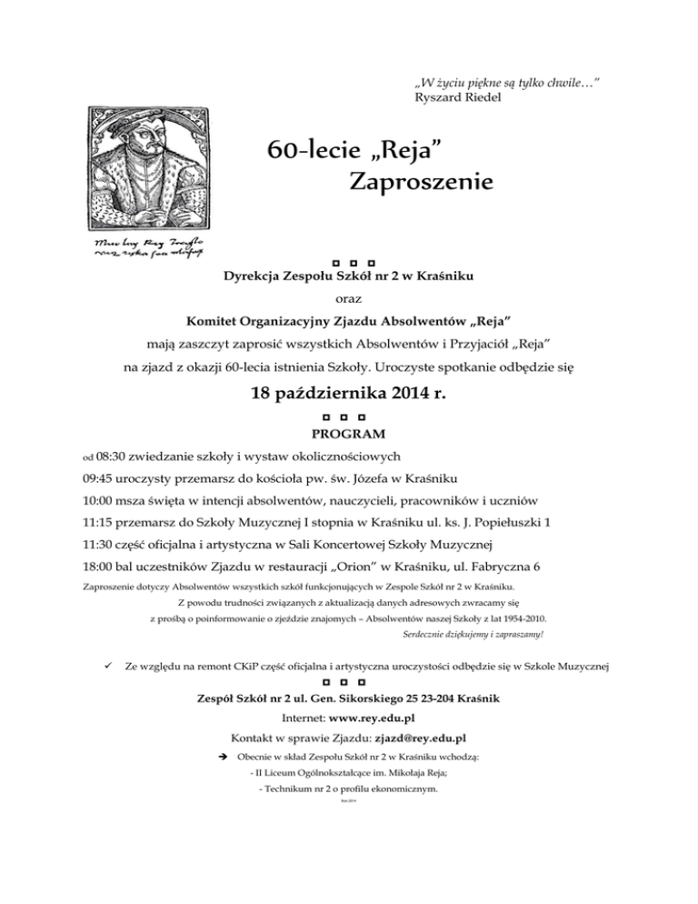 60-lecie „Reja” Zaproszenie - Zespół Szkół Nr 2 w Kraśniku