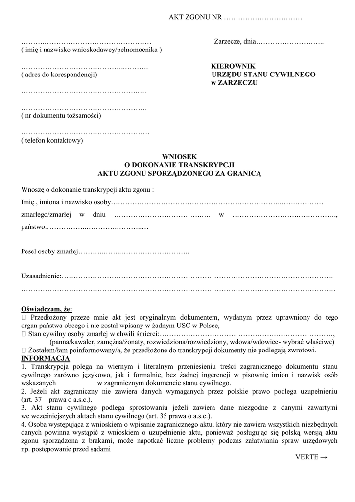 AKT ZGONU NR …………………………… ……….……………………………………… ( imię i nazwisko wnioskodawcy/pełnomocnika ) ……………………………………..………. ( adres do korespondencji) Zarzecze, dnia……………………….. KIEROWNIK URZĘDU STANU CYWILNEGO w ZARZECZU ………………………………………….…. …………………………………………….. ( nr dokumentu tożsamości) ……………………………………………… ( telefon kontaktowy) WNIOSEK O DOKONANIE TRANSKRYPCJI AKTU ZGONU SPORZĄDZONEGO ZA GRANICĄ Wnoszę o dokonanie transkrypcji aktu zgonu : Imię , imiona i nazwisko osoby……………………………………………………………..…….………… zmarłego/zmarłej w dniu ……………………………….…. w ……………………….……………., państwo:……………..………….………..… Pesel osoby zmarłej………..……..……………………….. Uzasadnienie:…………………………………………………………………………………………………… …………………………………………………………………………………………………………………… Oświadczam, że: organ państwa obcego i nie został wpisany w żadnym USC w Polsce, (panna/kawaler, zamężna/żonaty, rozwiedziona/rozwiedziony, wdowa/wdowiec- wybrać właściwe) e podlegają zwrotowi. INFORMACJA 1. Transkrypcja polega na wiernym i literalnym przeniesieniu treści zagranicznego dokumentu stanu cywilnego zarówno językowo, jak i formalnie, bez żadnej ingerencji w pisownię imion i nazwisk osób wskazanych w zagranicznym dokumencie stanu cywilnego. 2. Jeżeli akt zagraniczny nie zawiera danych wymaganych przez polskie prawo podlega uzupełnieniu (art. 37 prawa o a.s.c.). 3. Akt stanu cywilnego podlega sprostowaniu jeżeli zawiera dane niezgodne z danymi zawartymi we wcześniejszych aktach stanu cywilnego (art. 35 prawa o a.s.c.). 4. Osoba występująca z wnioskiem o wpisanie zagranicznego aktu, który nie zawiera wszystkich niezbędnych danych powinna wystąpić z wnioskiem o uzupełnienie aktu, ponieważ posługując się polską wersją aktu zgonu sporządzona z brakami, może napotkać liczne problemy podczas załatwiania spraw urzędowych np. postępowanie przed sądami VERTE → □ Wnoszę / □ Nie wnoszę o uzupełnienie aktu zgonu o brakujące dane na podstawie aktu stanu cywilnego stwierdzającego zdarzenie wcześniejsze tj. aktu ………………………….…………. nr ………………………………, aktu ………………………………………… nr…………………..………… □ Wnoszę/ □ Nie wnoszę o sprostowanie aktu zgonu poprzez zastąpienie błędnie wpisanego …………………………………………………………………………………………………………………… …………………………………………………………………………………………………………………… …………………………………………………………………………………………………………………… na podstawie aktu stanu cywilnego stwierdzającego zdarzenie wcześniejsze tj. aktu…………………………… nr ……………………………………………………….. W załączeniu: 1. Oryginał aktu zgonu 2. Tłumaczenie aktu zgonu dokonane przez tłumacza przysięgłego 3. Pełnomocnictwo* …….……………………..…………. (czytelny podpis) Na podst. art. 4 i 8 ust.1 ustawy z dnia 16.11.2006r. o opłacie skarbowej (j.t. Dz. U. 2012.1282 ze zm.) opłatę skarbową w kwocie ……….. zł zł zapłacono w dniu………………………… na konto UG Zarzecze Nr 27 9106000820020000 07940002 POTWIERDZAM ODBIÓR ODPISU ZUPEŁNEGO AKTU ZGONU …………………………………………………………… ( data i czytelny podpis)