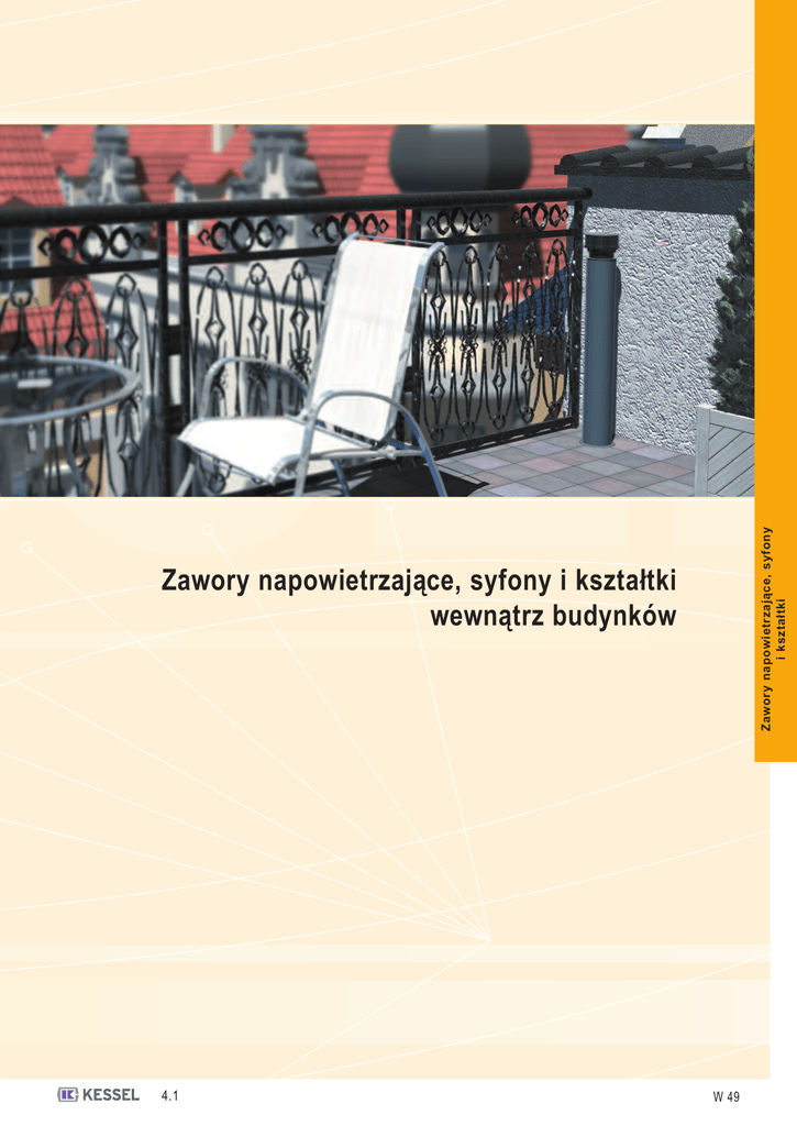 Zawory napowietrzające, syfony i kształtki Zawory napowietrzające, syfony i kształtki wewnątrz budynków 4.1 W 49 Syfon napowietrzający z przewodem przyłączeniowym Ø 32 / Ø 44 mm KESSEL - Zalety wyrównuje podciśnienie w systemie kanalizacyjnym zapobiega zasysaniu powietrza przez syfon chroni przed nieprzyjemnymi zapachami w mieszkaniu stanowi szybkie rozwiązanie problemu w przypadku efektu zasysania usuwa odgłosy zasysania Produkt Opis produktu Wielk. nom. Nr art. Ø 32 Ø 40 49 090 003 49 090 004 Szt./ kart. /pal. Syfon napowietrzający KESSEL Syfon napowietrzający KESSEL jest syfonem ze zintegrowanym zaworem napowietrzającym z tworzywa sztucznego (ABS). Powierzchnia jest galwanicznie chromowana. Syfon posiada typowe przyłącza w wielkościach 32 mm i 40 mm do podłączenia do przewodu w ścianie Syfon napowietrzający KESSEL do umywalek ze zintegrowanym zaworem napowietrzającym (strumień objętości powietrza 1,5 l), jako syfon z przegrodą zanurzoną, z rurą dopływową i nakrętką złączkową, rozetą króćca odpływowego i zestawem uszczelniającym, chromowany, 15,2 Ø 32,0 22,0 14,5 według EN 1329-1, EN 1451-1, EN 4514 i EN 12056-1. Ø 52,8 22,0 Ø 40,0 Ø 32,0 230,0 147,2 132,0 Syfon napowietrzający łatwy montaż 81,6 105,6 226,7 332,2 W 50 4.1 - Filtr w węglem aktywnym / zawory napowietrzające / kształtki Produkt Wielk. nom. Nr art. Szt./ kart. /pal. DN 70/100 915 600 - - 915 602 - - 915 601 - - 49 090 001 10 - 49 090 002 10 Kolanko HTK z PP KESSEL DN 50 63 050 25/900 DIN 4102-B1 DN 70 63 070 25/300 Trudno palne. DN 100 63 100 25/200 Opis produktu Filtr z węglem aktywnym KESSEL 122,24 mm z tworzywa sztucznego (ABS), z wymiennym wkładem z węglem aktywnym. 132,15 mm Eliminuje niepożądane zapachy z urządzeń instalacji sanitarnych w budyn-kach prywatnych i publicznych takich jak: przydomowe oczyszczalnie ścieków, separatory tłuszczu i przepompownie. Ø 88,59 mm Ø 83,03 mm Pokrywa aluminiowa KESSEL Osprzęt z kołpakiem izolacyjnym ze styropianu pasuje do filtrów z węglem aktywnym KESSEL Wkład filtra z węglem aktywnym KESSEL Część zamienna wkład wymienny do filtrów z węglem aktywnym Zawór napowietrzający Mini-Vent TM x66 68 Zawór napowietrzający do urządzeń kanalizacyjnych Z przejściem przyłączeniowym i pokrywą izolacyjną z polistyrenu Z kratką zabezpieczającą przed robactwem pasuje do przewodów rurowych DN 32, DN 40, DN 50 i 11/2” DN 32 DN 40 11/2 " DN 50 Zawór napowietrzający według PN EN 12380 Klasa AI Zawór napowietrzający Maxi-Vent TM 51 135 x125 DN 70 DN 100 Zawór napowietrzający do urządzeń kanalizacyjnych, nadaje się do pionów kanalizacyjnych i przewodów kolektorowych Z przejściem przyłączeniowym i pokrywą izolacyjną z polistyrenu Z kratką zabezpieczającą przed robactwem pasuje do przewodów rurowych DN 70 i DN 100 Zawór napowietrzający według PN EN 12380 Klasa AI Możliwość płynnej regulacji w zakresie 0-87°. Z pierścieniem uszczelniającym, zgodnie z DIN 19560. 4.1 W 51 Zawory napowietrzające, filtr z węglem aktywnym, kształtki HTK KESSEL (nr art. 915 600) Części zamienne / kratki System 100 / 125 Produkt Wielk. nom. Nr art. Szt./ kart. /pal. Kratka ze wzorem owalu - 27 153 10/- Kratka ze wzorem szczelinowym - 27 152 10/- - 27 154 10/- - 60 101 s 10/- ze stali nierdzewnej 1.4301, przykręcana pasuje do nasadek System 100 27 191, System 125 48 950 - 27 155 10/- Ruszt kratowy - 142-101 10/- - 219-027 10/- ze stali nierdzewnej 1.4301, przykręcana, przeciwpoślizgowa pasuje do nasadek System 100 27 176, 47 902 System 125 48 951, 48 963 - 219-249 10/- Kratka szczelinowa 100 x 100 mm, klasa K3 - 27 150 10/- - 27 151 10/- - 27 156 10/- - 47 102 10/- - 47 100 47 200 10/10/- - 27 169 1/- Opis produktu 120 x 120 mm, klasa L15 119 10 4 120 x 120 mm, klasa L15 ze stali nierdzewnej 1.4301, z systemem Lock & Lift KESSEL, zamykana pasuje do nasadek System 100 27 201, 27 202, 47 904, 47 905 System 125 48 201, 48 202, 48 904, 48 905 Kratka szczelinowa 138 x 138 mm, klasa K3 ze stali nierdzewnej 1.4301 z tworzywa sztucznego, czarna pasuje do nasadek System 100 27 193 138 25 138 x 138 mm, klasa L15 / M125 ze stali nierdzewnej 1.4301 pasuje do nasadki 48 177, 27 177 Kratka szczelinowa Części zapasowe / ruszty 138 x 138 mm, klasa L15 ze stali nierdzewnej 1.4301, przykręcana pasuje do nasadek System 100 27 196, 47 902 System 125 48 951, 48 963 ze stali nierdzewnej 1.4301 pasuje do nasadek System 100 27 165 Kratka szczelinowa 95 x 95 mm, klasa K3 ze stali nierdzewnej 1.4301 pasuje tylko do nasadki do uszczelnień płynnymi masami izolacyjnymi Variofix System 100 47 901 Kratka szczelinowa Ø 120 mm, klasa K3 z tworzywa sztucznego pasuje do nasadek do wykładzin podłogowych System 100 27 192 Syfon nr art. 47 200 z tworzywa sztucznego pasuje do wpustu łazienkowego „Der Superflache“ pasuje do wpustu łazienkowego Classic 25 mm wysokość zamknięcia wodnego 50 mm wysokość zamknięcia wodnego Syfon dzwonowy z tworzywa sztucznego 50 mm wysokość zamknięcia wodnego W 52 4.1
